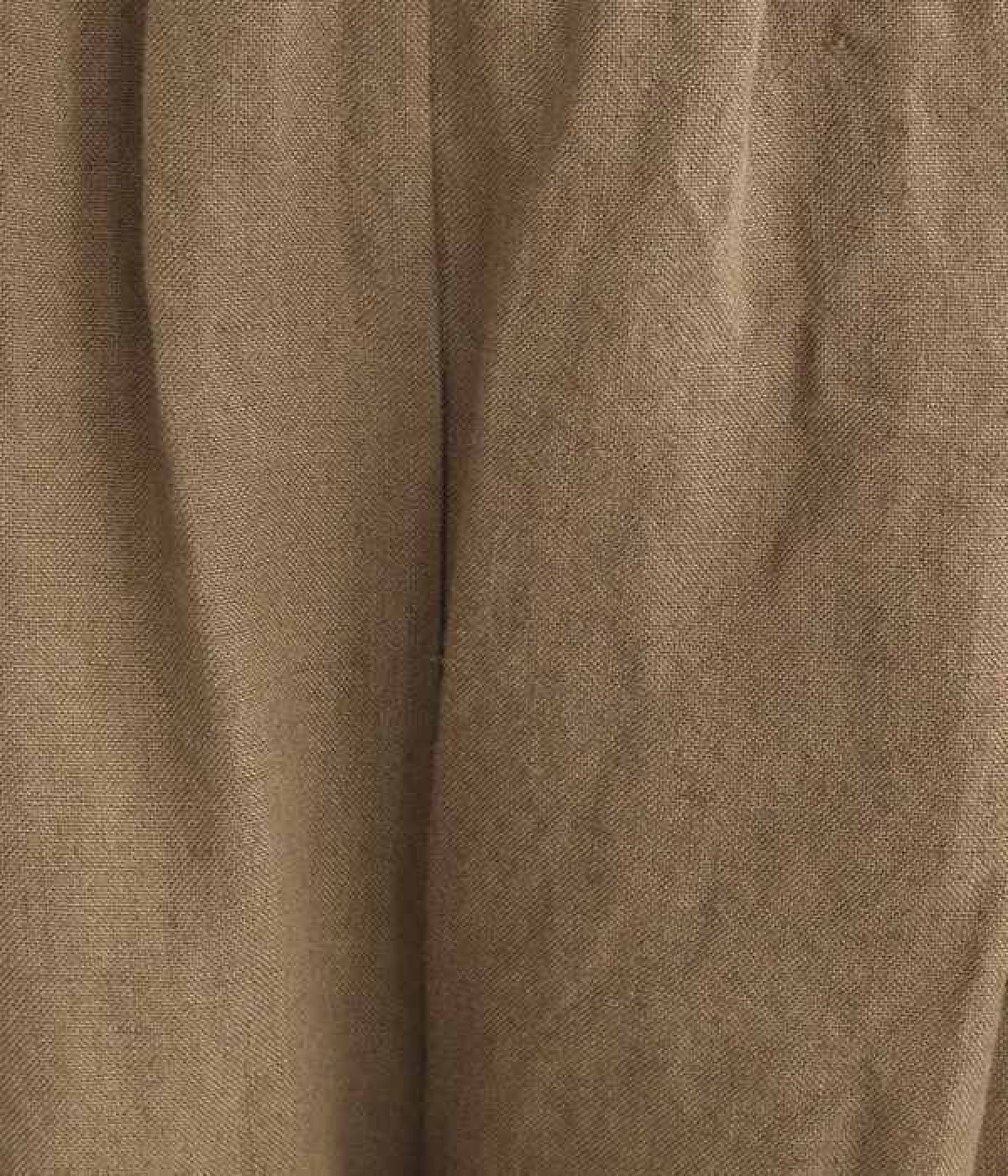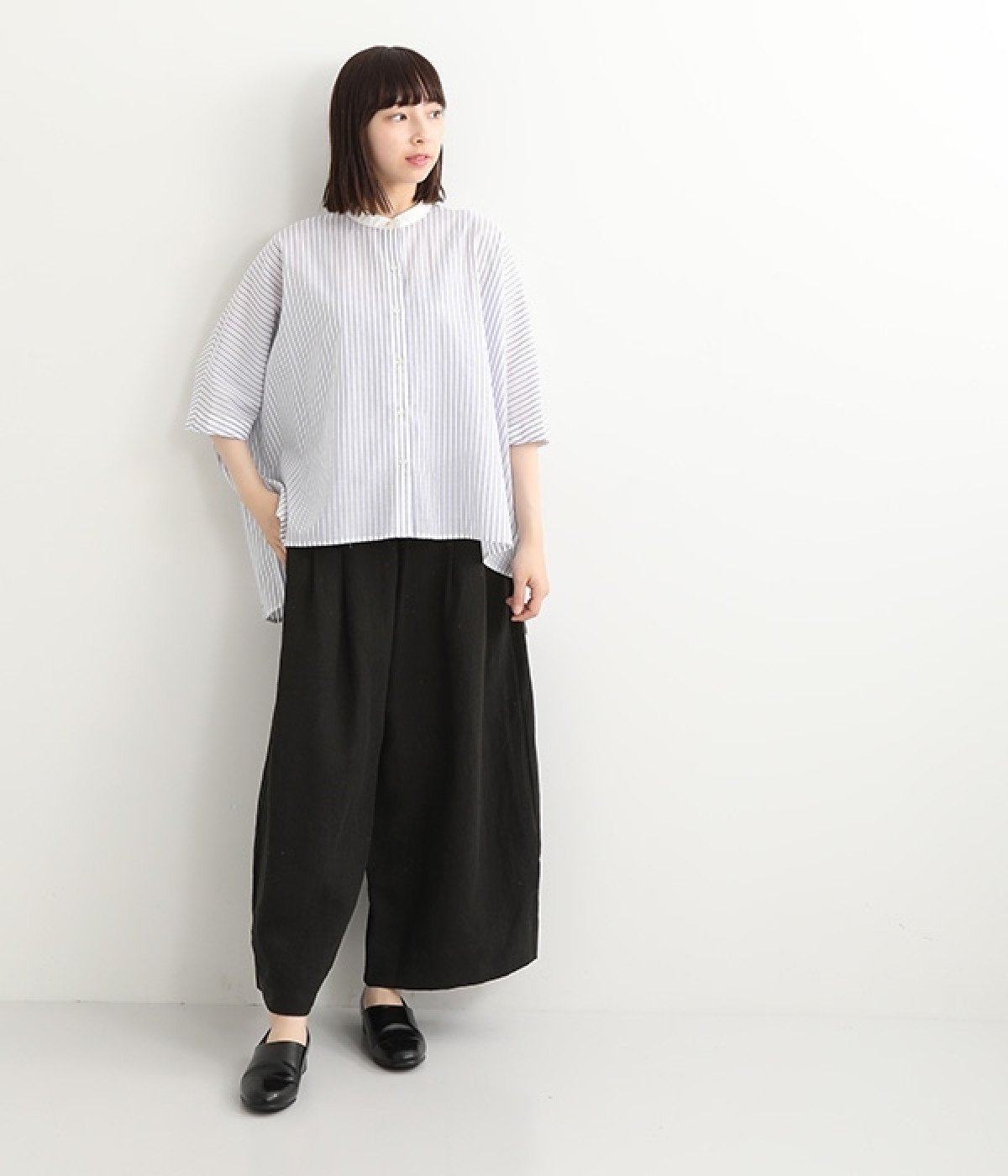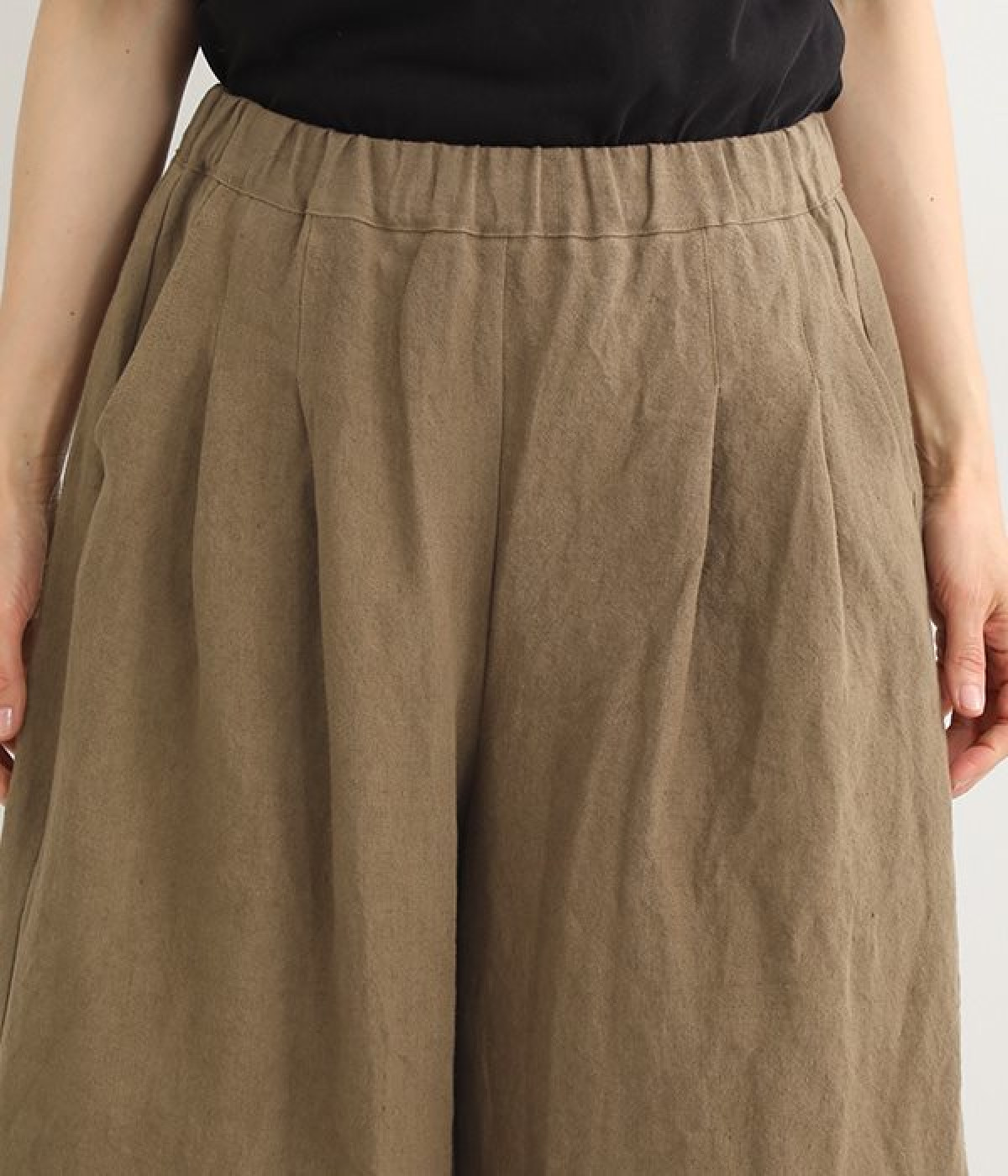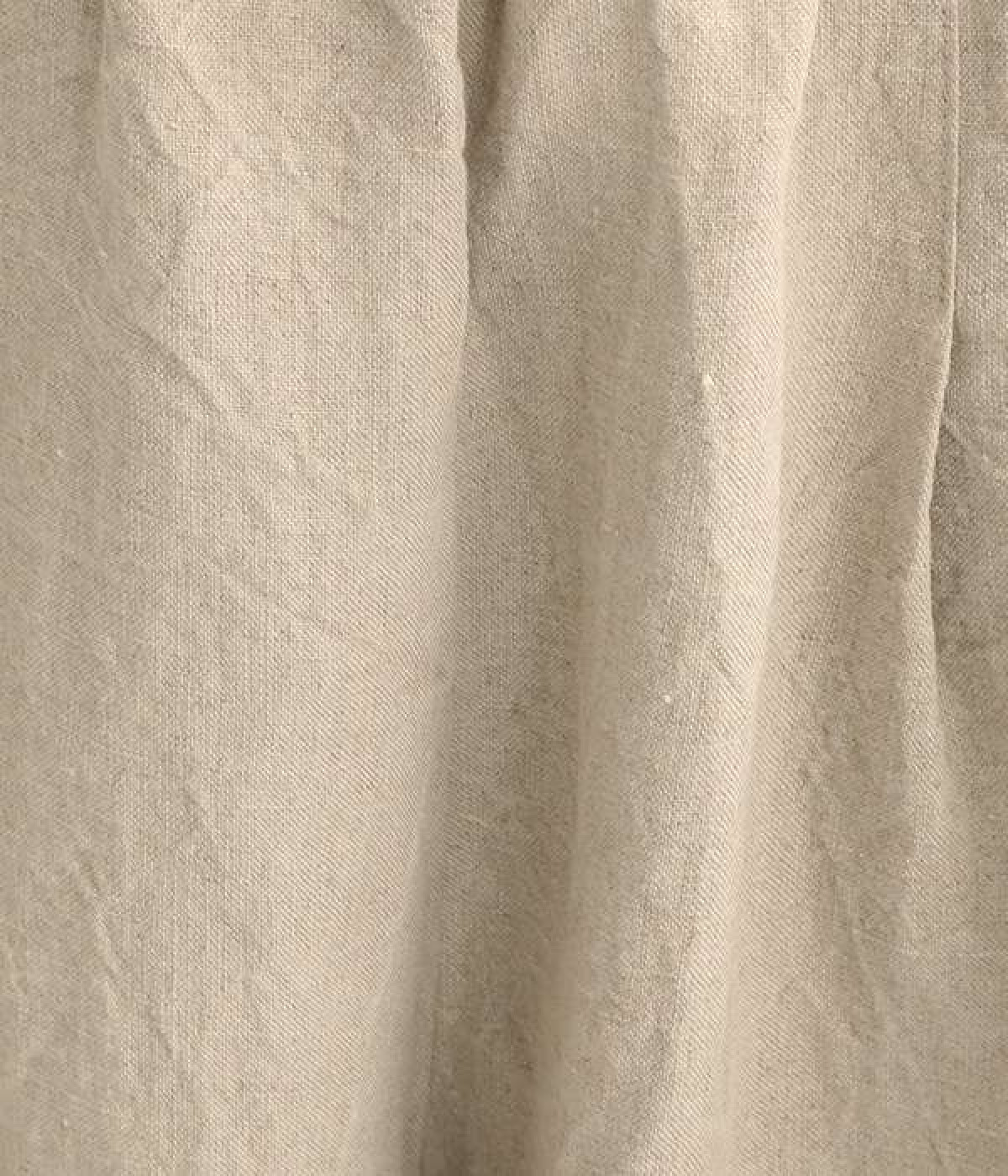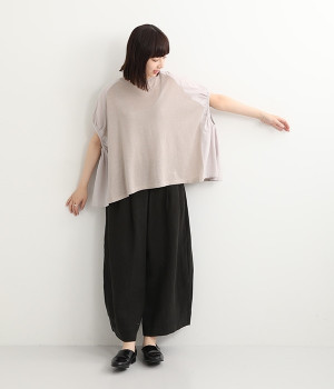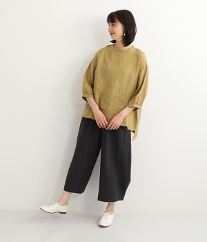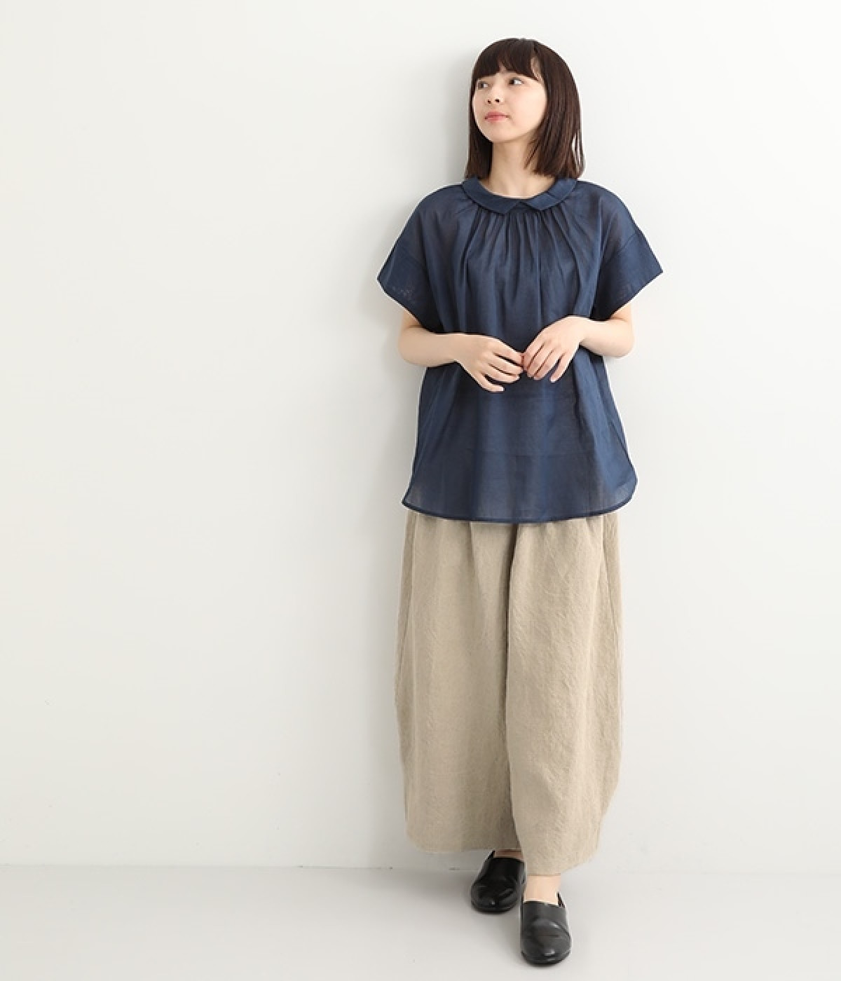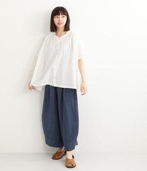 サルエルパンツと裾タックを合わせたパンツです。股上はサルエルより浅くなっているので、バックスタイルがもたつかず、ほどよいボリューム感を楽しんでいただけます。裾が少し狭まっていて、サーカスパンツのようになっているので、小柄な方でもバランスがとりやすいのもポイント。リネン100%のくたっとした肌ざわりも心地よいです。