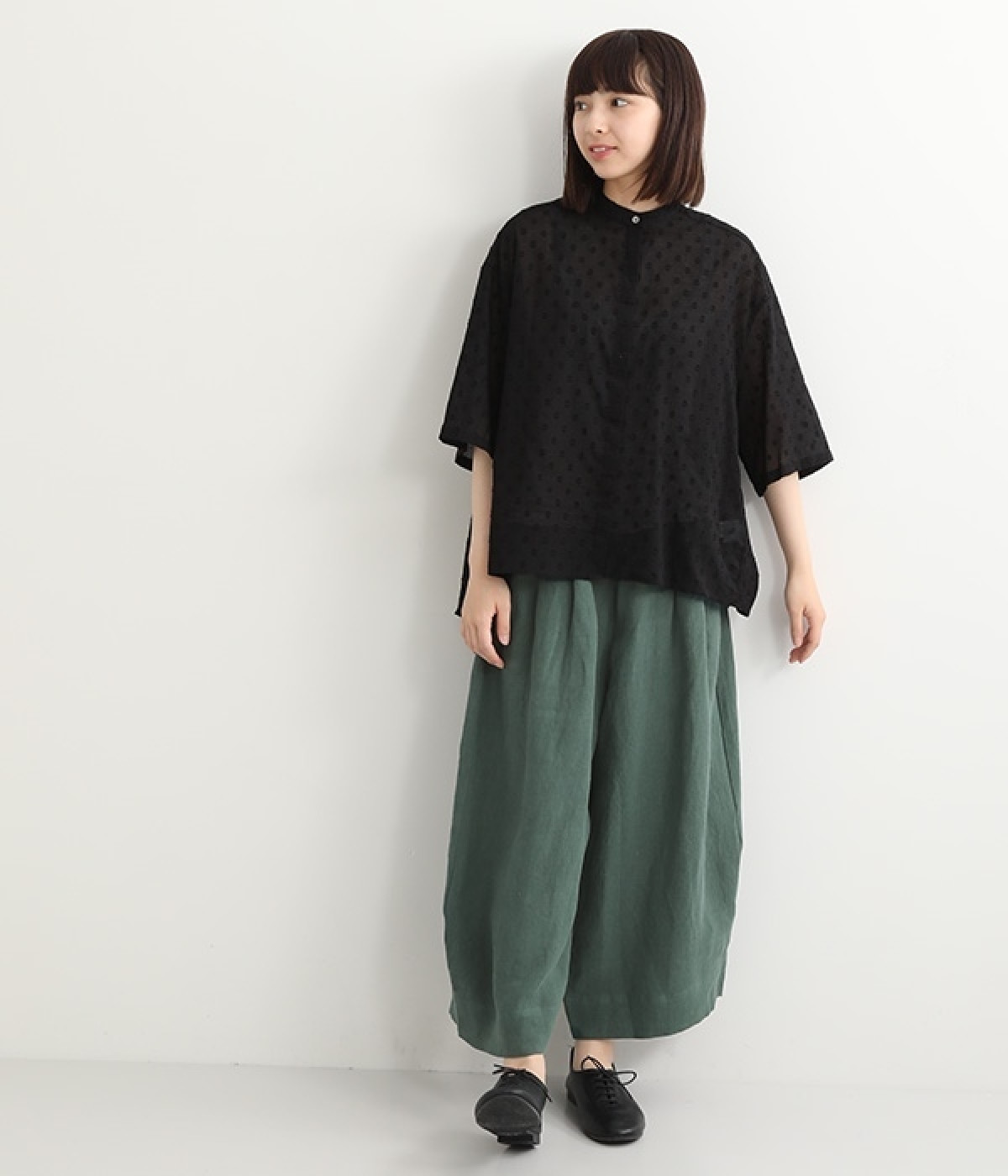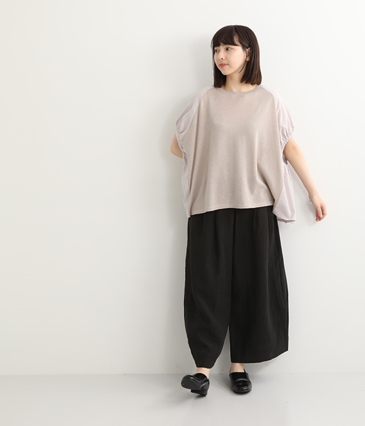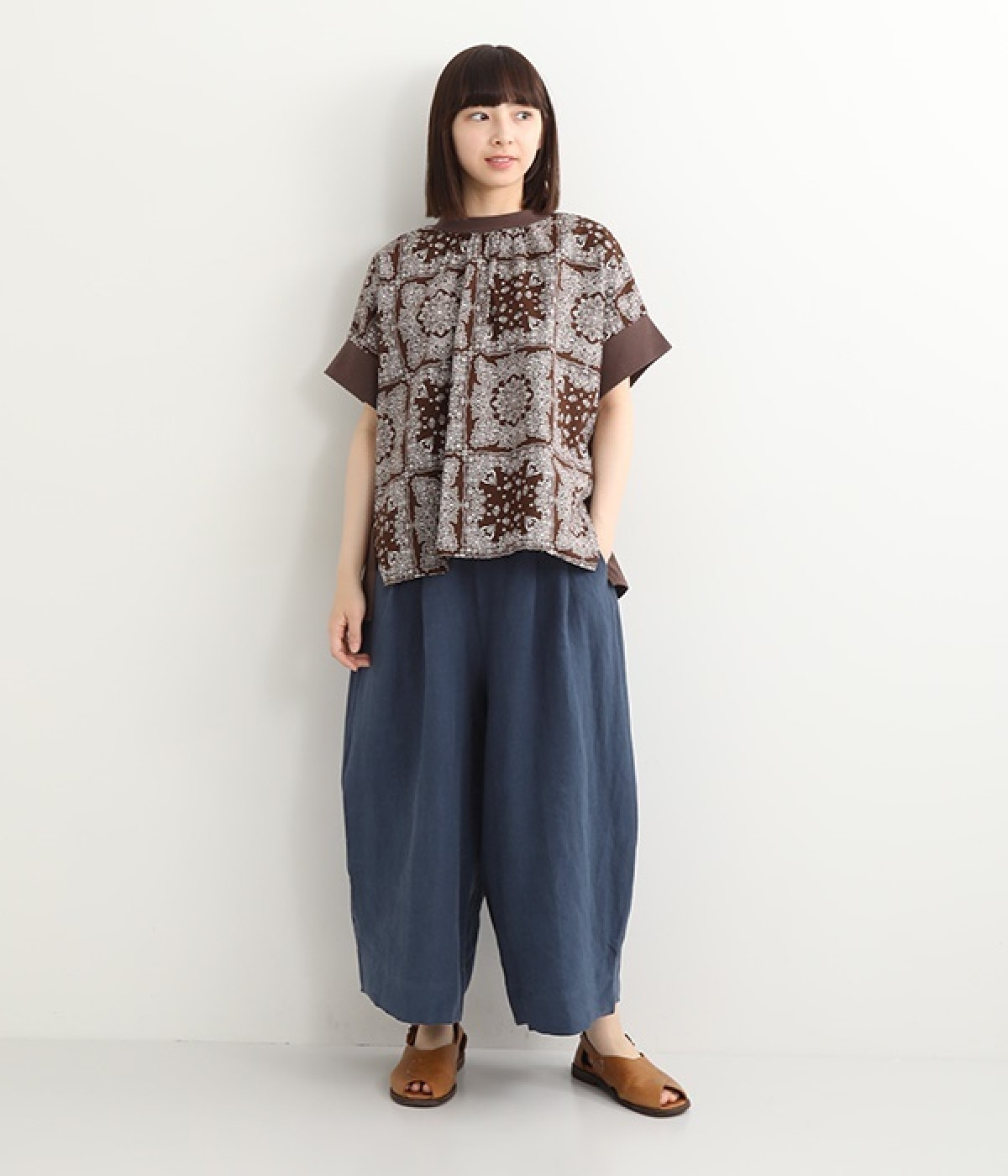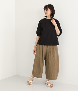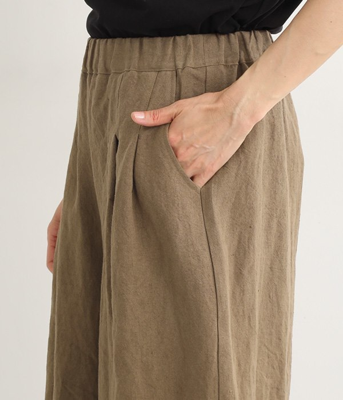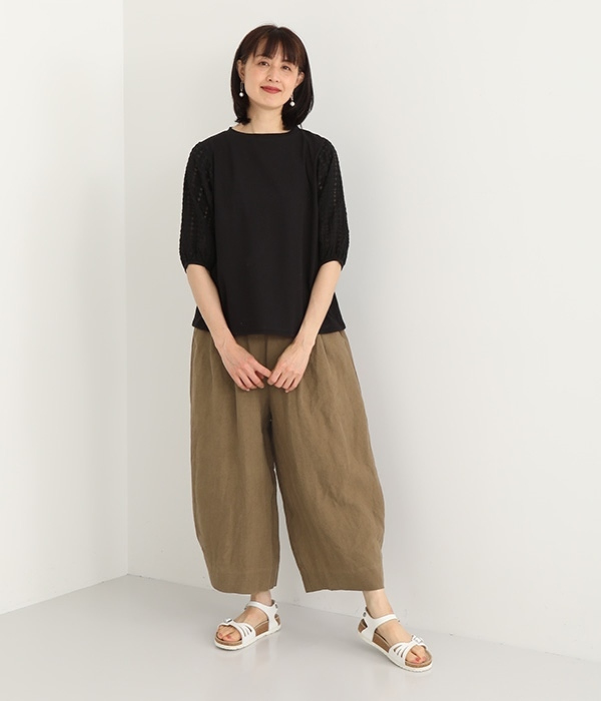 サルエルパンツと裾タックを合わせたパンツです。股上はサルエルより浅くなっているので、バックスタイルがもたつかず、ほどよいボリューム感を楽しんでいただけます。裾が少し狭まっていて、サーカスパンツのようになっているので、小柄な方でもバランスがとりやすいのもポイント。リネン100%のくたっとした肌ざわりも心地よいです。