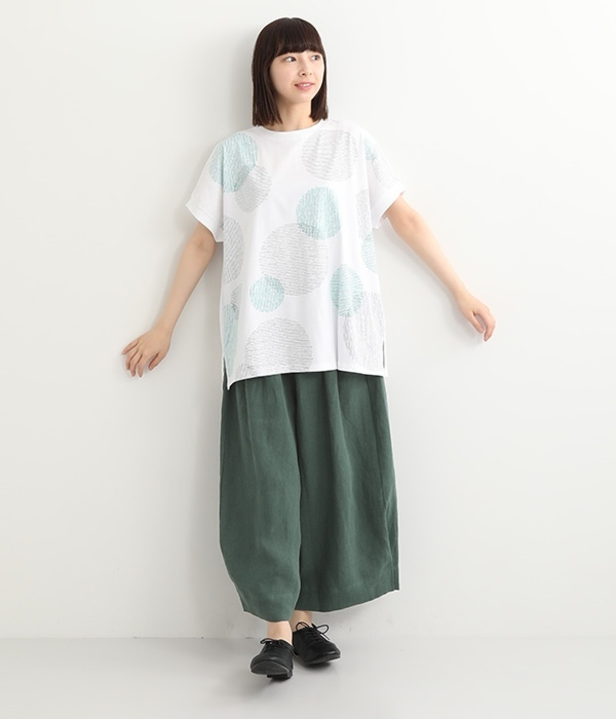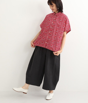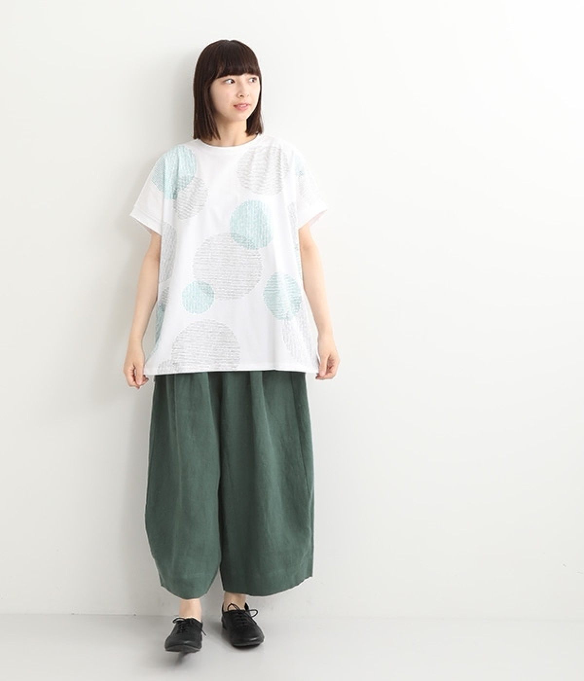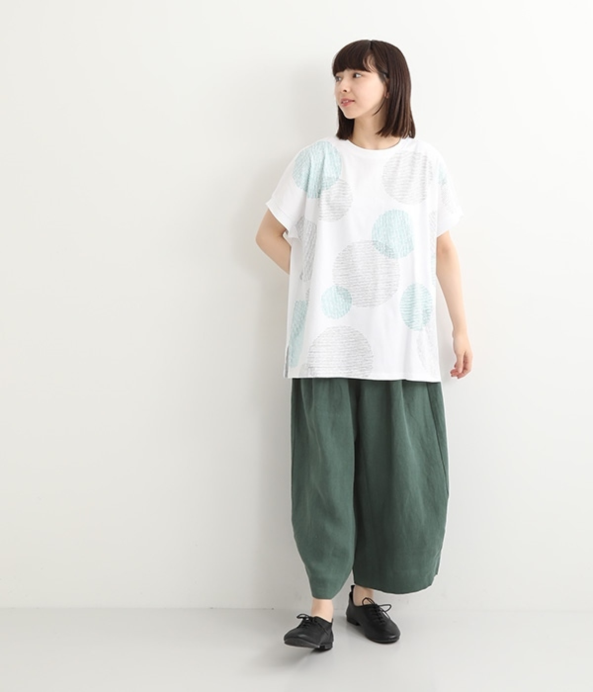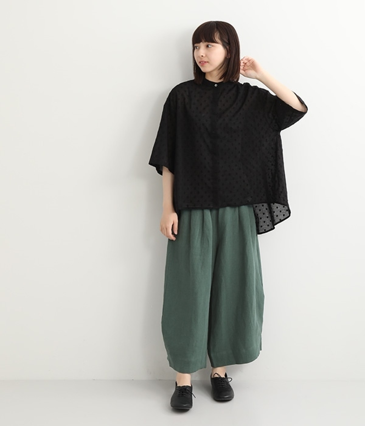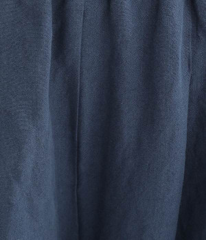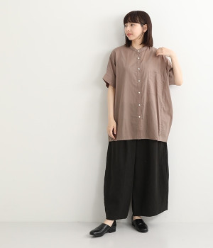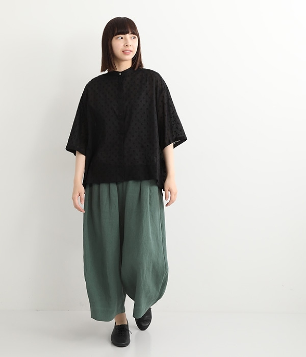 サルエルパンツと裾タックを合わせたパンツです。股上はサルエルより浅くなっているので、バックスタイルがもたつかず、ほどよいボリューム感を楽しんでいただけます。裾が少し狭まっていて、サーカスパンツのようになっているので、小柄な方でもバランスがとりやすいのもポイント。リネン100%のくたっとした肌ざわりも心地よいです。