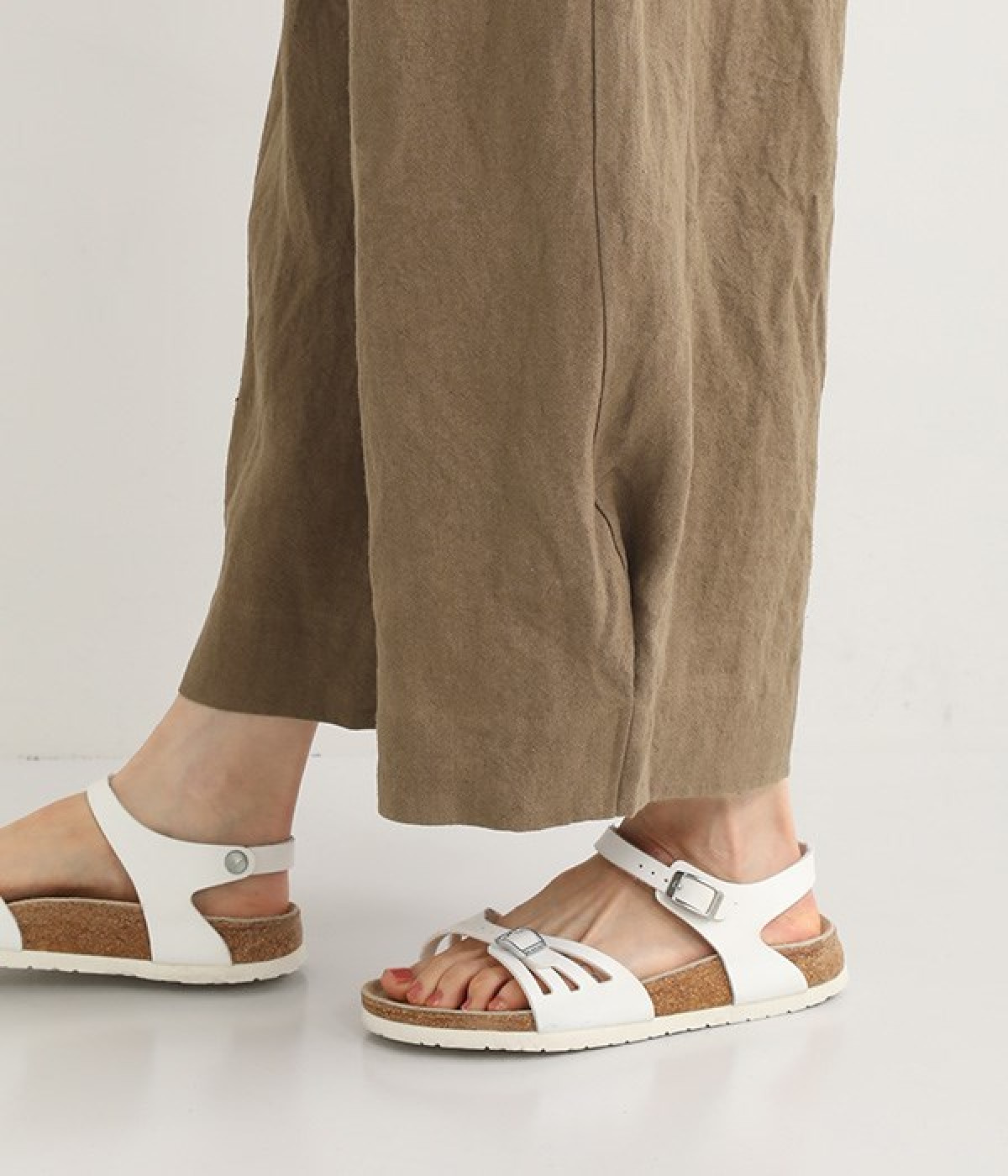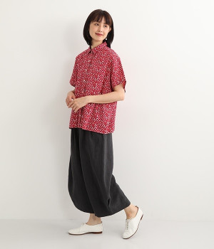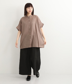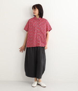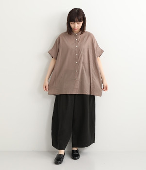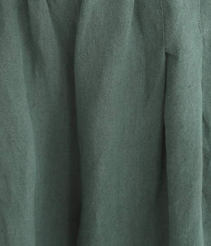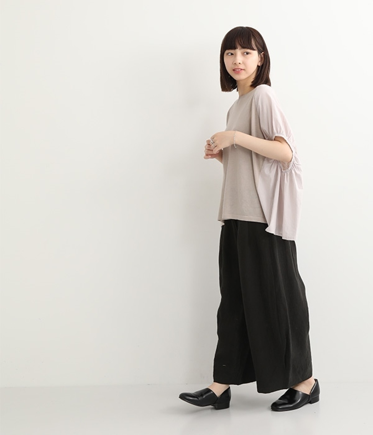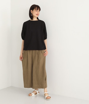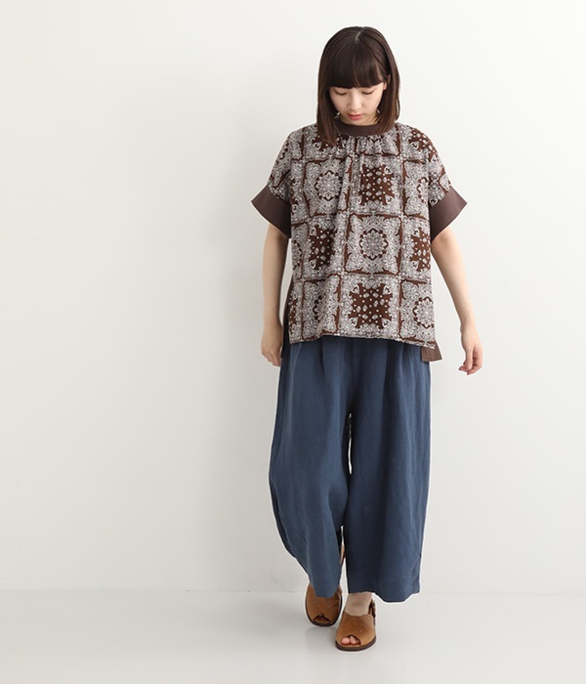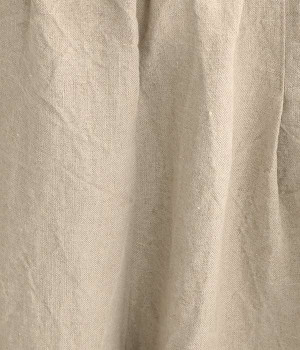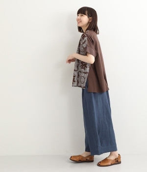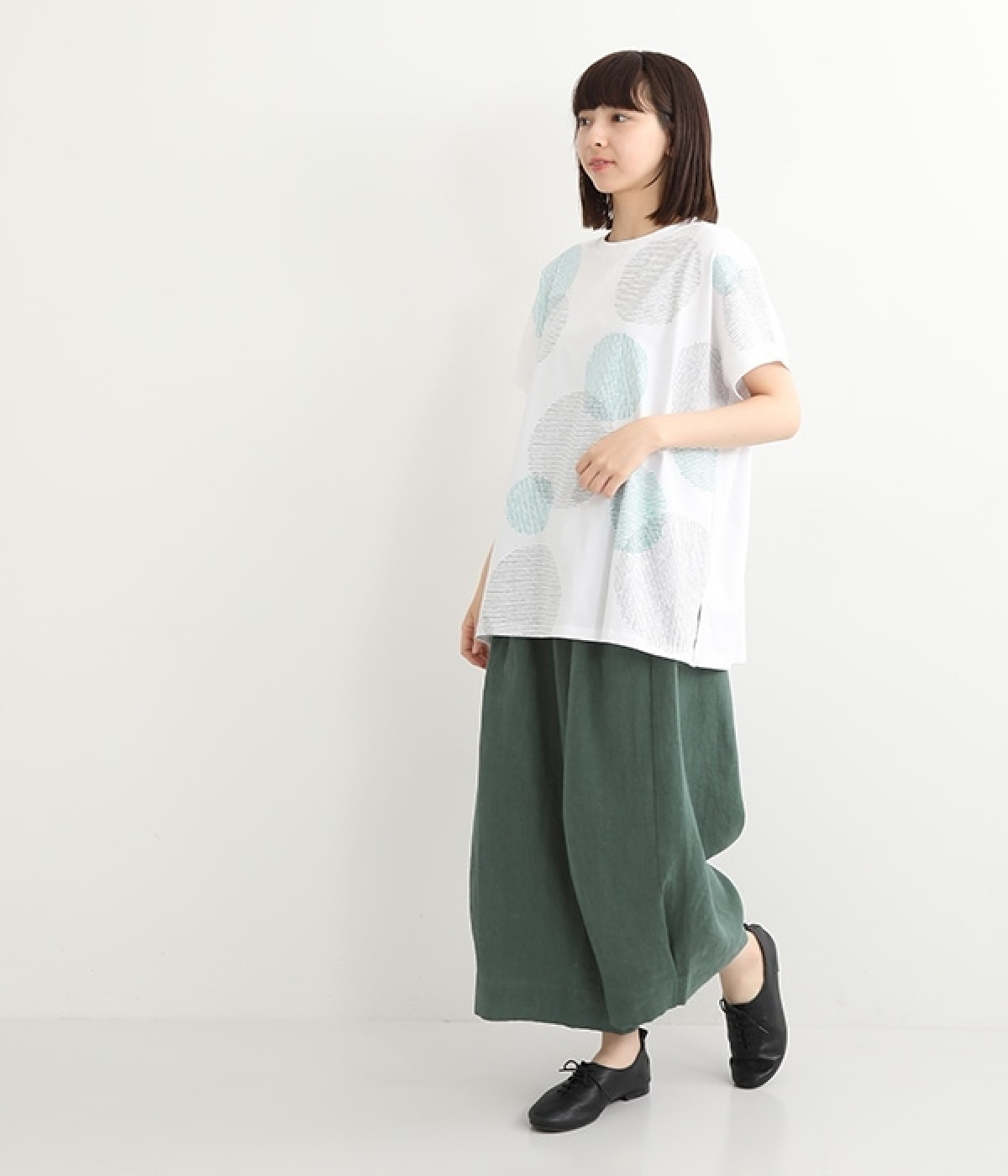 サルエルパンツと裾タックを合わせたパンツです。股上はサルエルより浅くなっているので、バックスタイルがもたつかず、ほどよいボリューム感を楽しんでいただけます。裾が少し狭まっていて、サーカスパンツのようになっているので、小柄な方でもバランスがとりやすいのもポイント。リネン100%のくたっとした肌ざわりも心地よいです。
