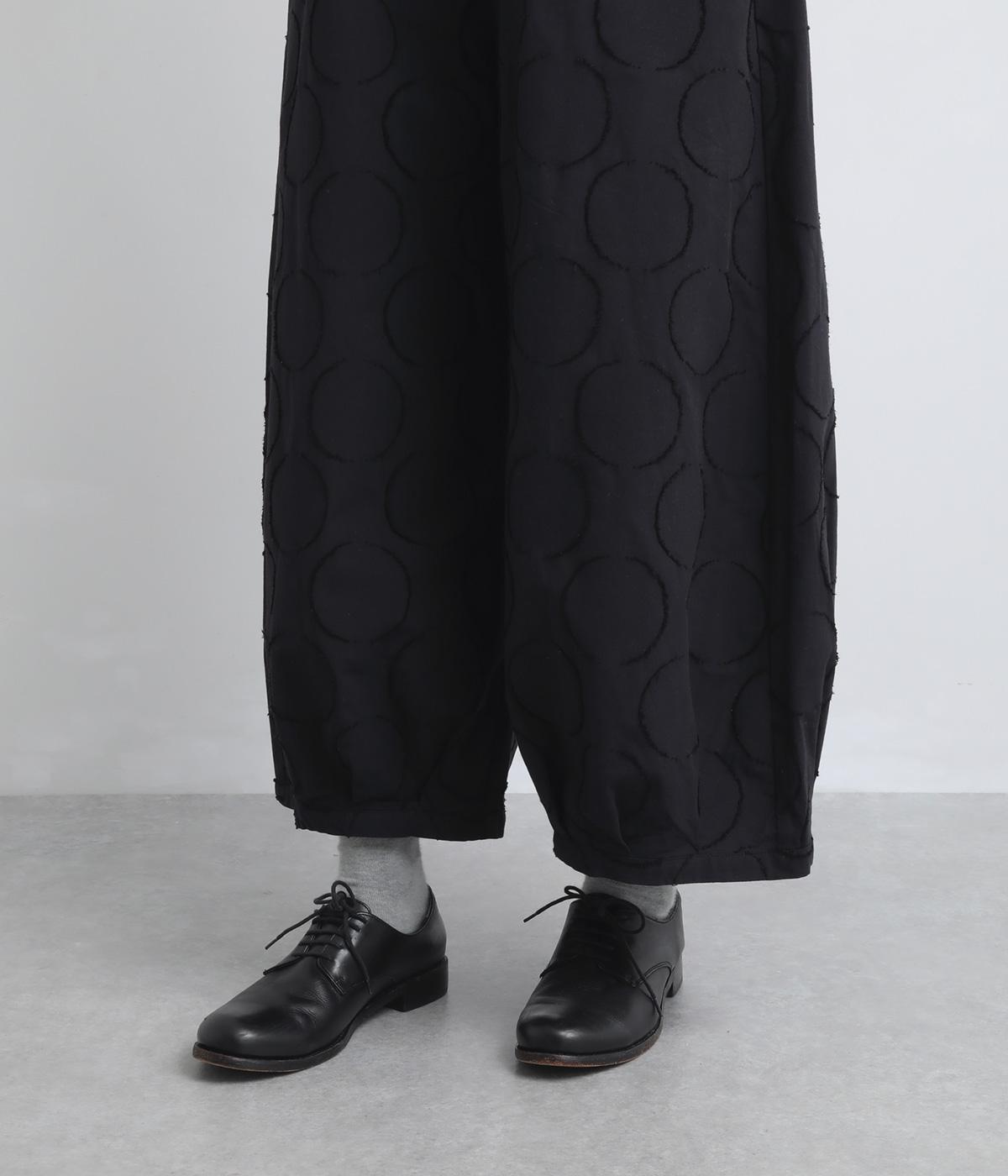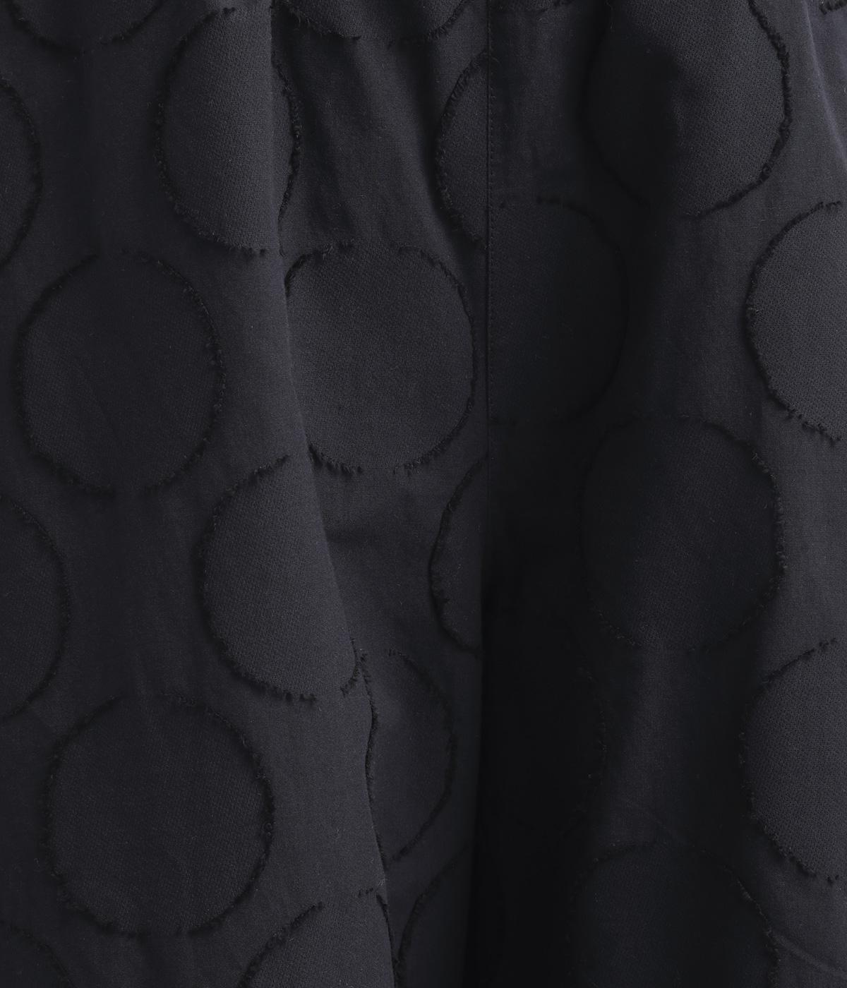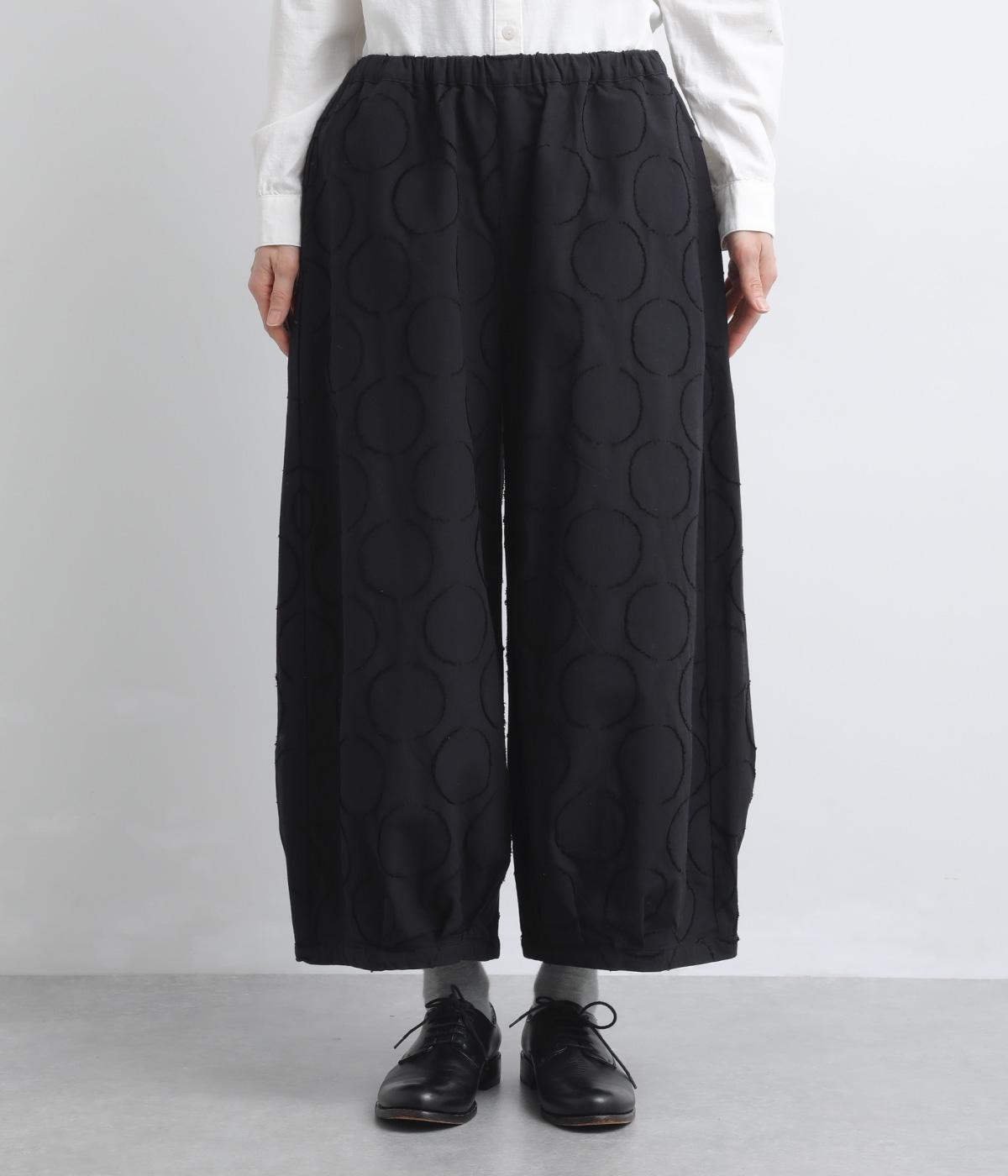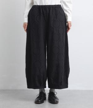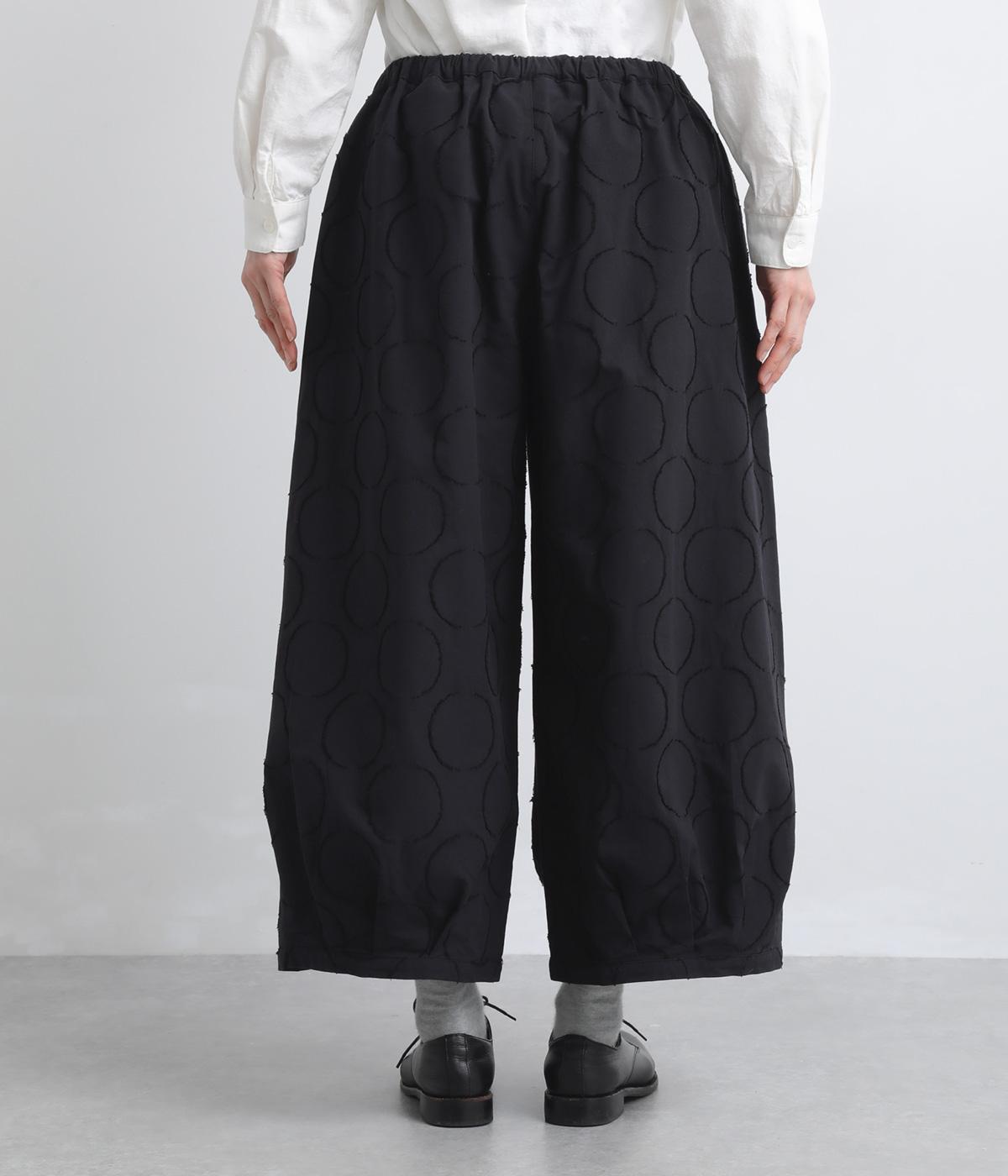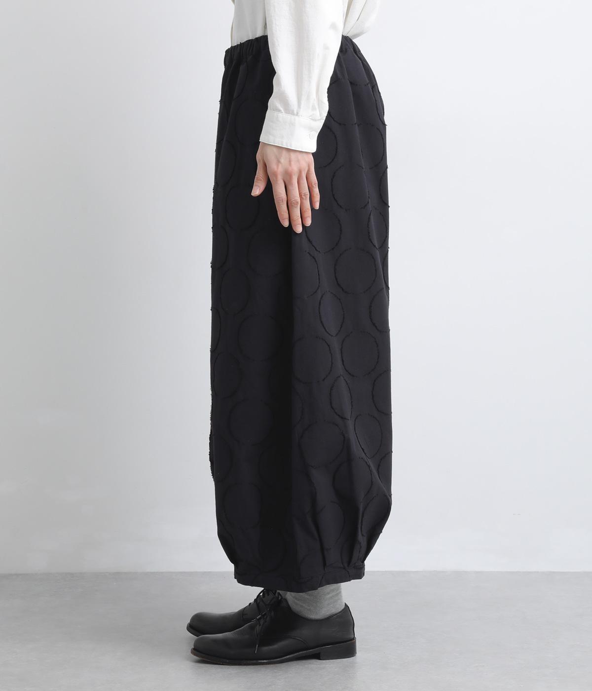 裾にタックを入れて絞った、丸みのあるバルーンシルエットが魅力。立体感のある大きなドット柄は、存在感がありながらも、同色で織り上げることで落ち着いた表情に仕上げています。くるぶし丈なので、靴下をちらりとのぞかせるコーディネートもおすすめです。ウエストはゴム仕様で、快適なはき心地◎