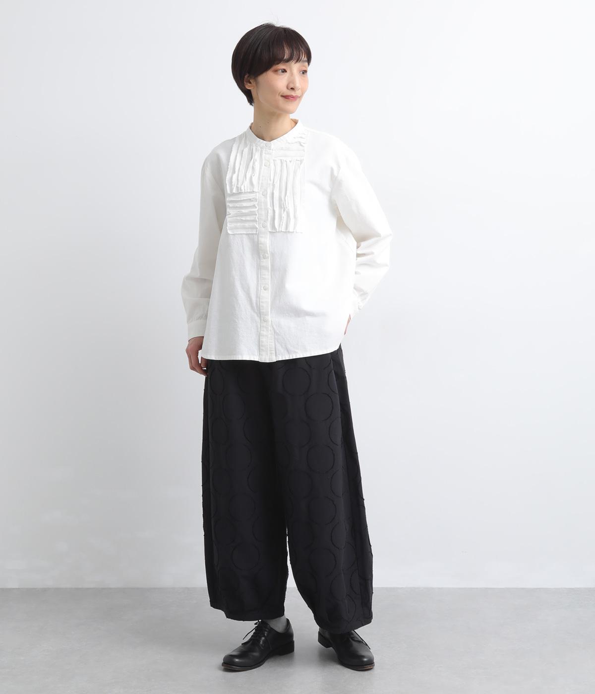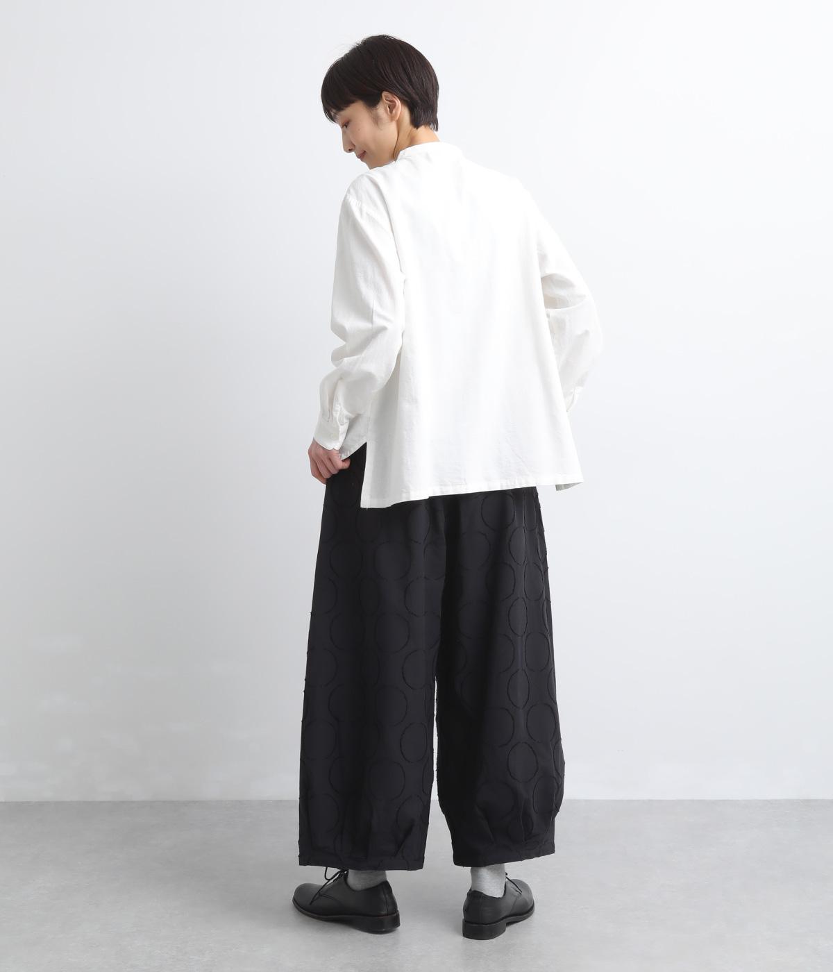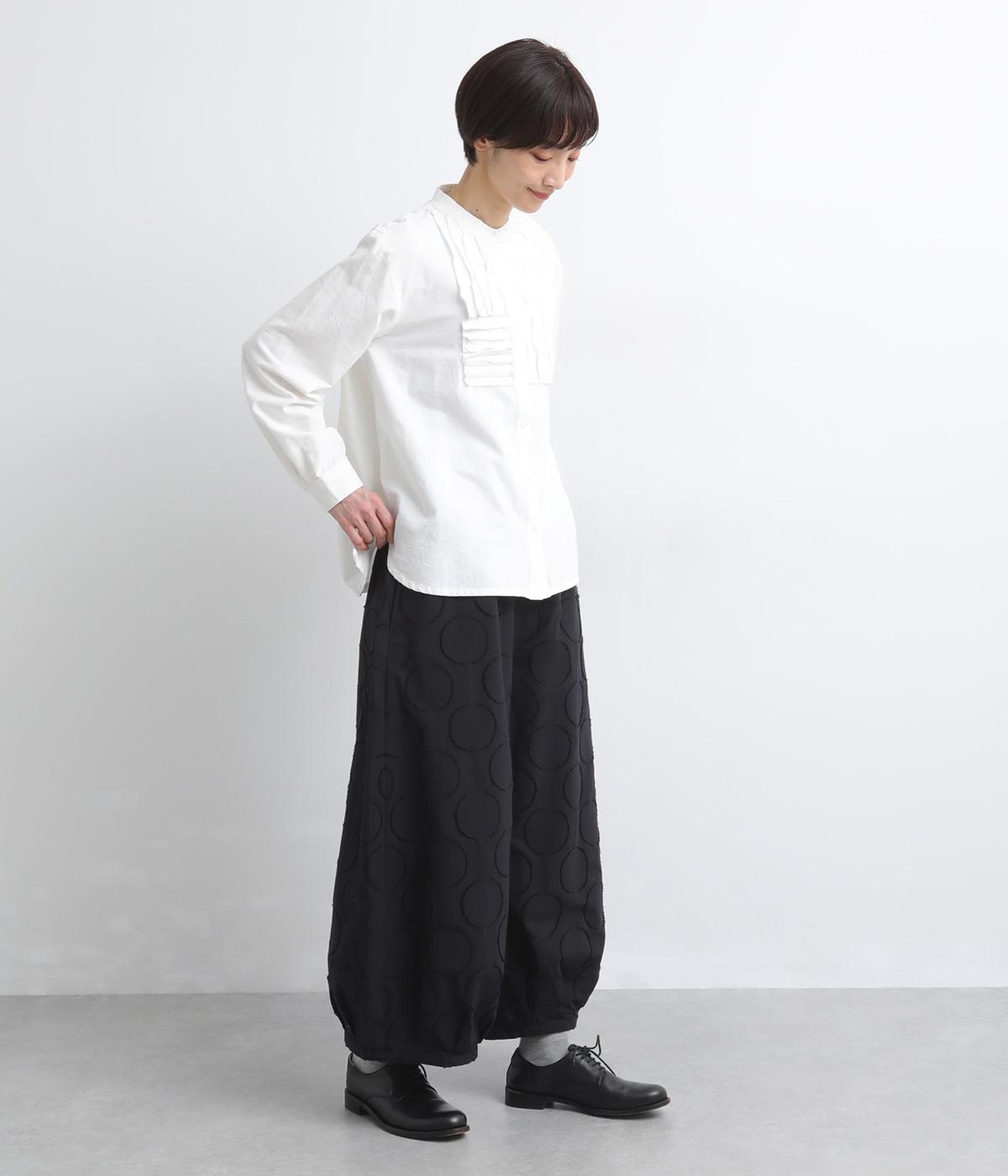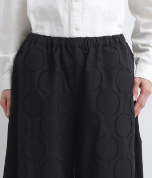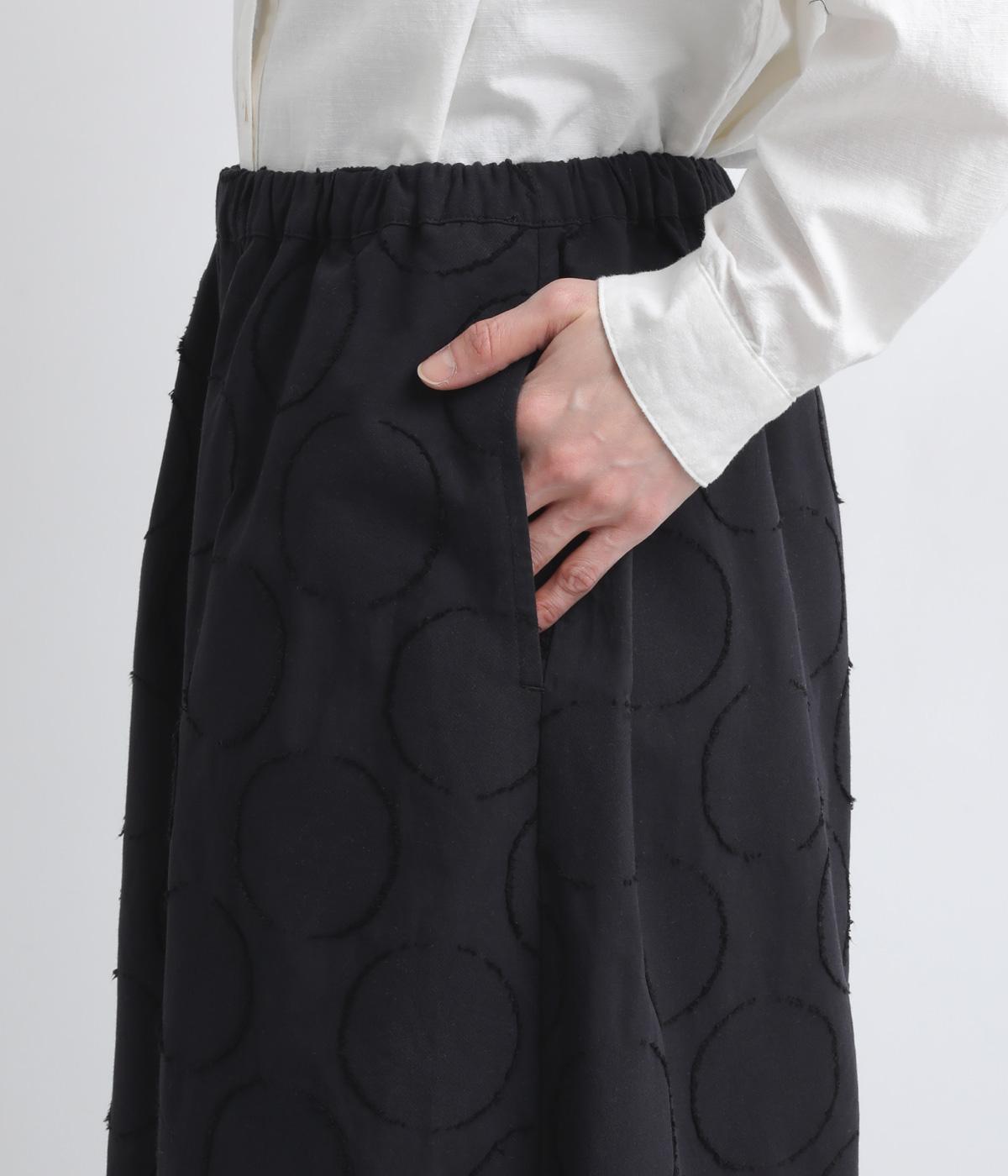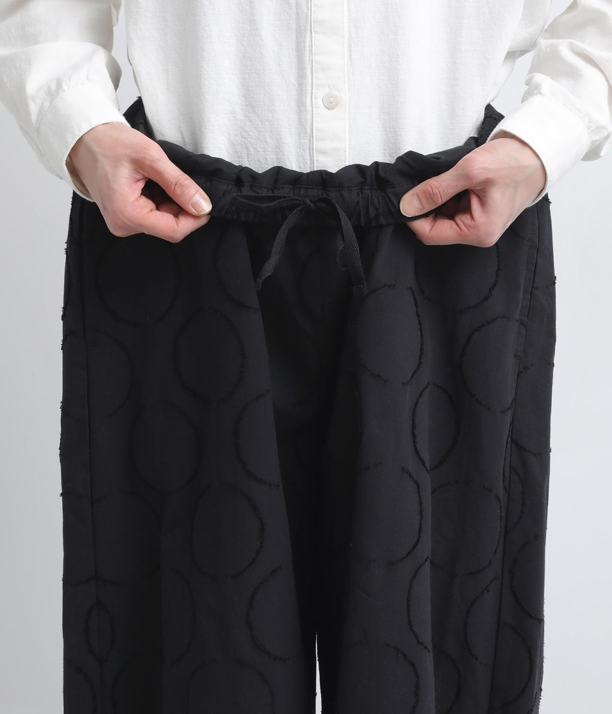 裾にタックを入れて絞った、丸みのあるバルーンシルエットが魅力。立体感のある大きなドット柄は、存在感がありながらも、同色で織り上げることで落ち着いた表情に仕上げています。くるぶし丈なので、靴下をちらりとのぞかせるコーディネートもおすすめです。ウエストはゴム仕様で、快適なはき心地◎