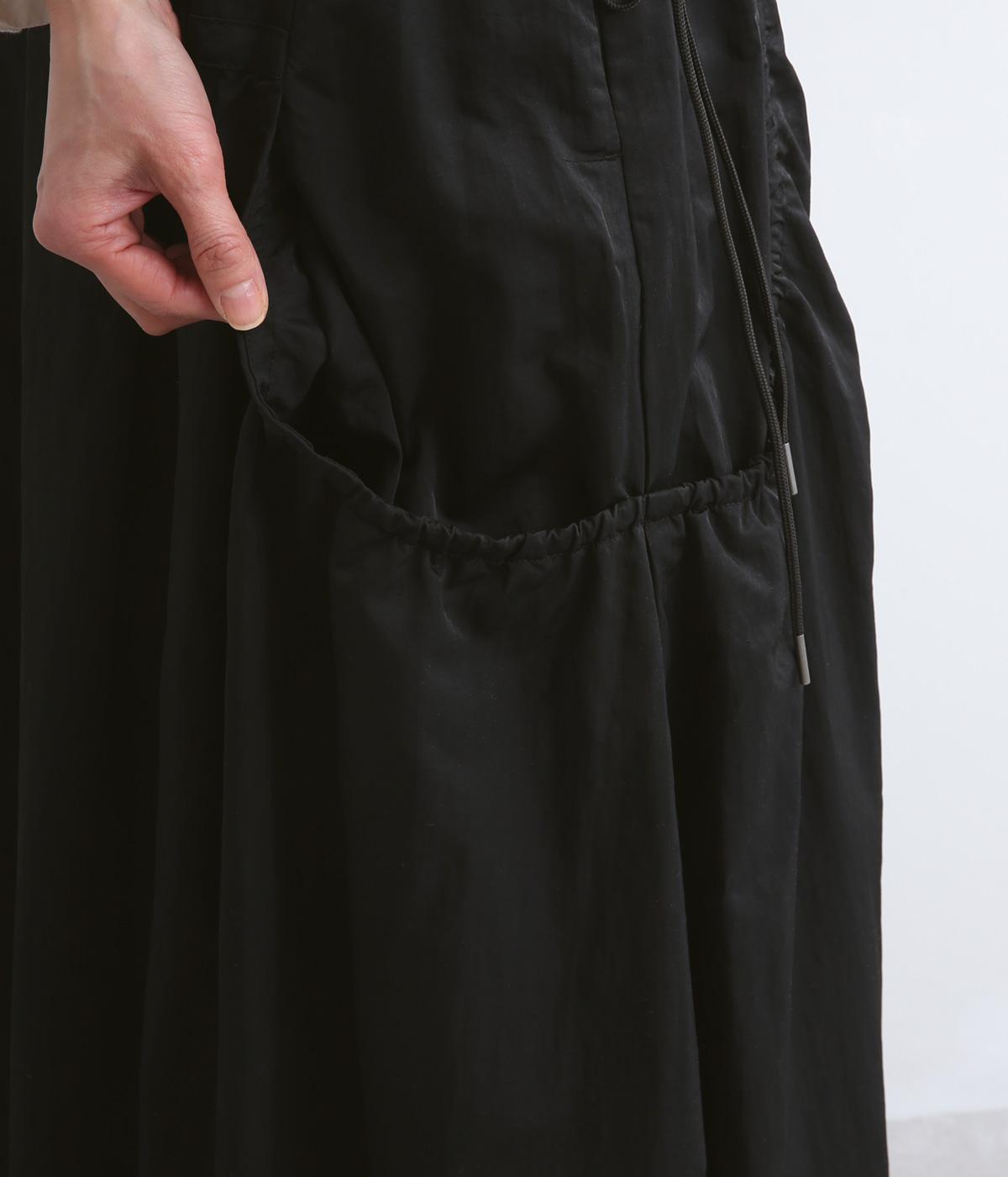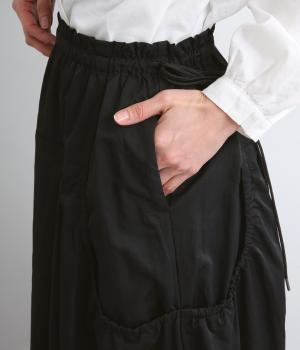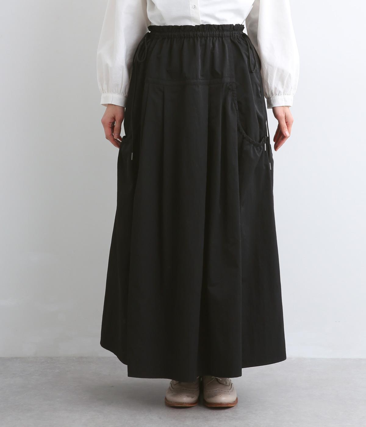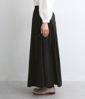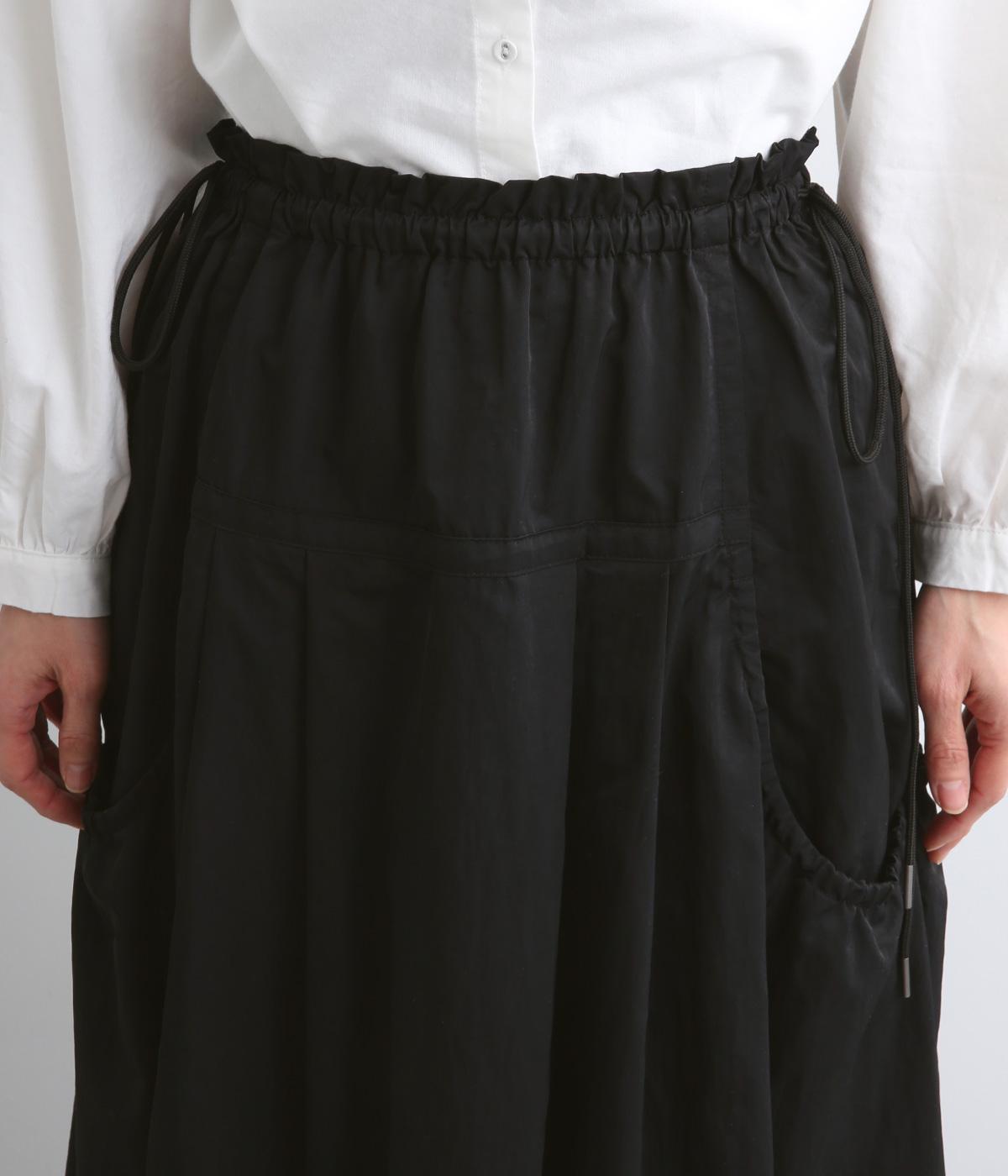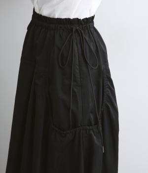 腰下に切り替えを入れてフレア感を出したロングスカート。ゴムギャザーのラウンドラインが印象的で、大人のモードスタイルが完成。サイドポケットつきで実用性も高く、ウエストはゴムギャザーにサイド紐でフィット感の調節も可能。