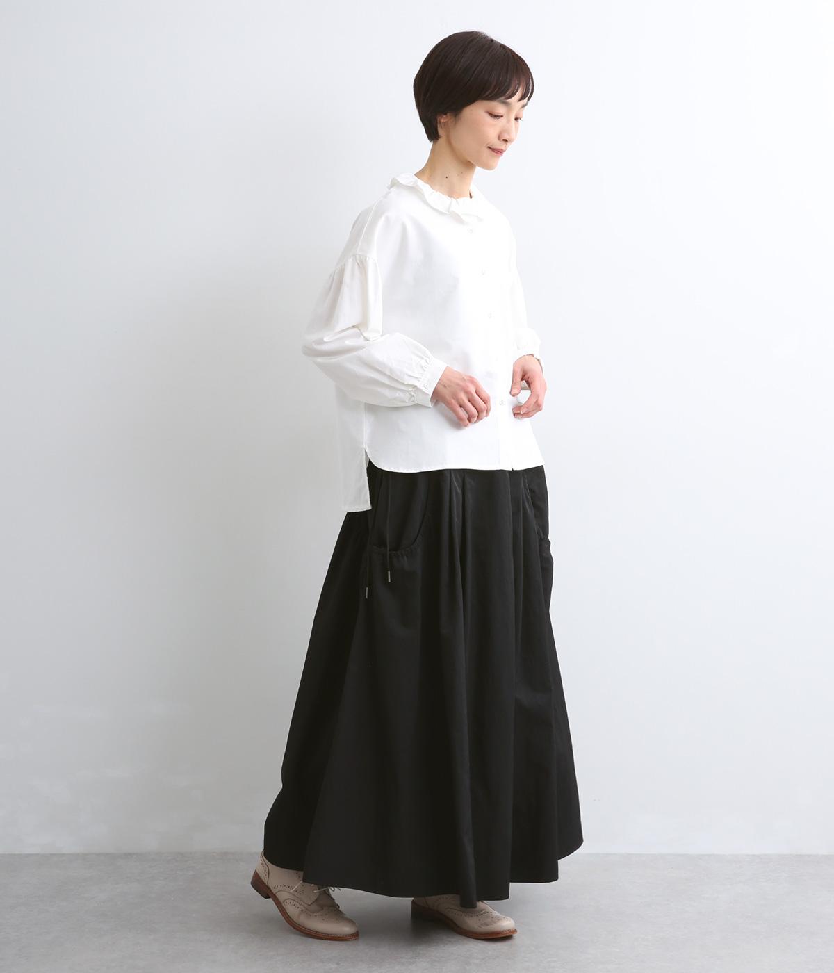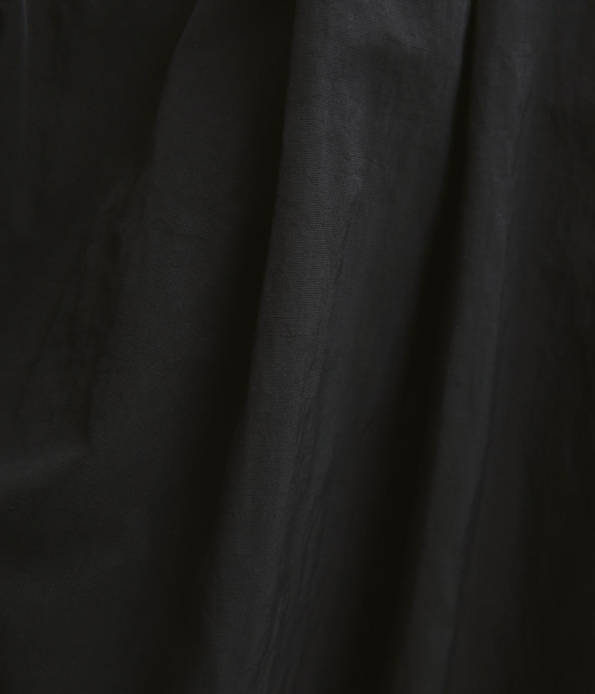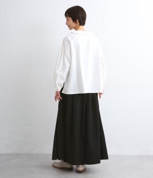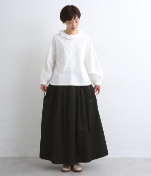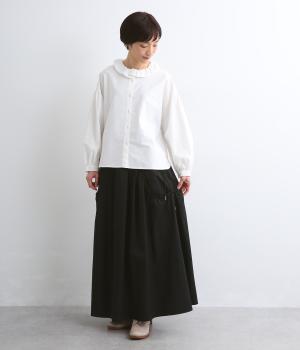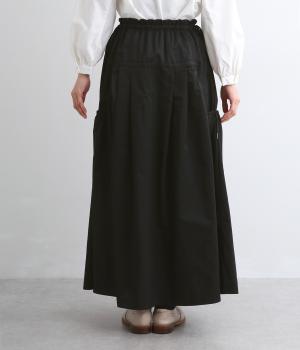 腰下に切り替えを入れてフレア感を出したロングスカート。ゴムギャザーのラウンドラインが印象的で、大人のモードスタイルが完成。サイドポケットつきで実用性も高く、ウエストはゴムギャザーにサイド紐でフィット感の調節も可能。