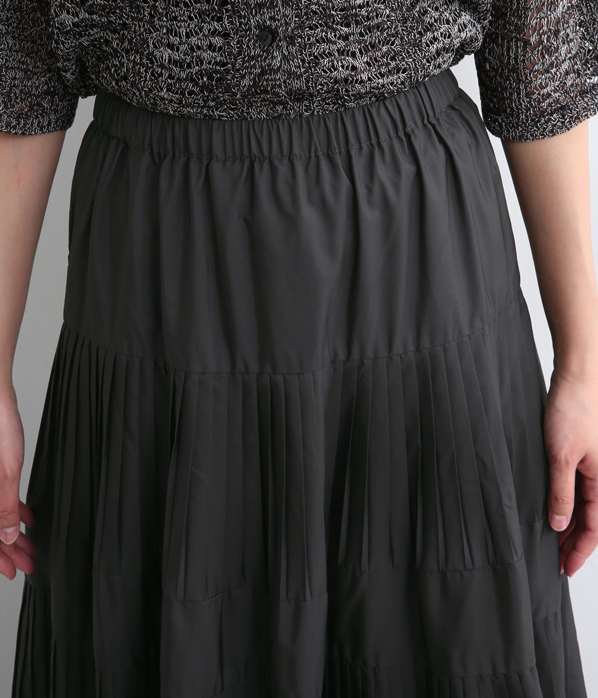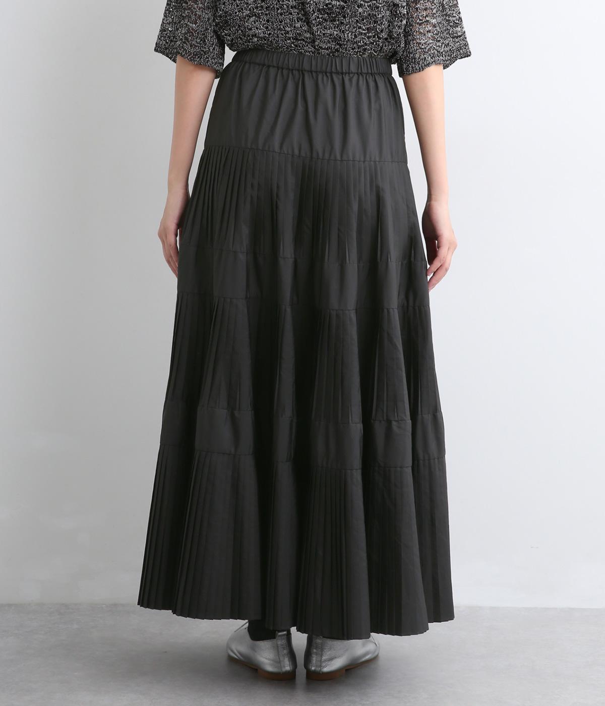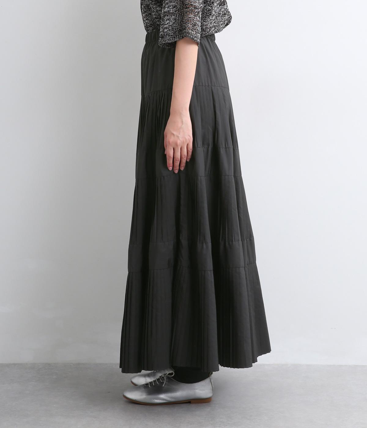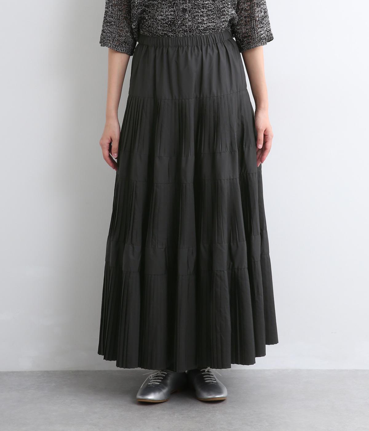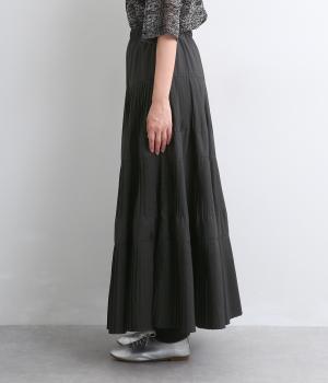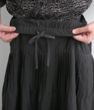 コーティング加工でしっかりとプリーツを表現した着映え力の高いティアードスカート。生地を贅沢にたっぷり使用し、裾にかけて段々とフレアにしています。ウエストはオールゴムに調整紐入りでフィット感や腰位置のアレンジも可能。