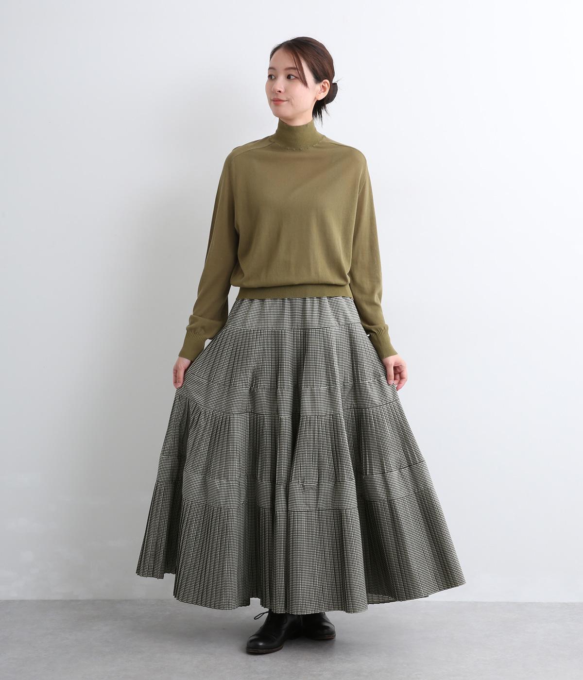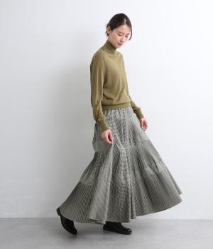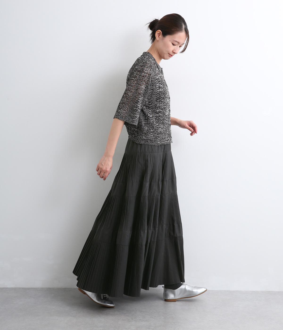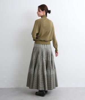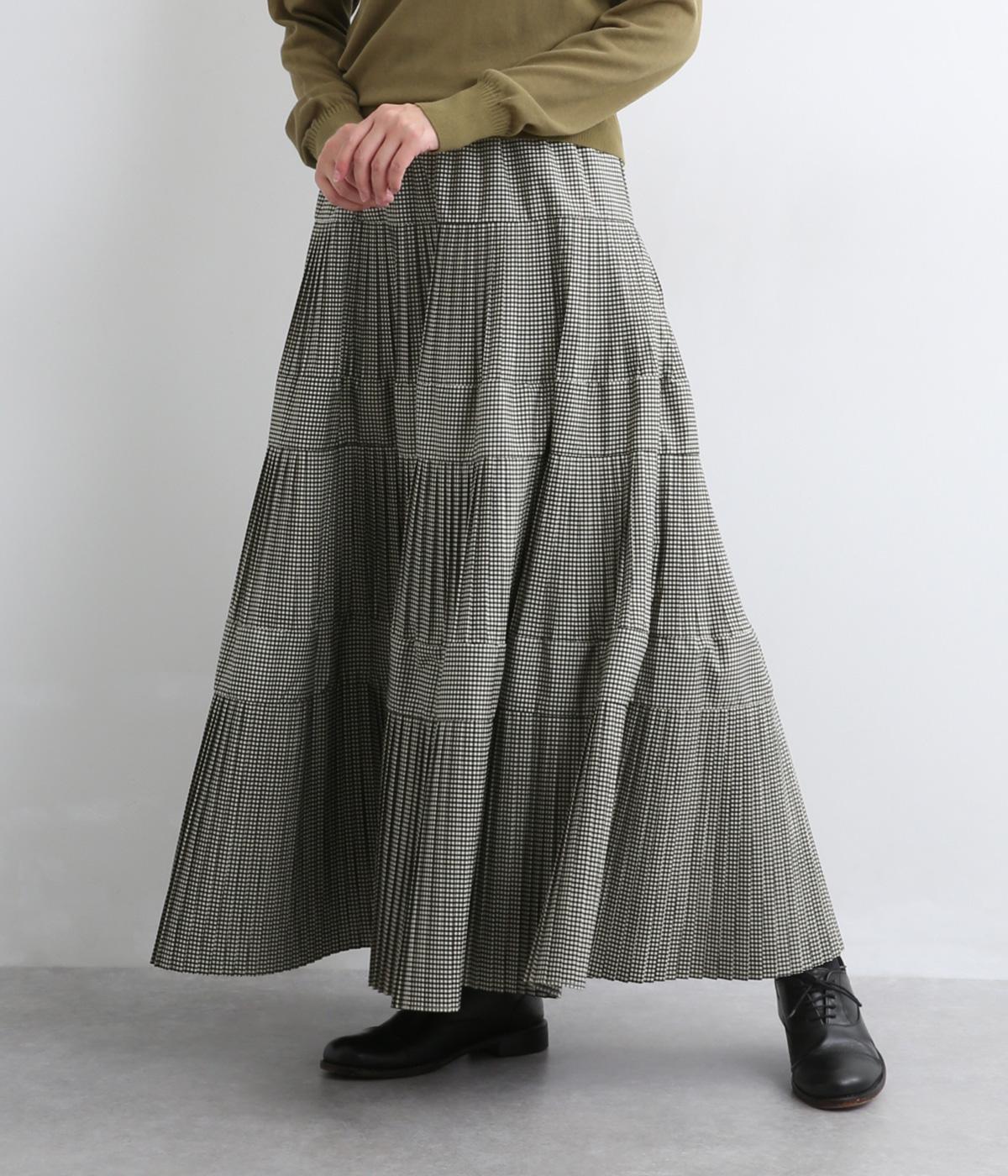 コーティング加工でしっかりとプリーツを表現した着映え力の高いティアードスカート。生地を贅沢にたっぷり使用し、裾にかけて段々とフレアにしています。ウエストはオールゴムに調整紐入りでフィット感や腰位置のアレンジも可能。