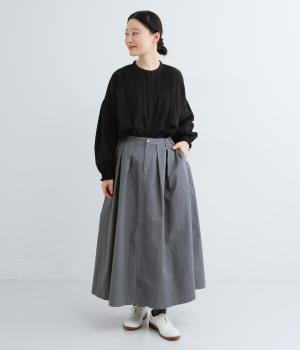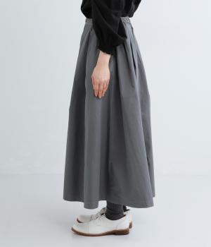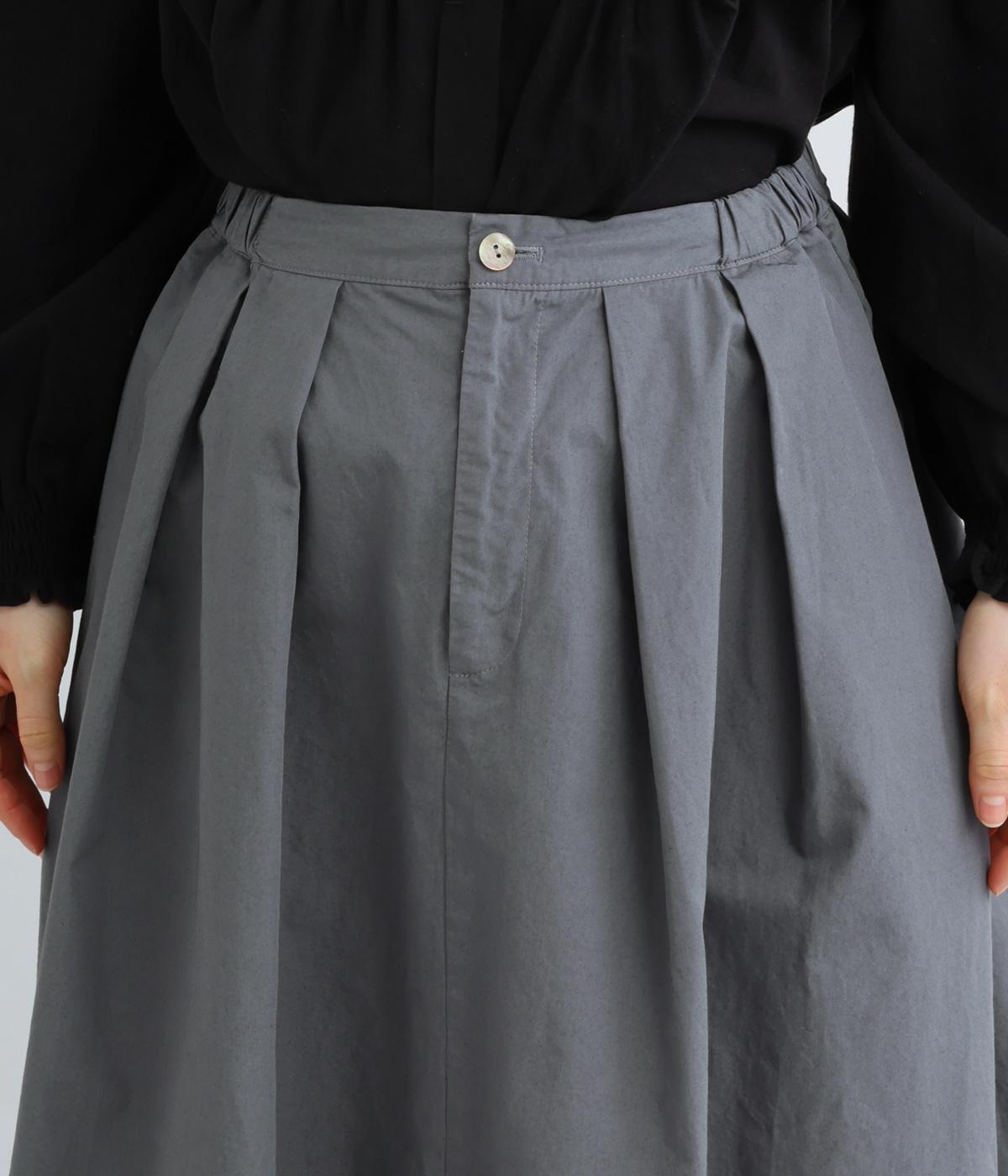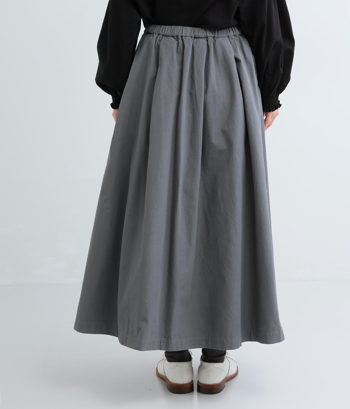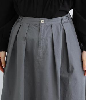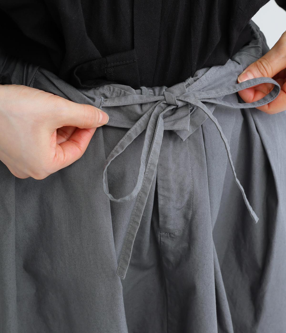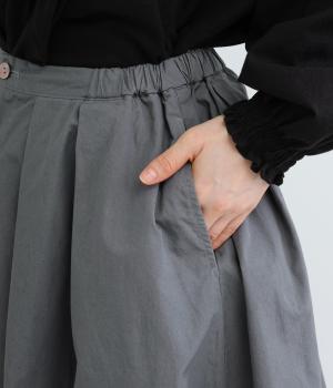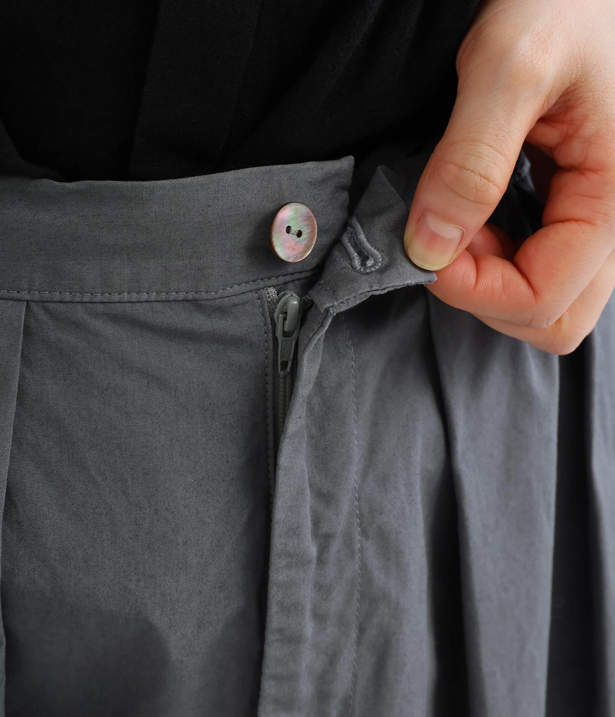ハリのある生地がドレープやシルエットを美しく引き立て、華やかな印象を与えます。ウエストはボタンとファスナー仕様で、サイドからうしろにぐるりとゴムを配しました。内紐でサイズ調節も可能です。