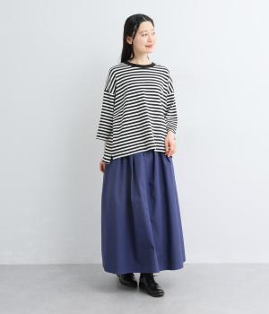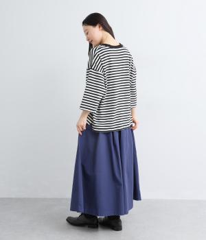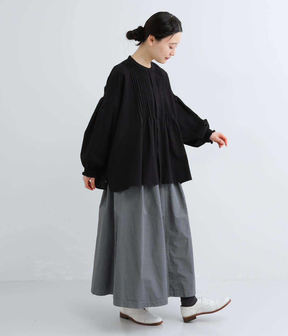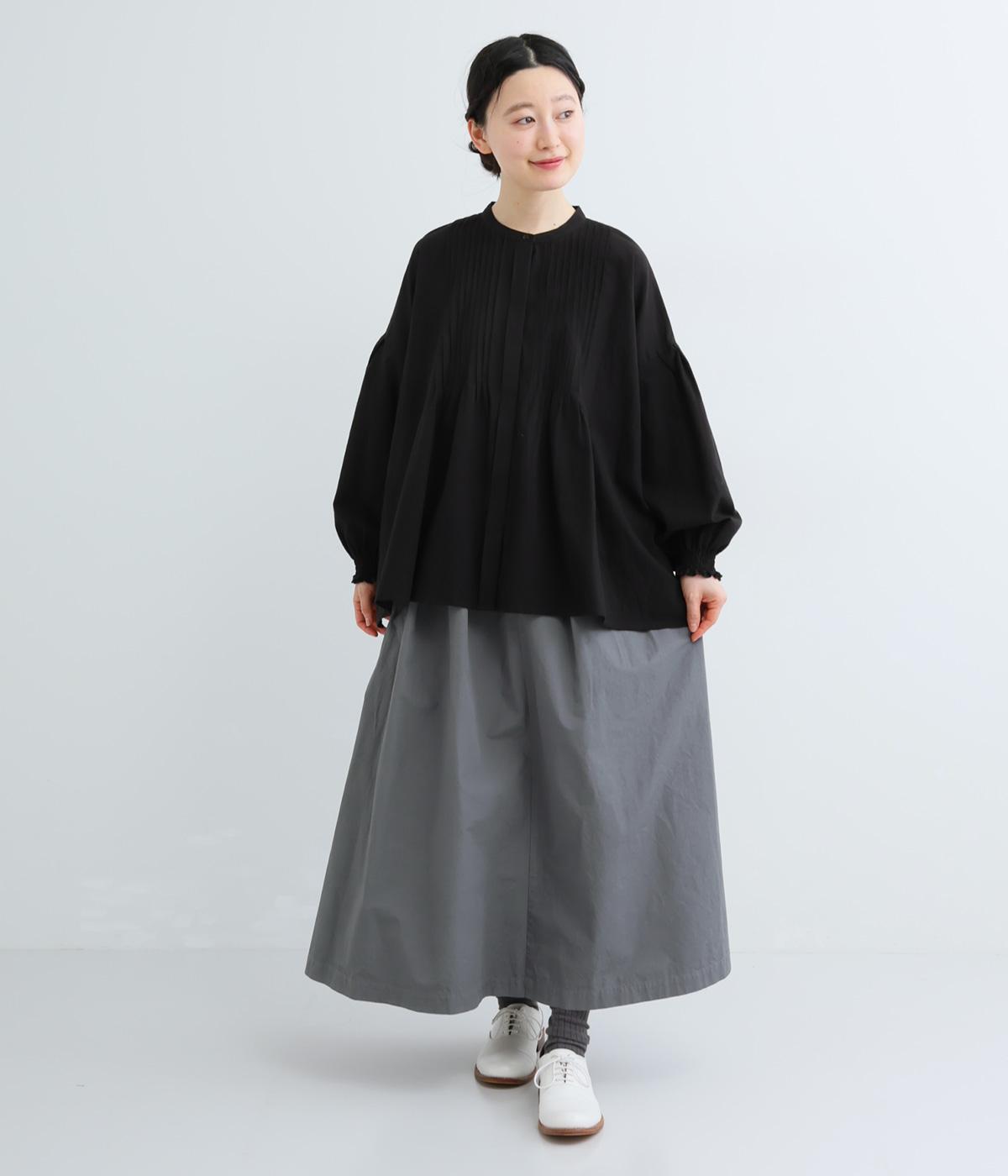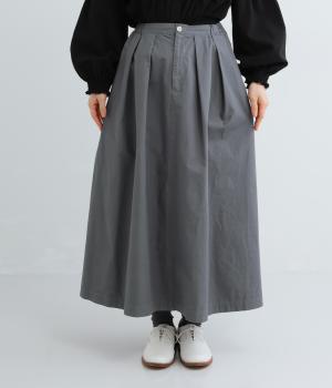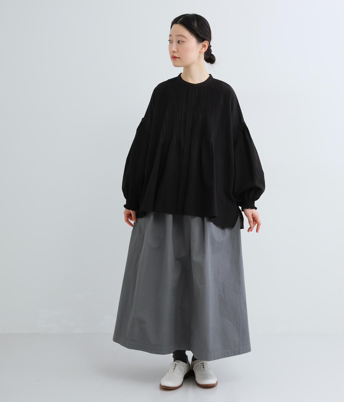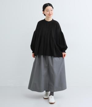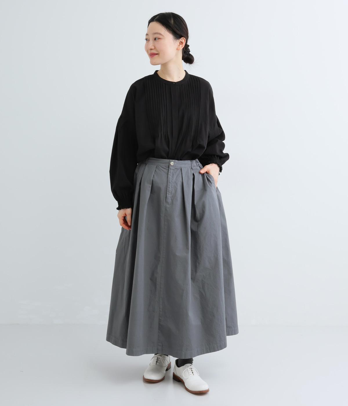 ハリのある生地がドレープやシルエットを美しく引き立て、華やかな印象を与えます。ウエストはボタンとファスナー仕様で、サイドからうしろにぐるりとゴムを配しました。内紐でサイズ調節も可能です。