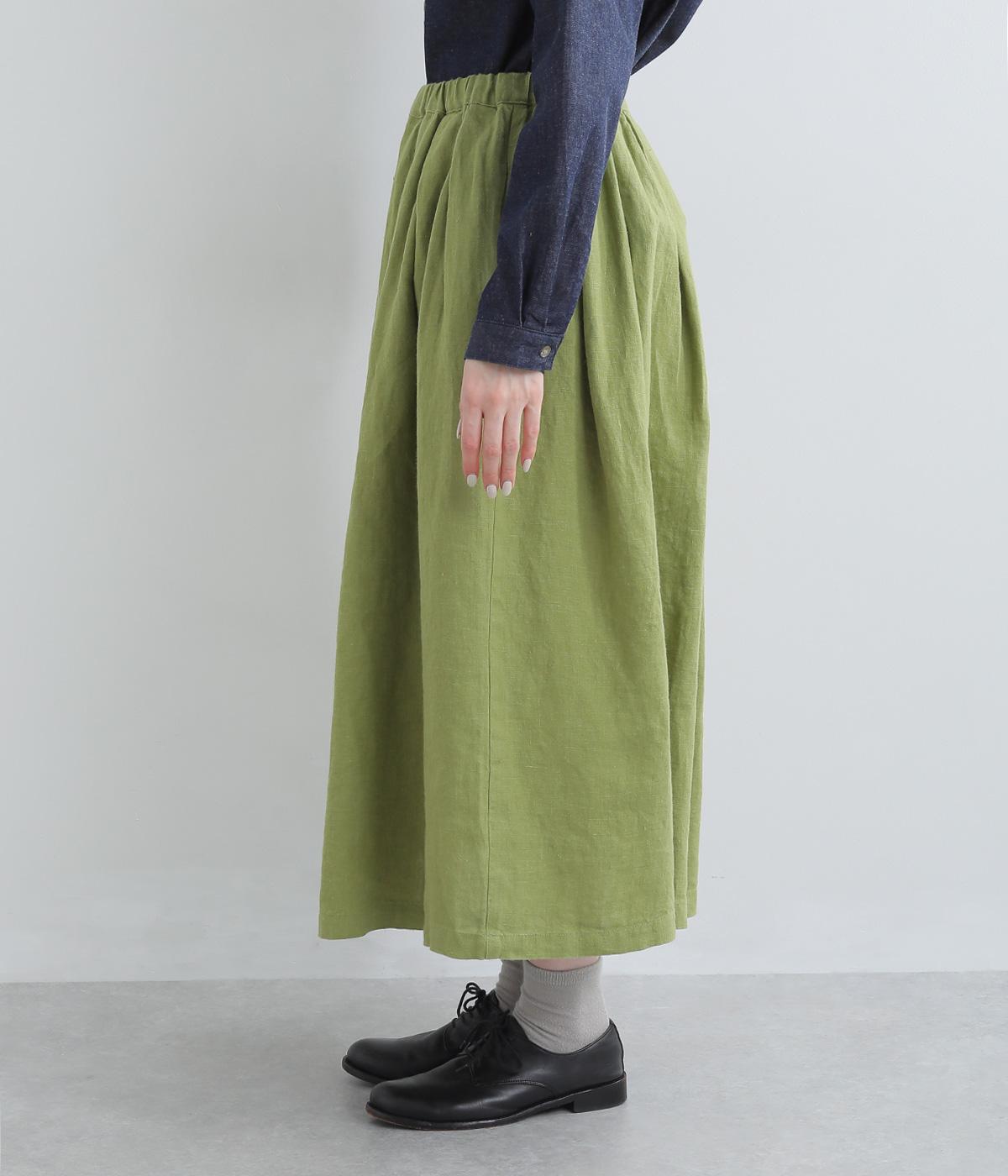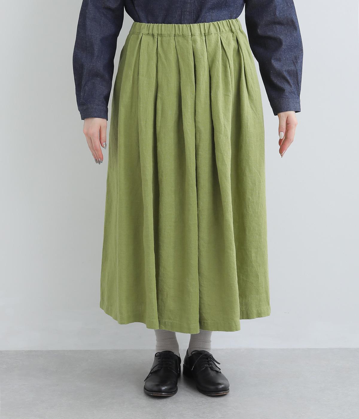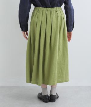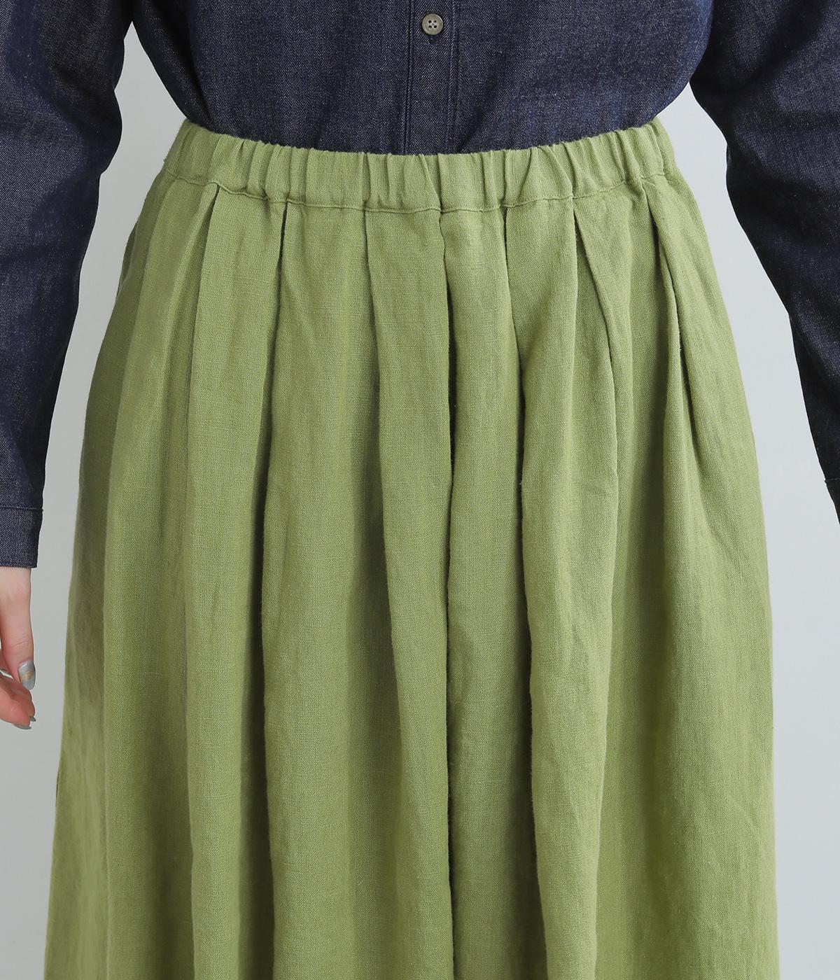 ウエストから入った複数のタックが自然な動きと立体感を生むロングスカート。ふわりと揺れるようなシルエットを演出してくれます。ウエストは総ゴム仕様で内紐つきです。
