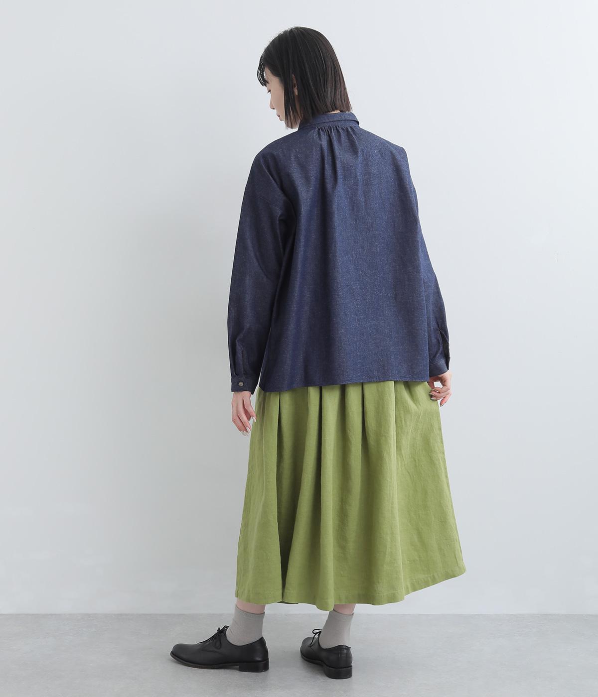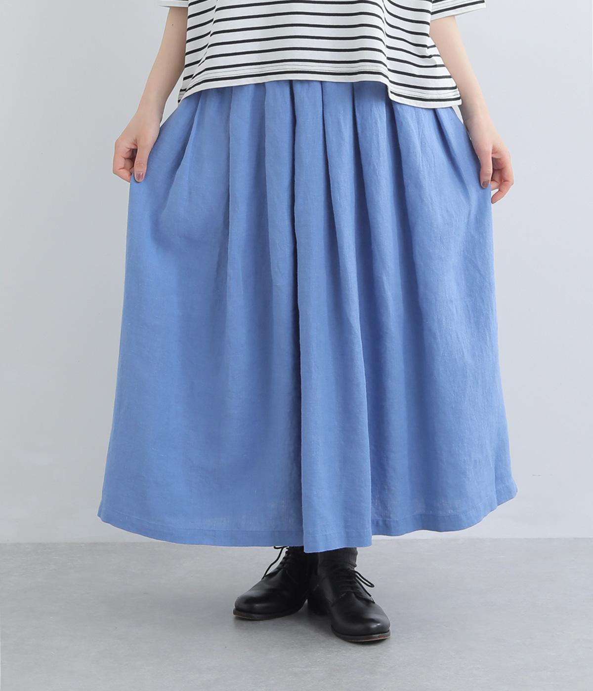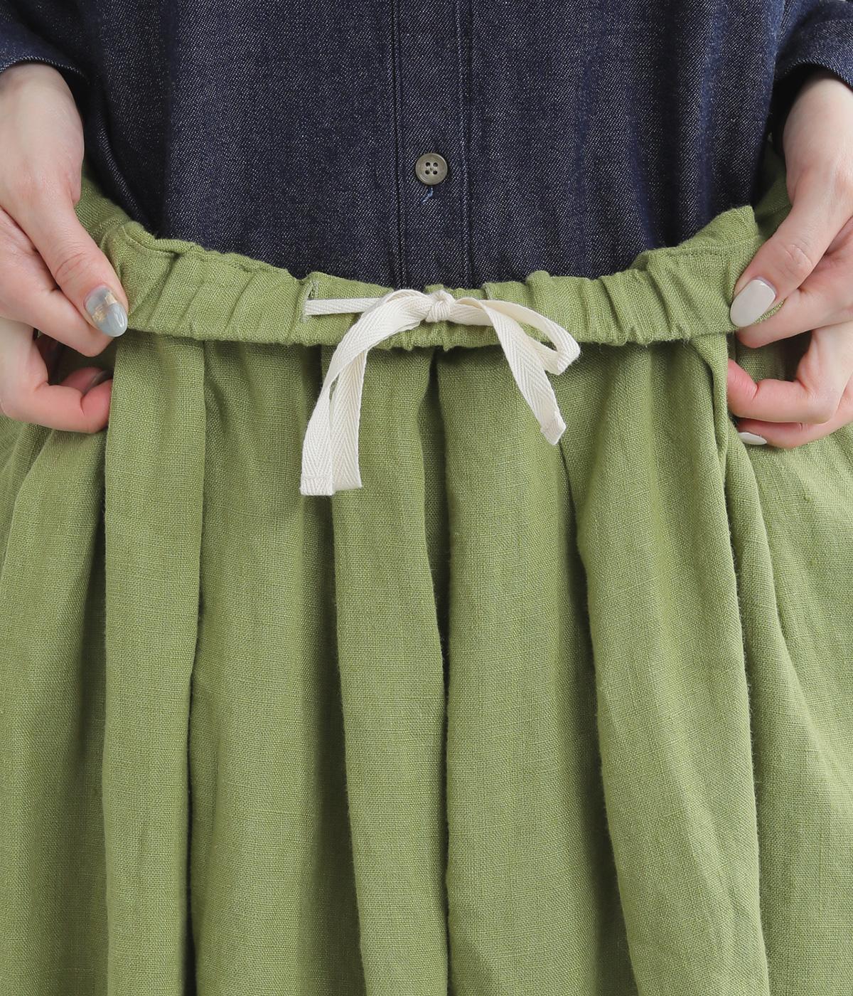 ウエストから入った複数のタックが自然な動きと立体感を生むロングスカート。ふわりと揺れるようなシルエットを演出してくれます。ウエストは総ゴム仕様で内紐つきです。