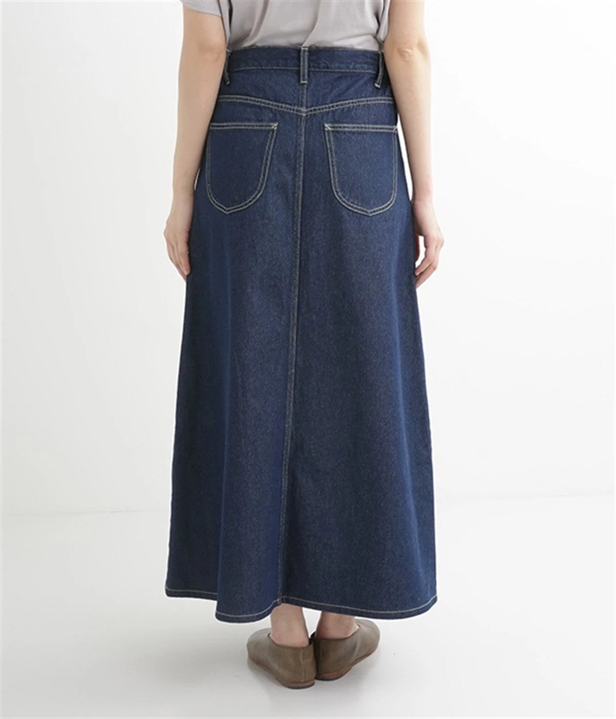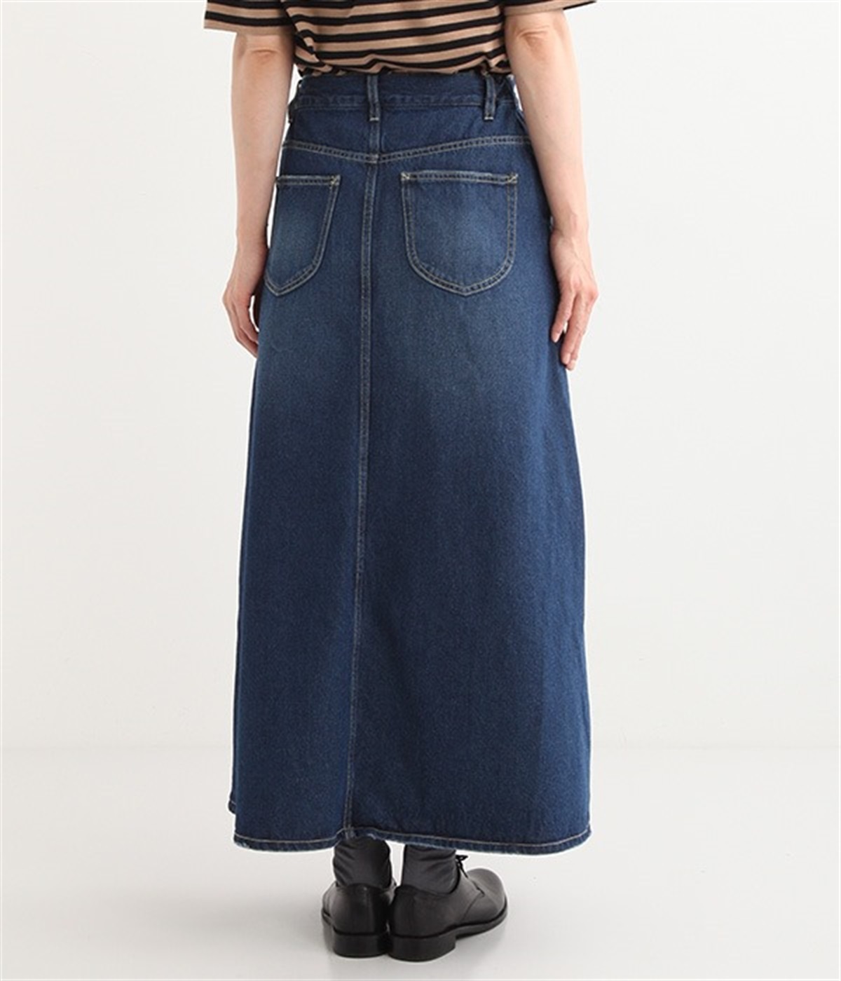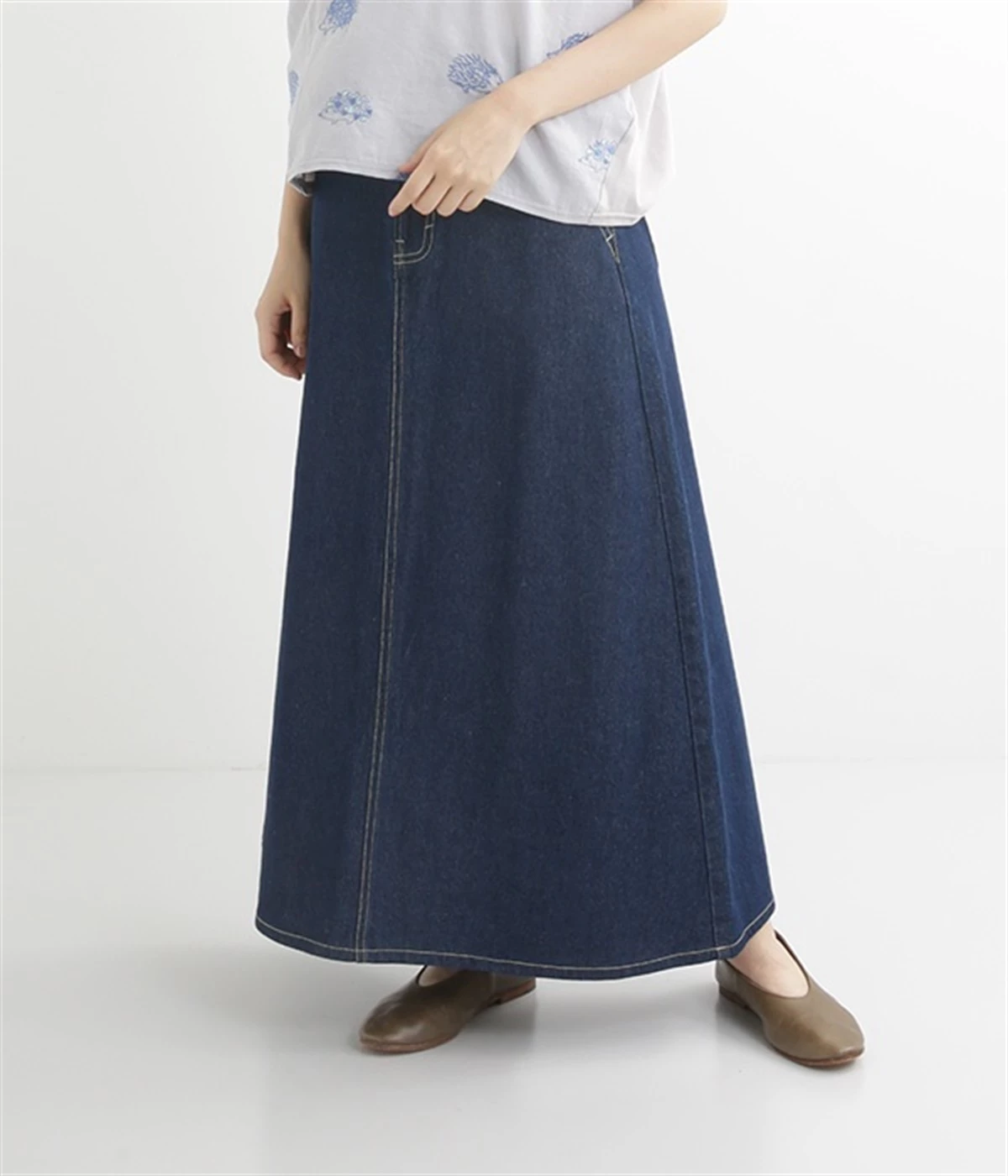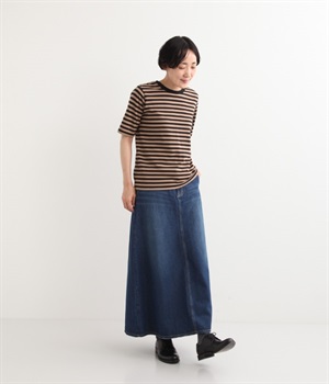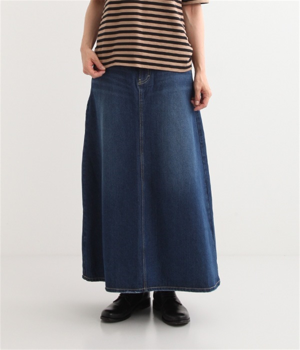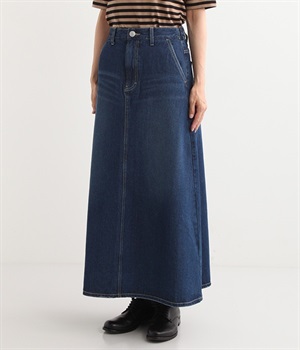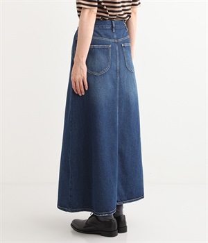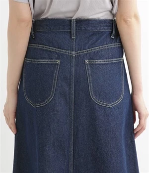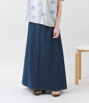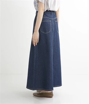 シンプルなデザインで合わせるトップスを選ばない、コットンデニム生地仕立てのロングスカートです。腰回りはスッキリさせつつ、裾にかけてゆるやかに広がるAラインシルエット。程よく厚みがありロングシーズン着回せます。ウエストにはベルトフープが付いているので、お手持ちのベルトでウエストマークしても◎。大人カジュアルにふさわしい、デイリーに活躍する一着です。