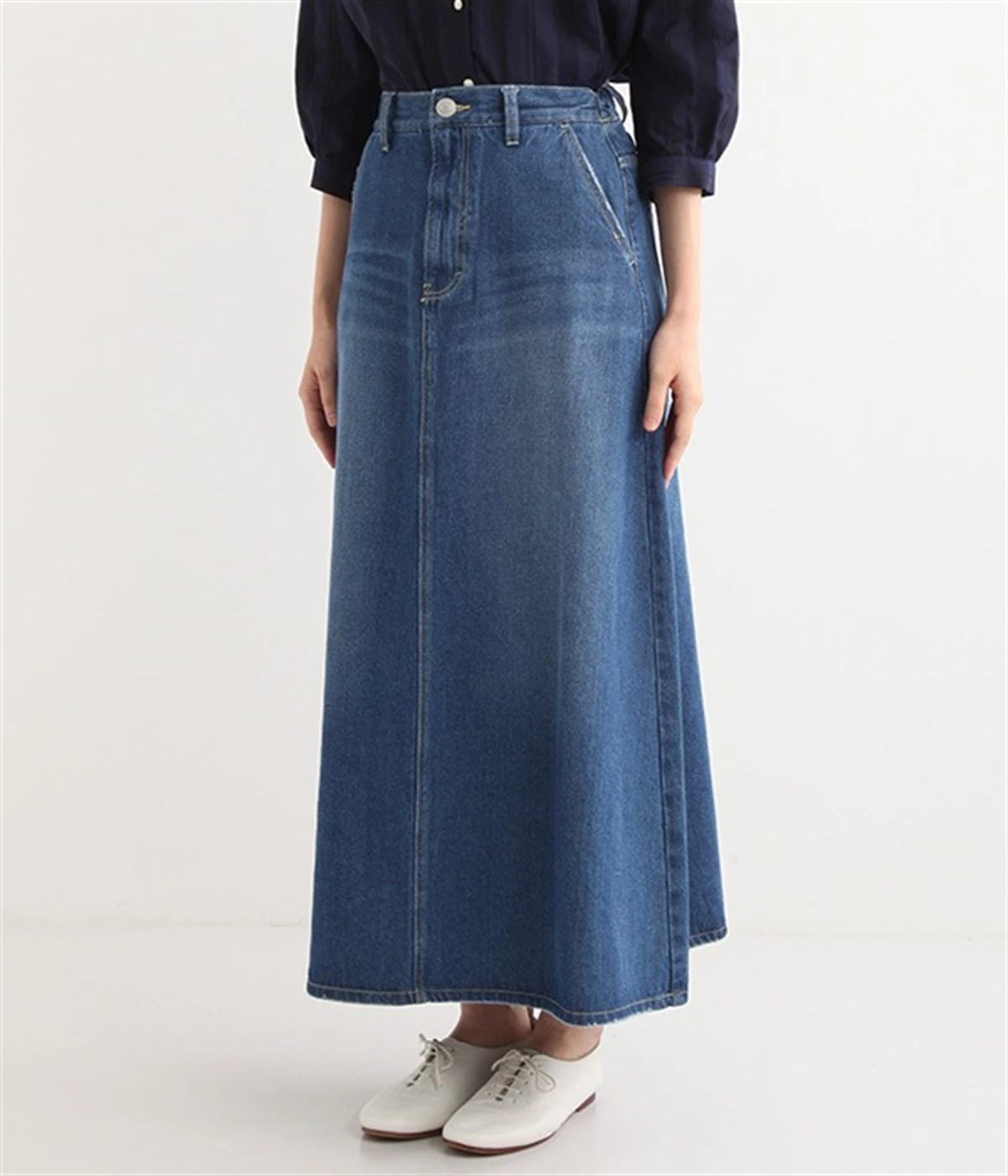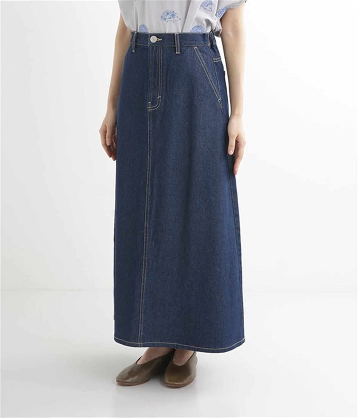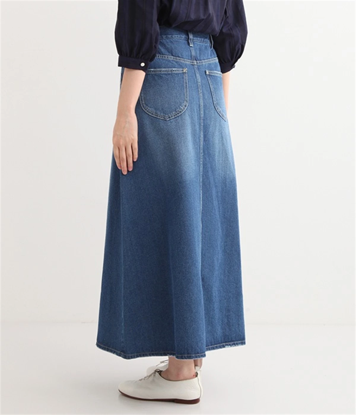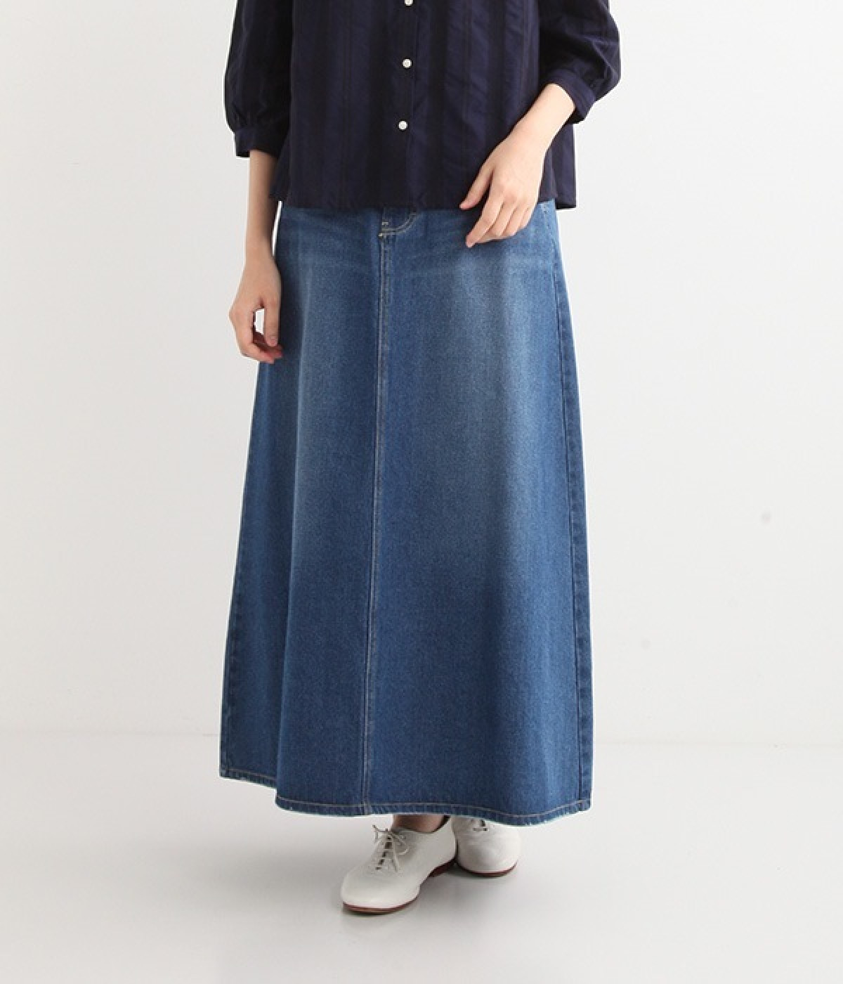 シンプルなデザインで合わせるトップスを選ばない、コットンデニム生地仕立てのロングスカートです。腰回りはスッキリさせつつ、裾にかけてゆるやかに広がるAラインシルエット。程よく厚みがありロングシーズン着回せます。ウエストにはベルトフープが付いているので、お手持ちのベルトでウエストマークしても◎。大人カジュアルにふさわしい、デイリーに活躍する一着です。