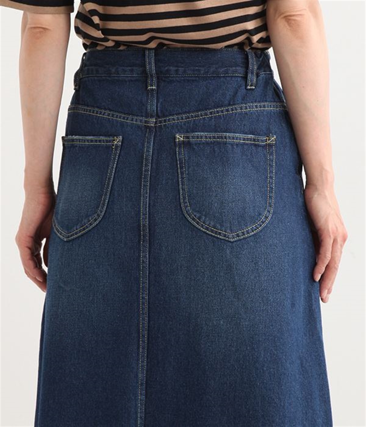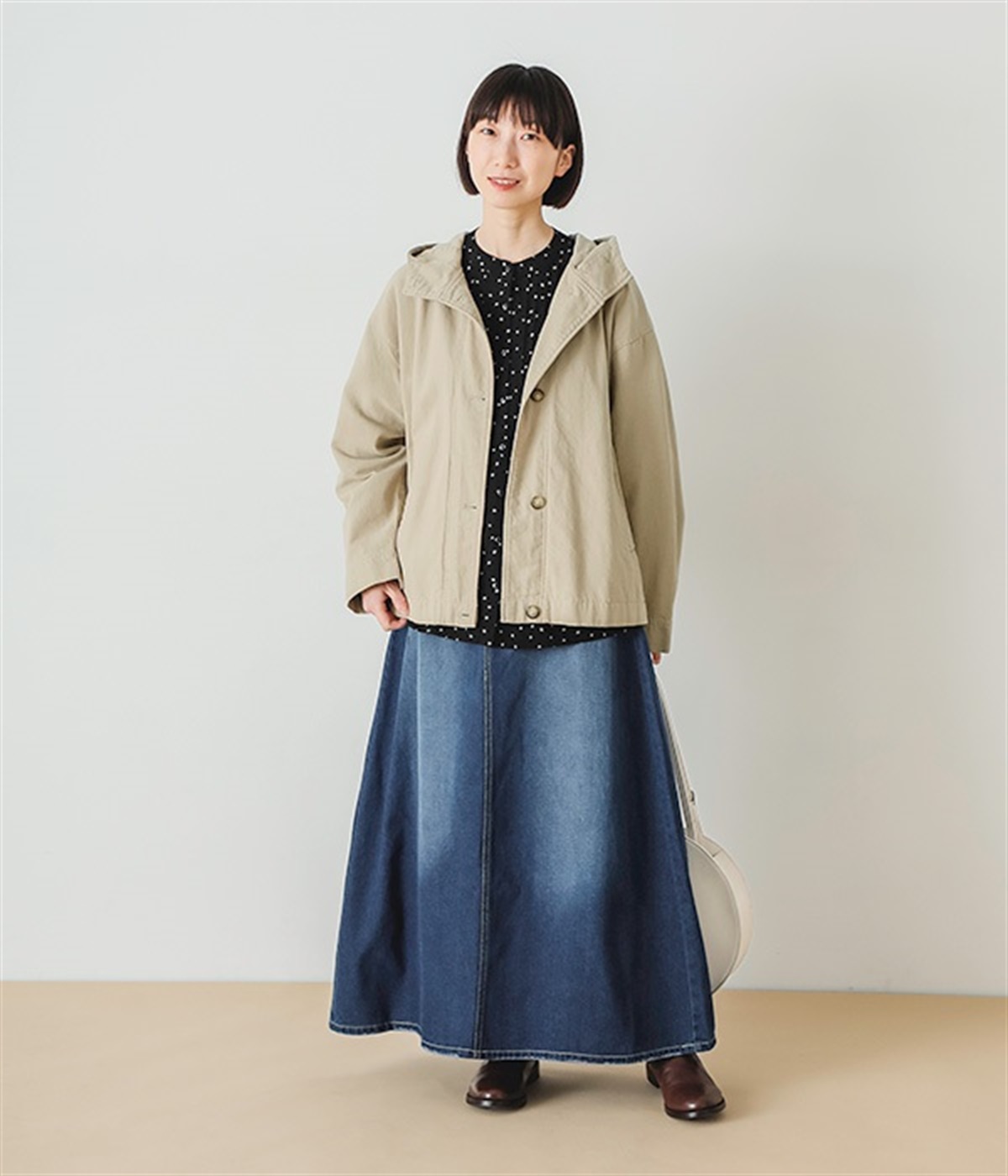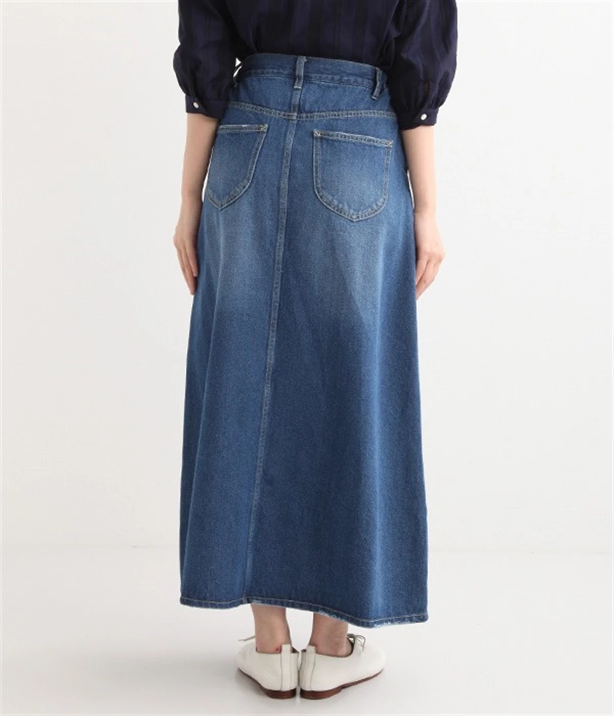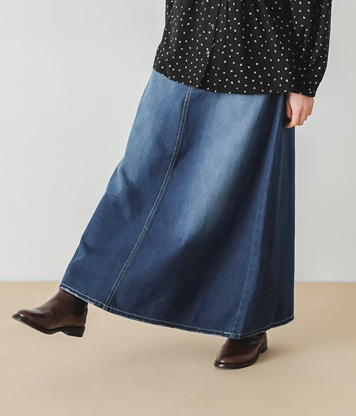 シンプルなデザインで合わせるトップスを選ばない、コットンデニム生地仕立てのロングスカートです。腰回りはスッキリさせつつ、裾にかけてゆるやかに広がるAラインシルエット。程よく厚みがありロングシーズン着回せます。ウエストにはベルトフープが付いているので、お手持ちのベルトでウエストマークしても◎。大人カジュアルにふさわしい、デイリーに活躍する一着です。
