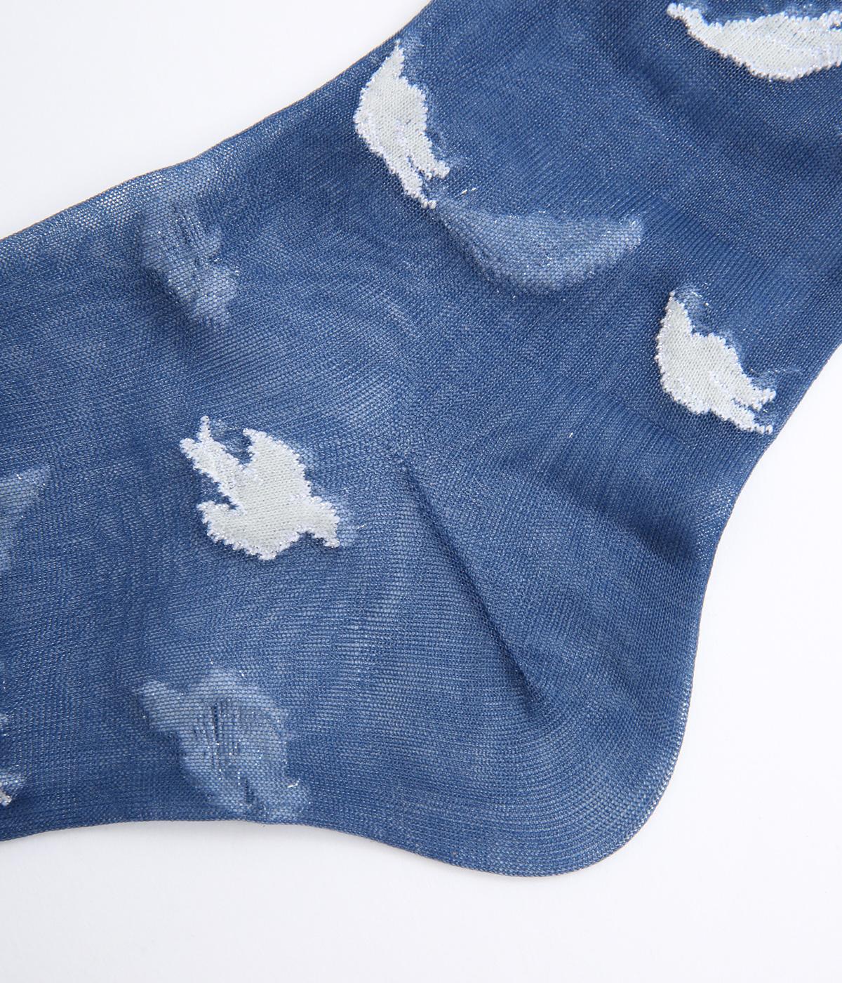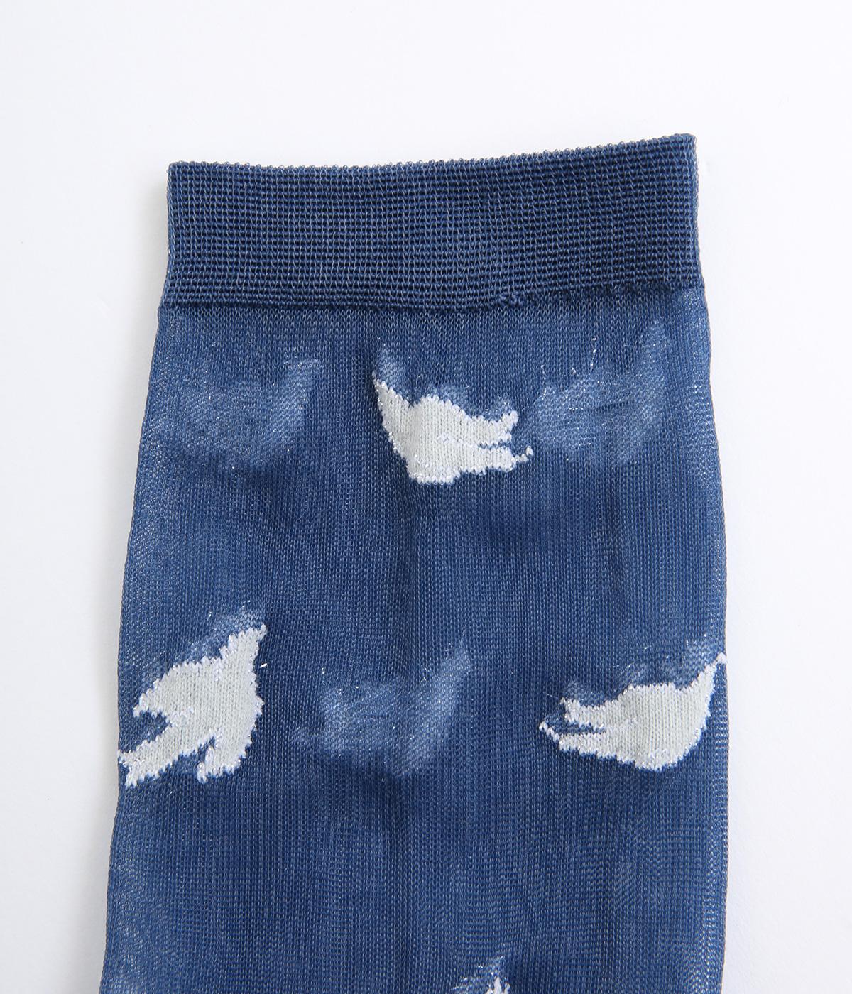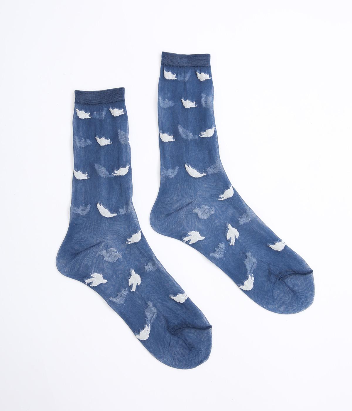 夜空が濃くなる一歩手前のような、明るさと深さが滲みあう夕刻の空を飛ぶ鳥を表現したようなソックス。ほんのり肌が透けるシアー素材にすることで、キャッチーなモチーフもすっかり大人顔に。いつものスタイリングもすこし特別になる一足です。