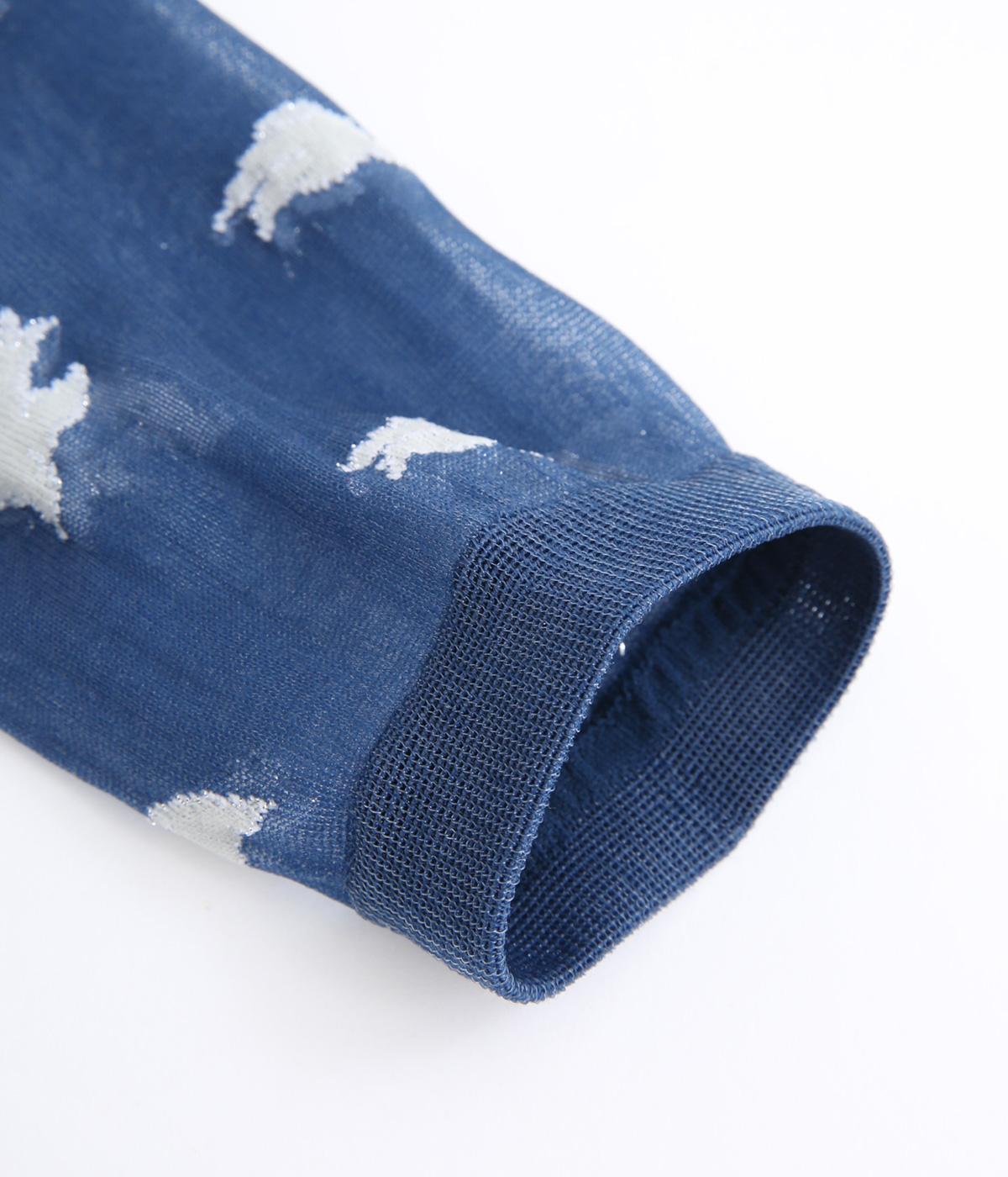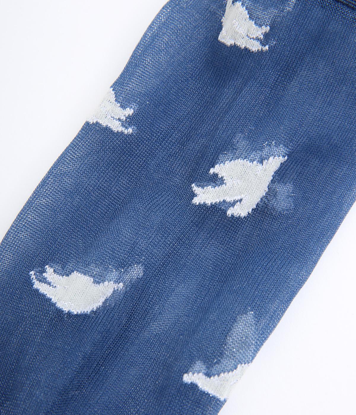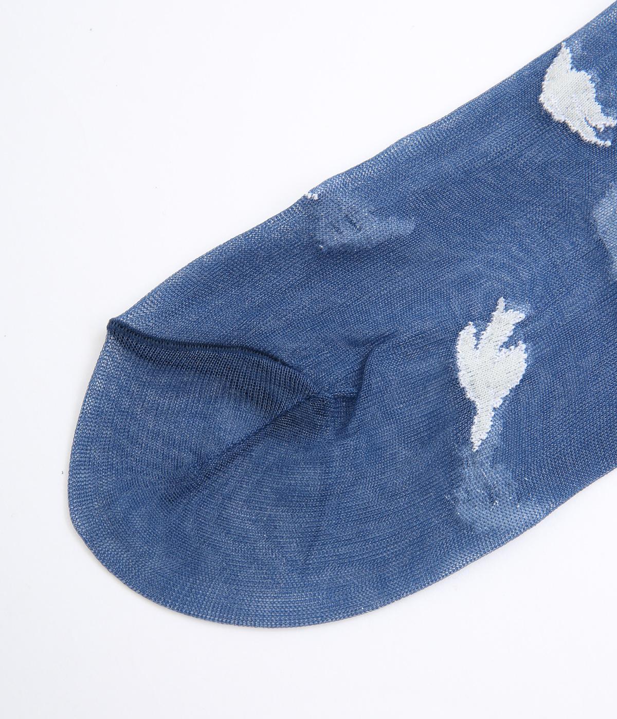 夜空が濃くなる一歩手前のような、明るさと深さが滲みあう夕刻の空を飛ぶ鳥を表現したようなソックス。ほんのり肌が透けるシアー素材にすることで、キャッチーなモチーフもすっかり大人顔に。いつものスタイリングもすこし特別になる一足です。