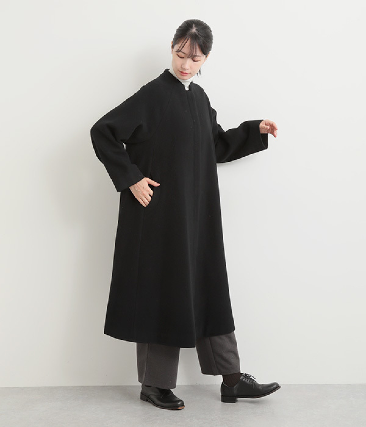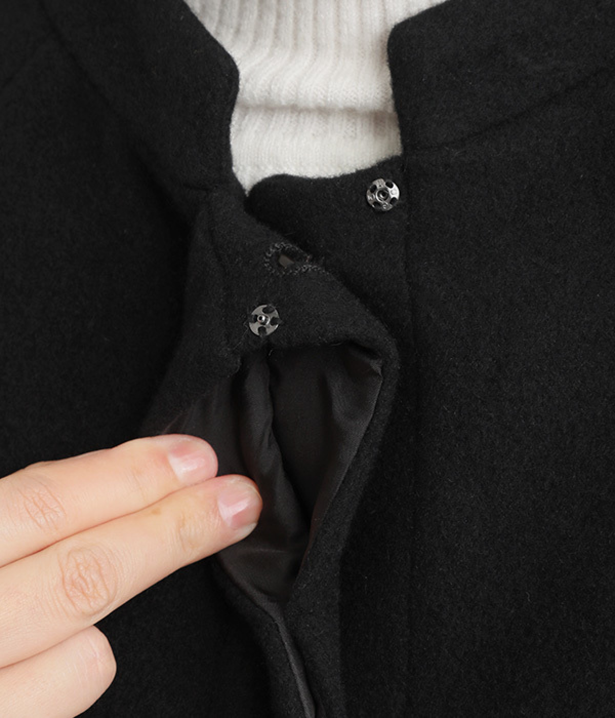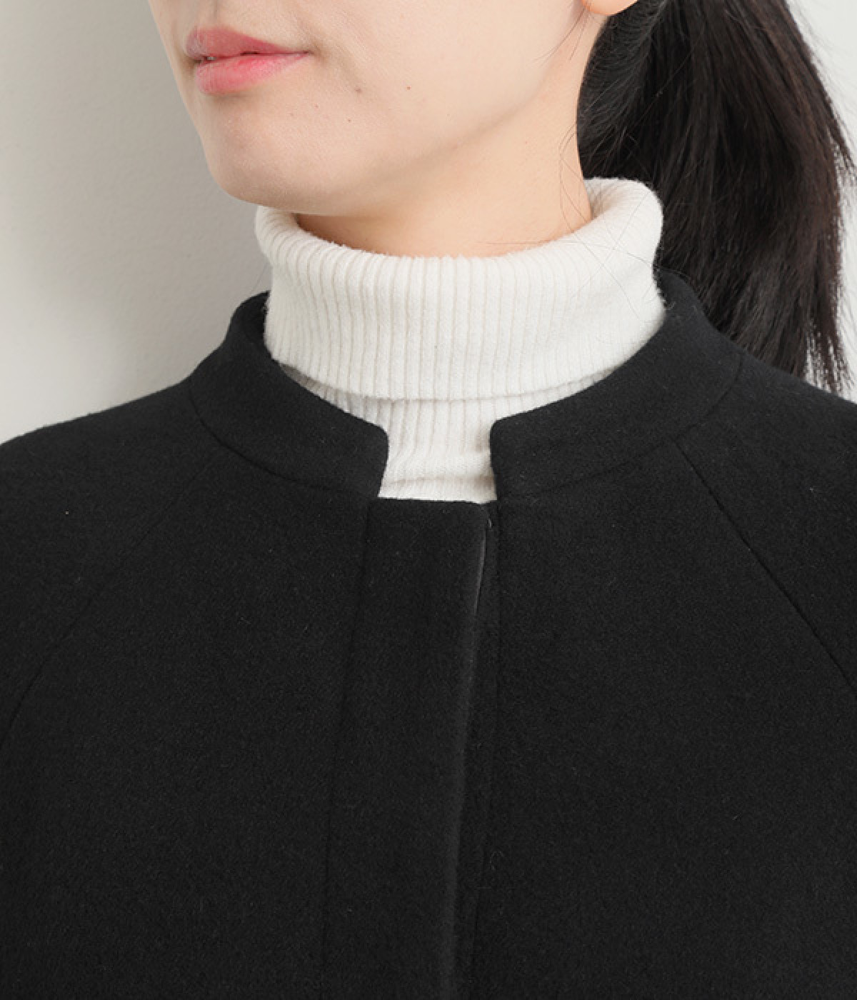 首元に寄り添う、控えめな立ち上がりのスタンド襟