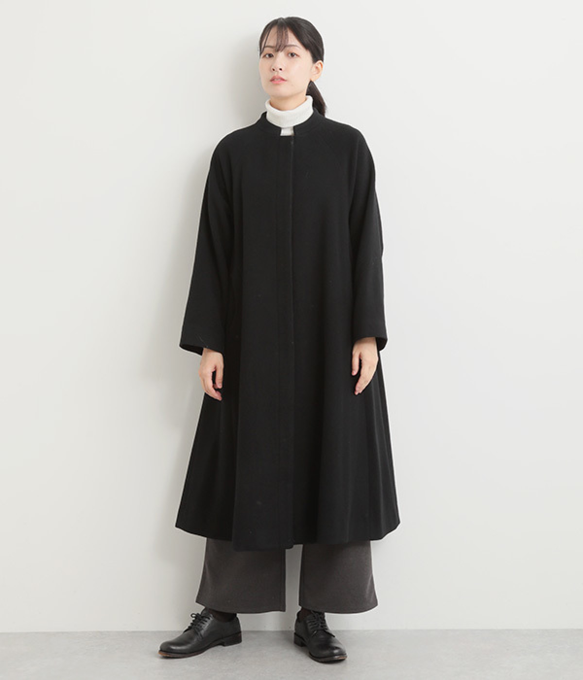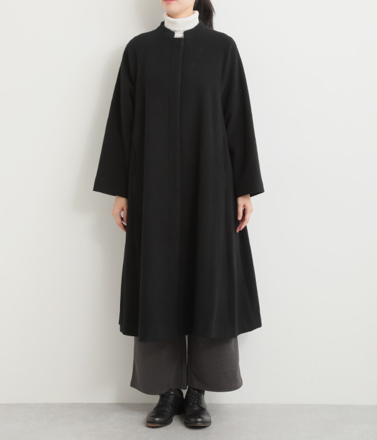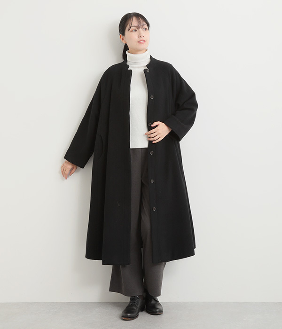 首元に寄り添う、控えめな立ち上がりのスタンド襟