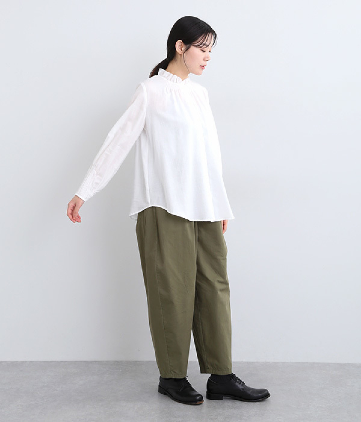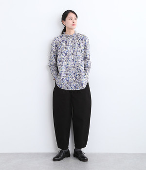 ラウンドさせた裾ラインでボトム合わせにも表情を