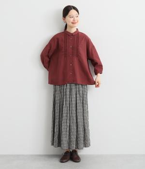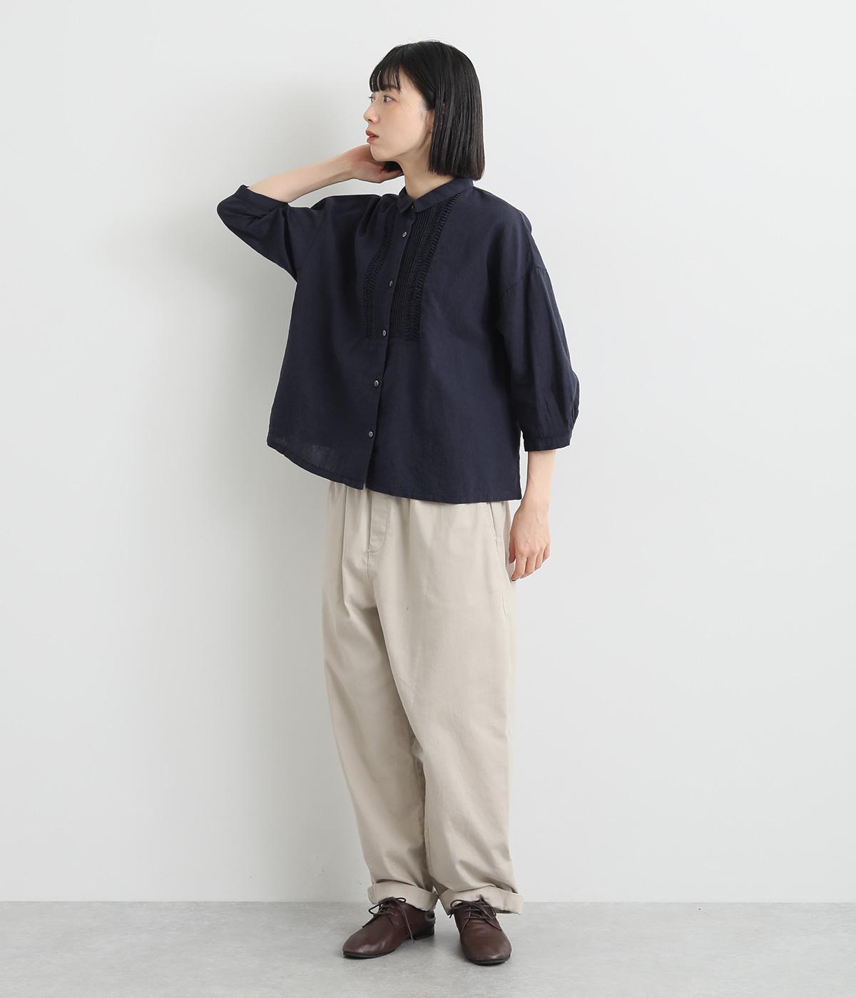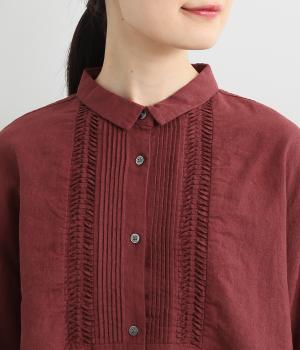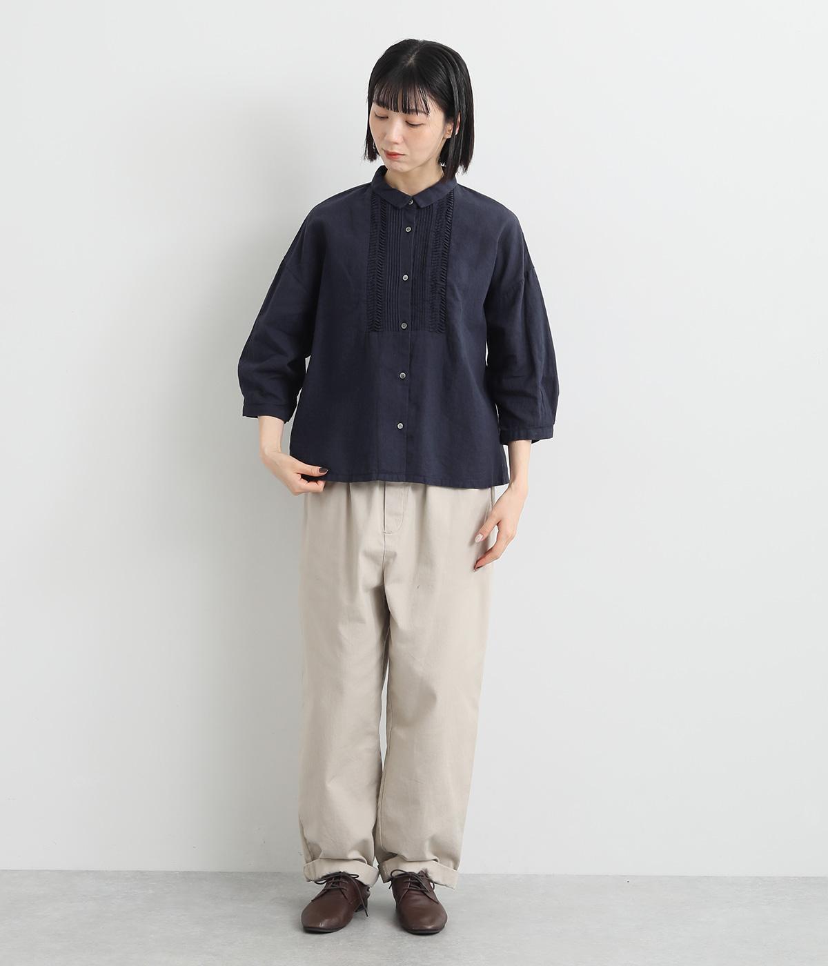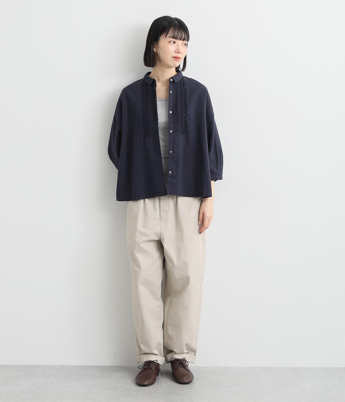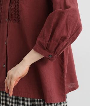 縦方向のすっきりとしたピンタックと、ひねりピンタックを組み合わせた前身頃のディテールが素敵。愛らしい小さな襟がきちんとした印象を与えてくれます。二の腕をカバーしつつ抜け感をプラスする、ひじがすっぽりと隠れる絶妙な袖丈もポイントです。