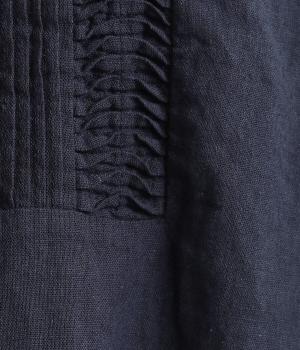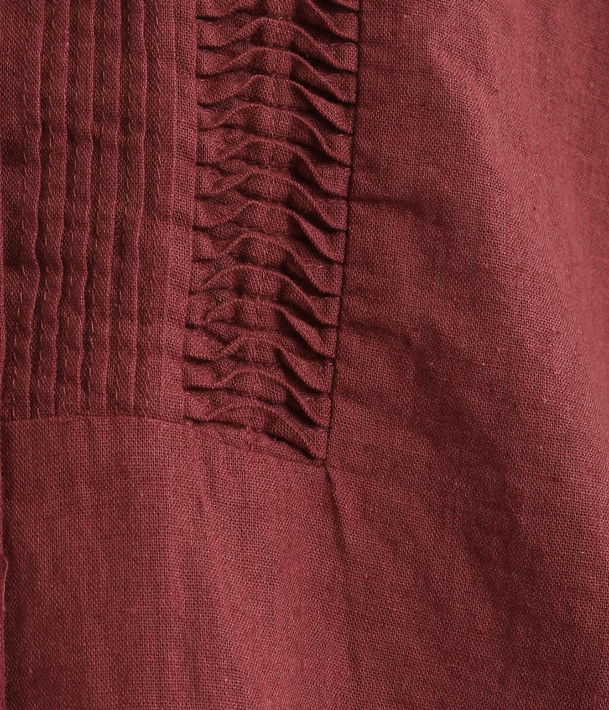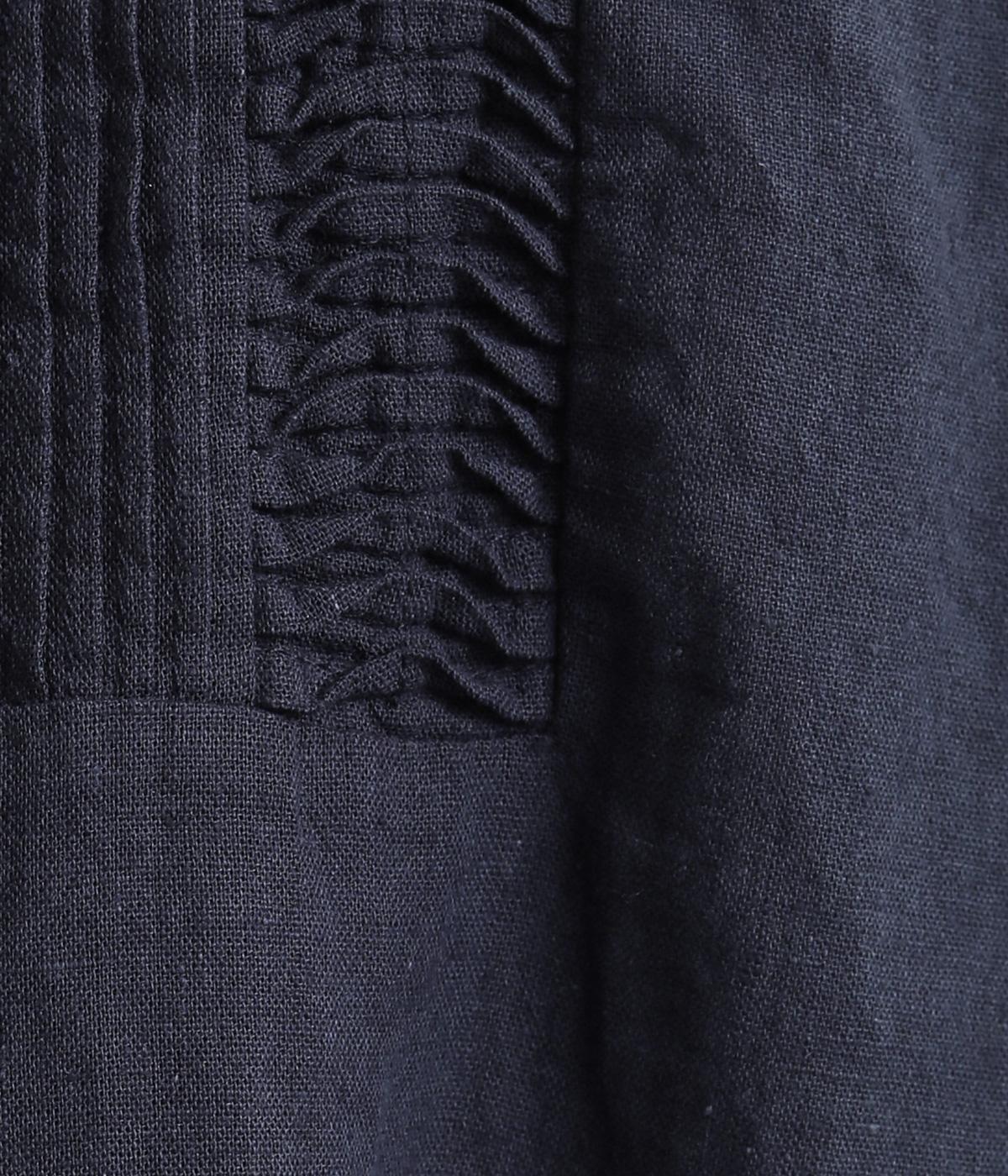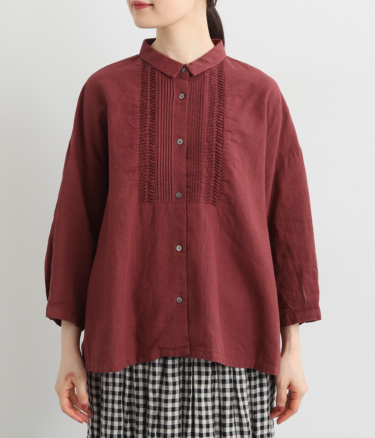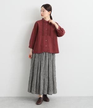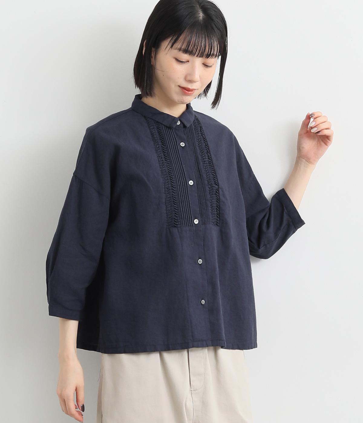 縦方向のすっきりとしたピンタックと、ひねりピンタックを組み合わせた前身頃のディテールが素敵。愛らしい小さな襟がきちんとした印象を与えてくれます。二の腕をカバーしつつ抜け感をプラスする、ひじがすっぽりと隠れる絶妙な袖丈もポイントです。