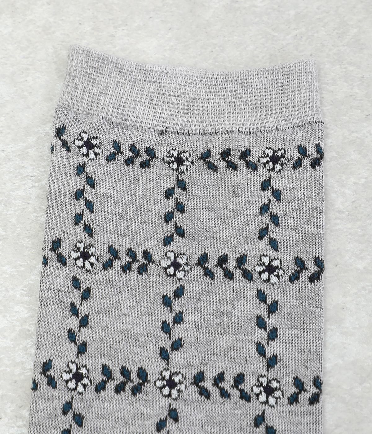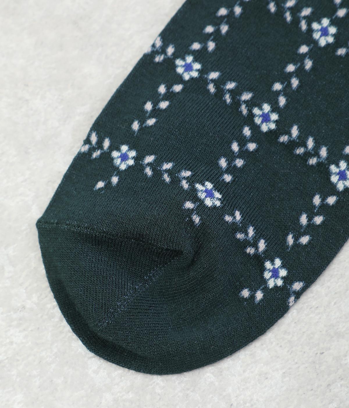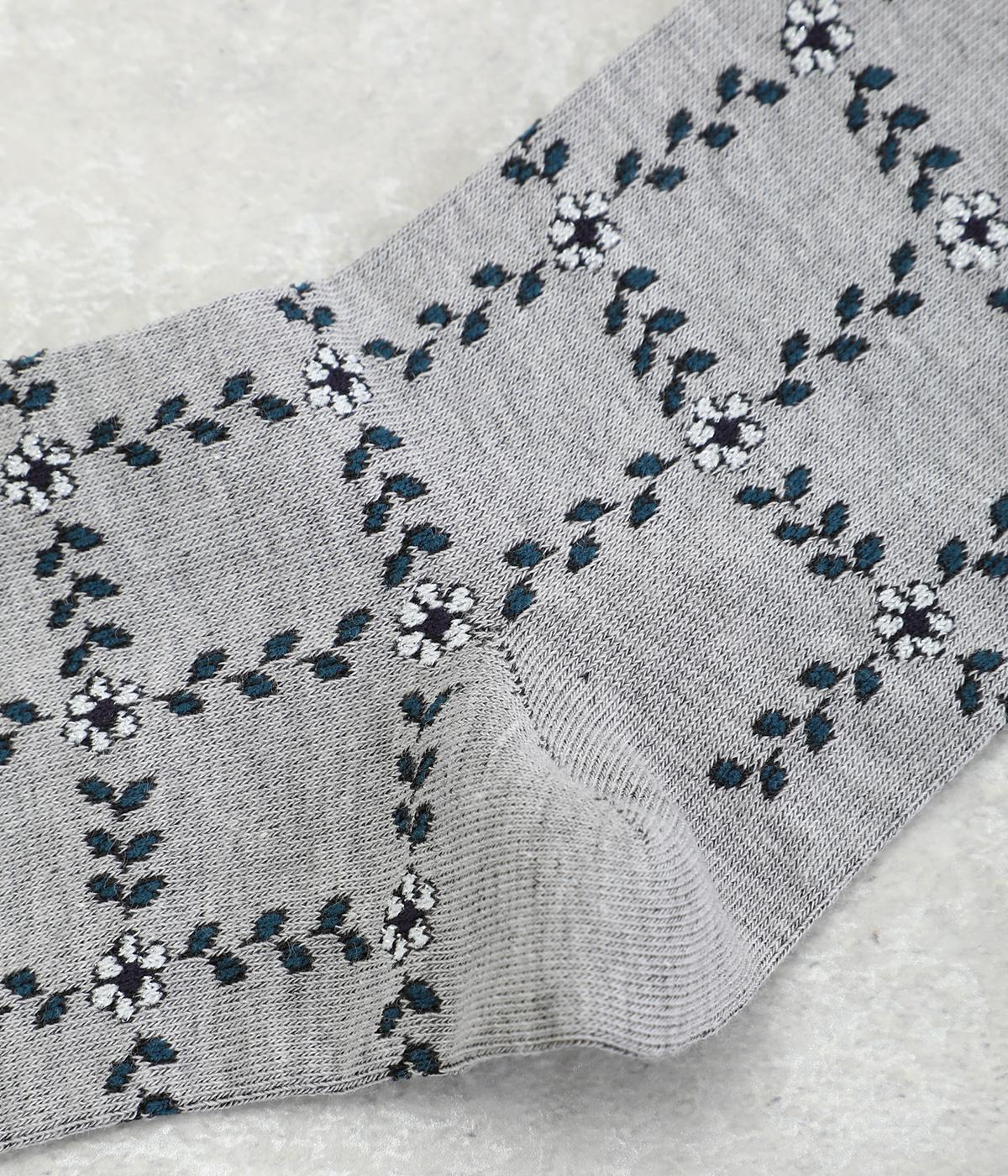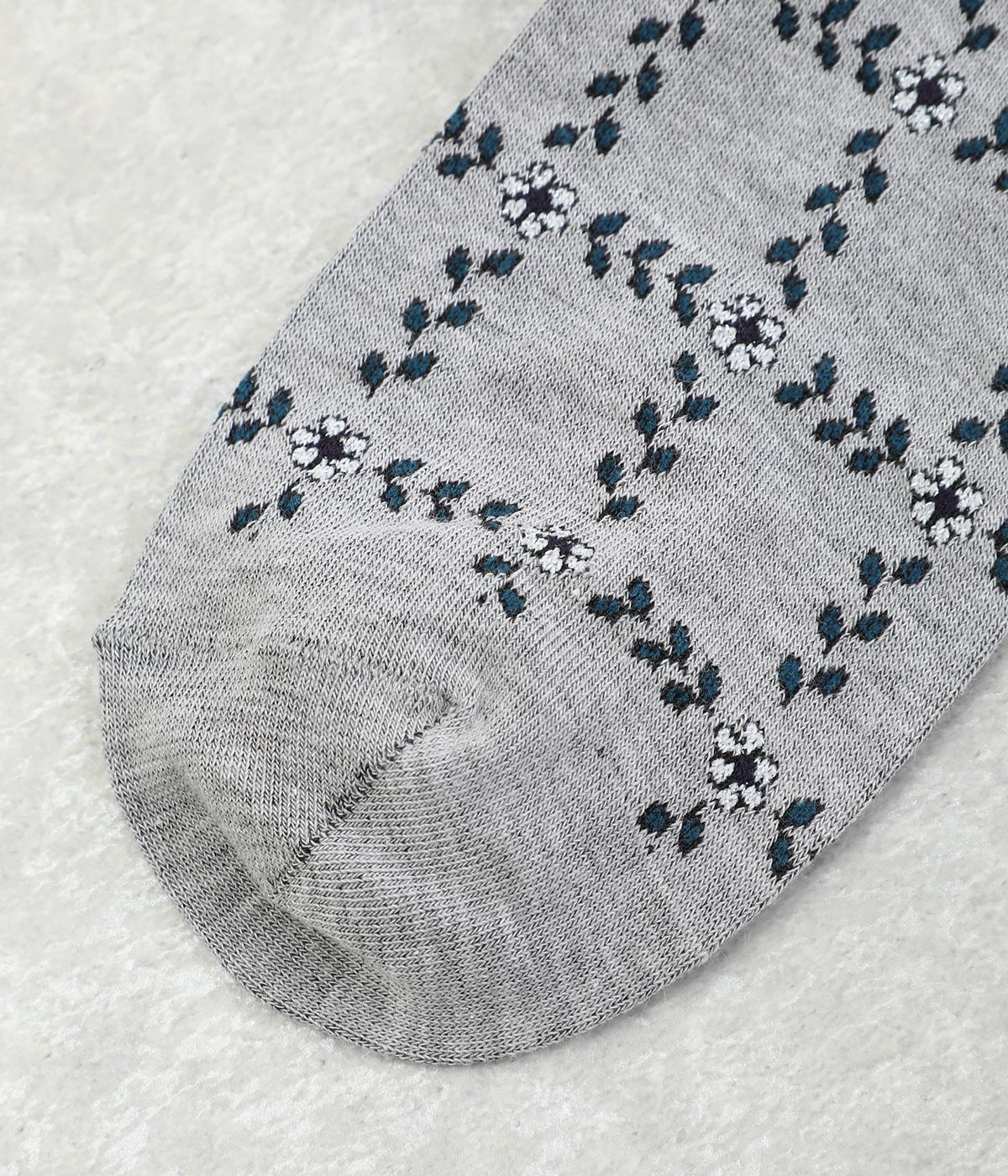 格子のなかに小さな花と葉を描いた、クラシカルな柄が印象的。どこかノスタルジックな雰囲気を漂わせつつも、色のトーンで大人らしさを演出しています。シンプルな装いに合わせるだけで、足元にやわらかな華やかさをプラス。ナチュラルコーデにもなじむ、上品な一足です。