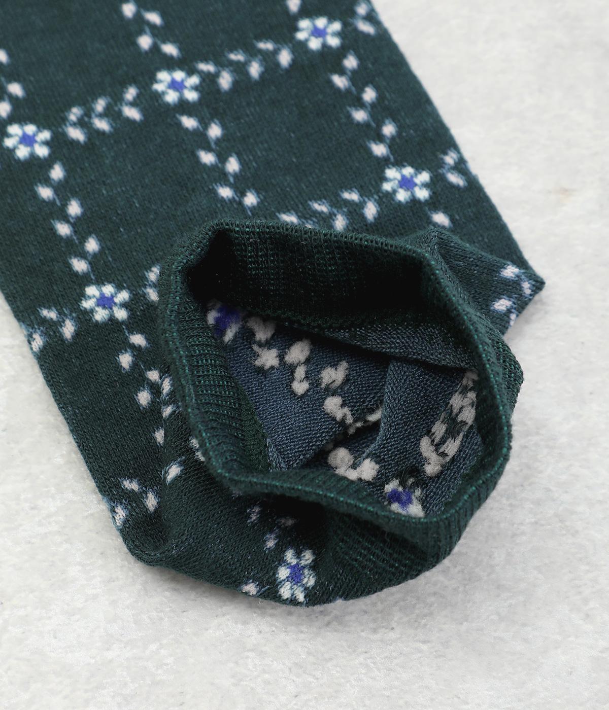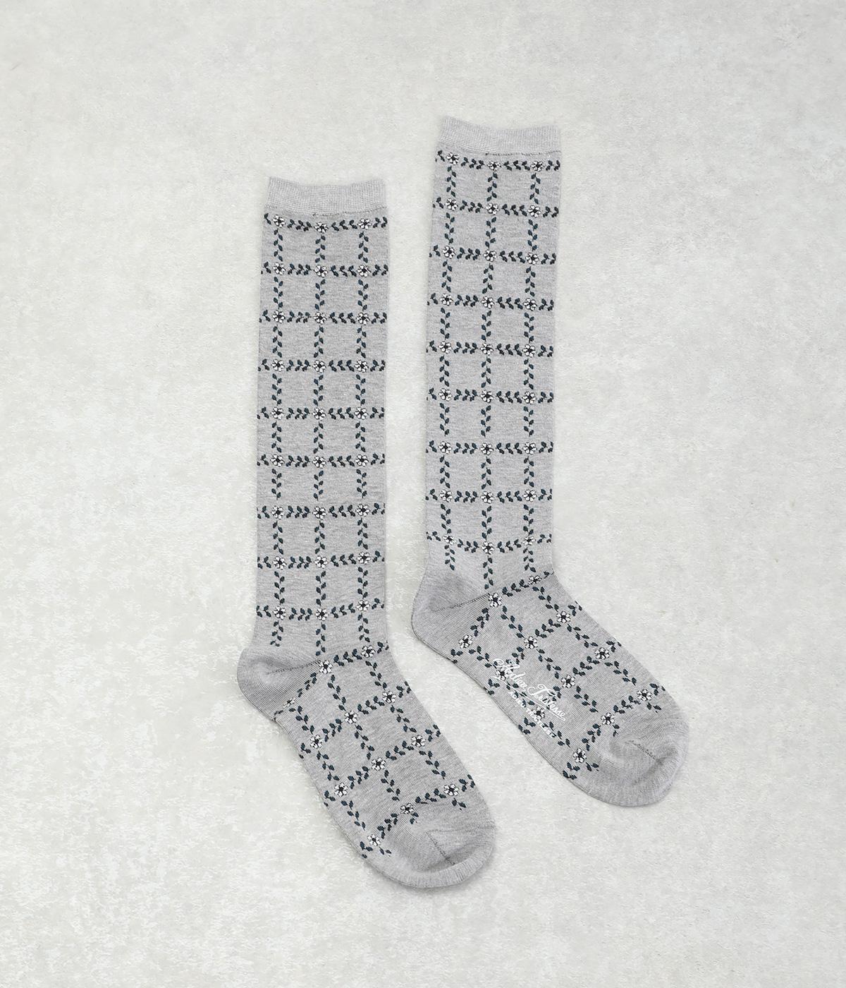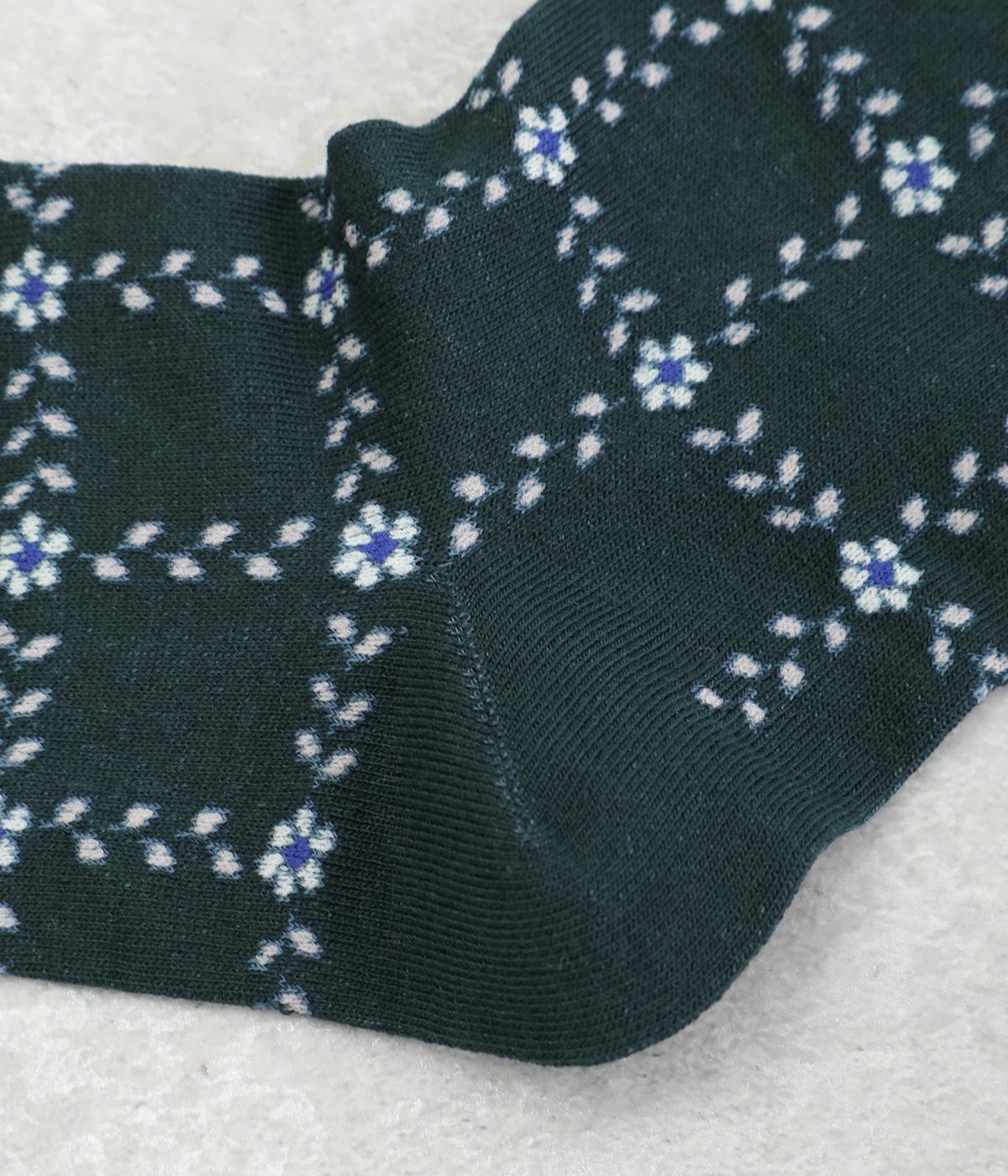 格子のなかに小さな花と葉を描いた、クラシカルな柄が印象的。どこかノスタルジックな雰囲気を漂わせつつも、色のトーンで大人らしさを演出しています。シンプルな装いに合わせるだけで、足元にやわらかな華やかさをプラス。ナチュラルコーデにもなじむ、上品な一足です。