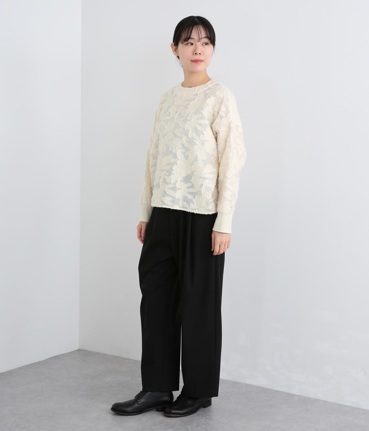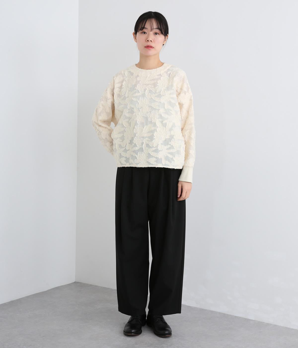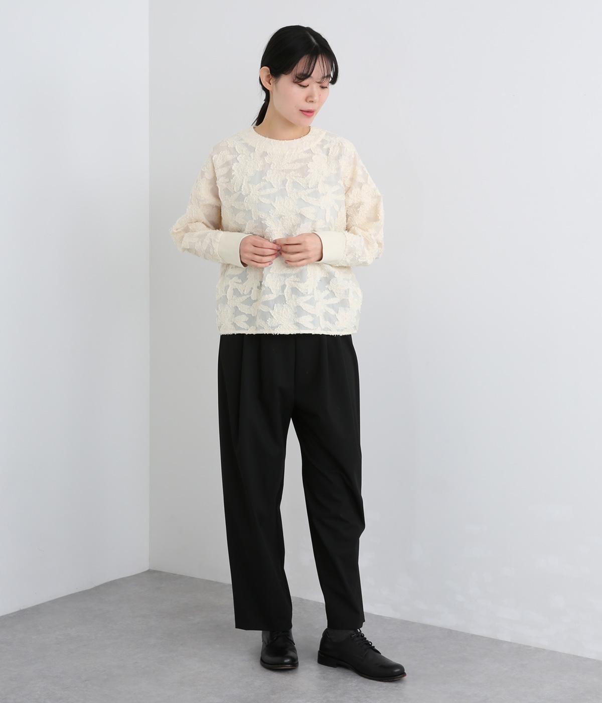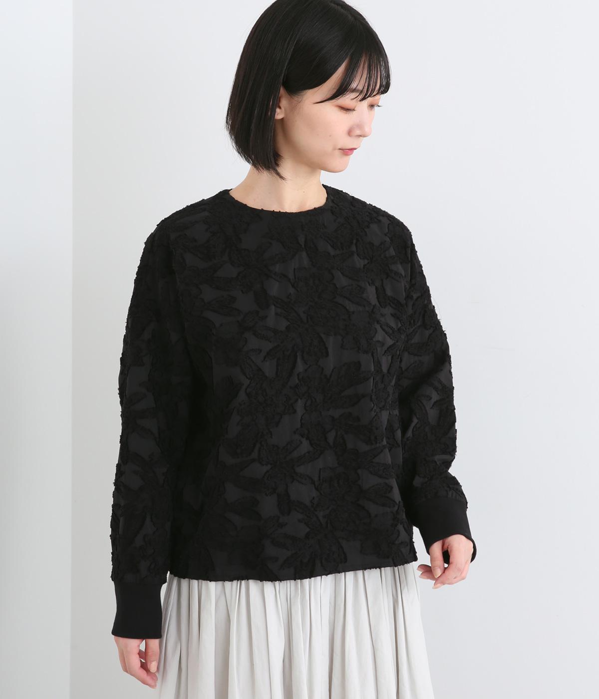一枚で着るだけでパッと華やかな印象を添えるジャカードブラウス。袖口にはリブを合わせて着やすさも確保しました。オケージョンにはもちろん、デニムなどと合わせてカジュアルダウンするスタイリングもおすすめです。