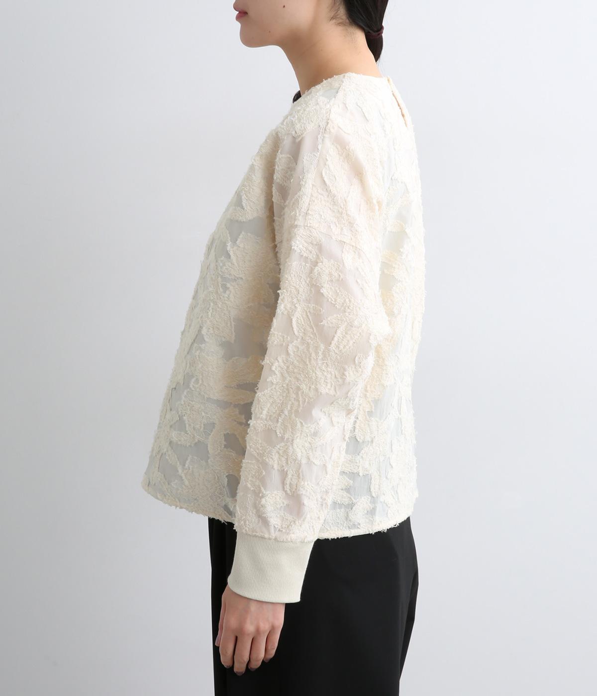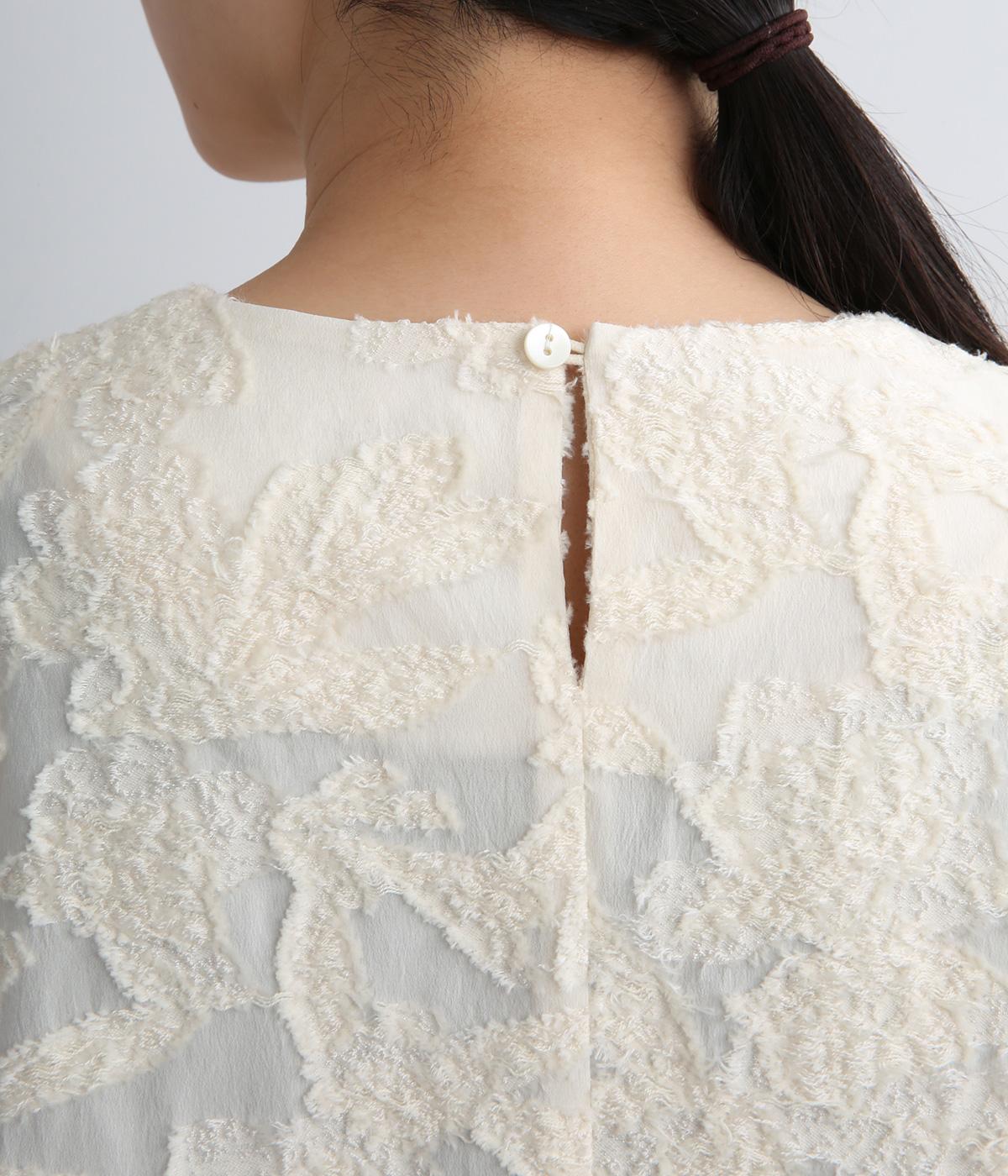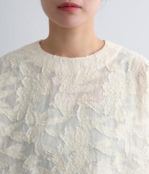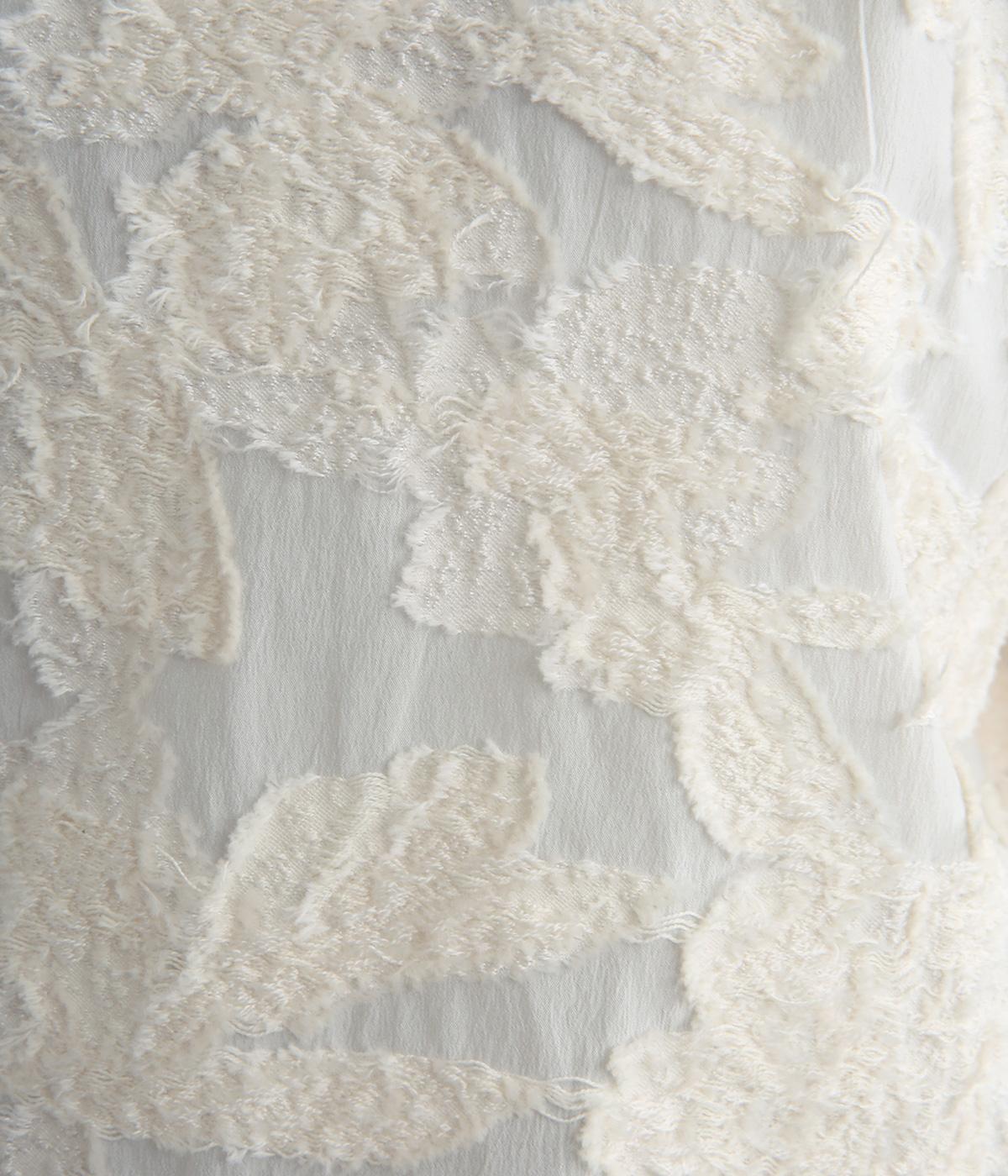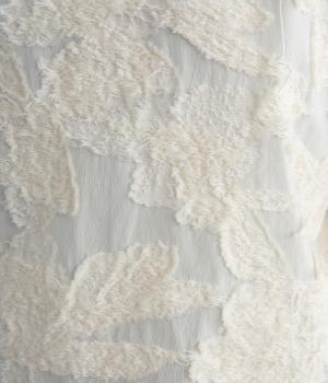 上品な透け感とほどよい光沢が華やかなカットジャカード生地を使用しています。しっかりとしたハリが素材のコントラストを引き立てて、奥行きのある雰囲気をつくっています。