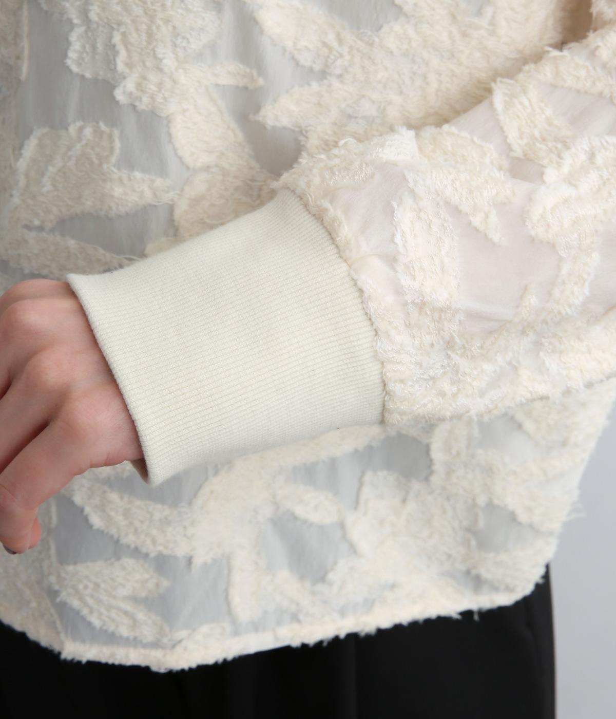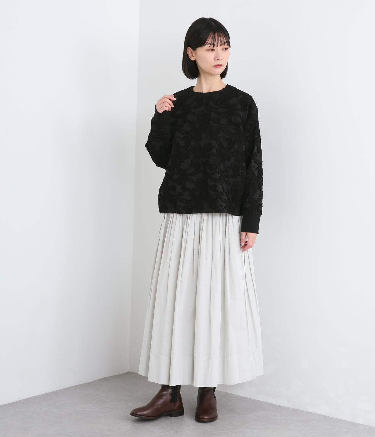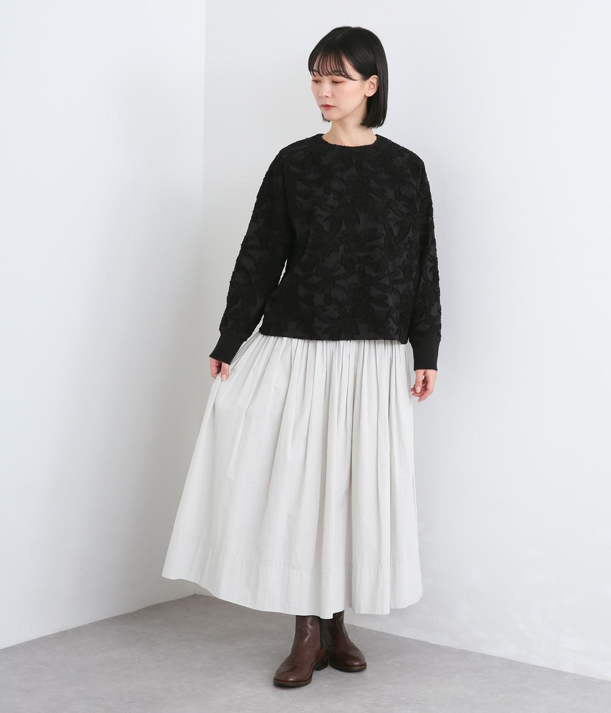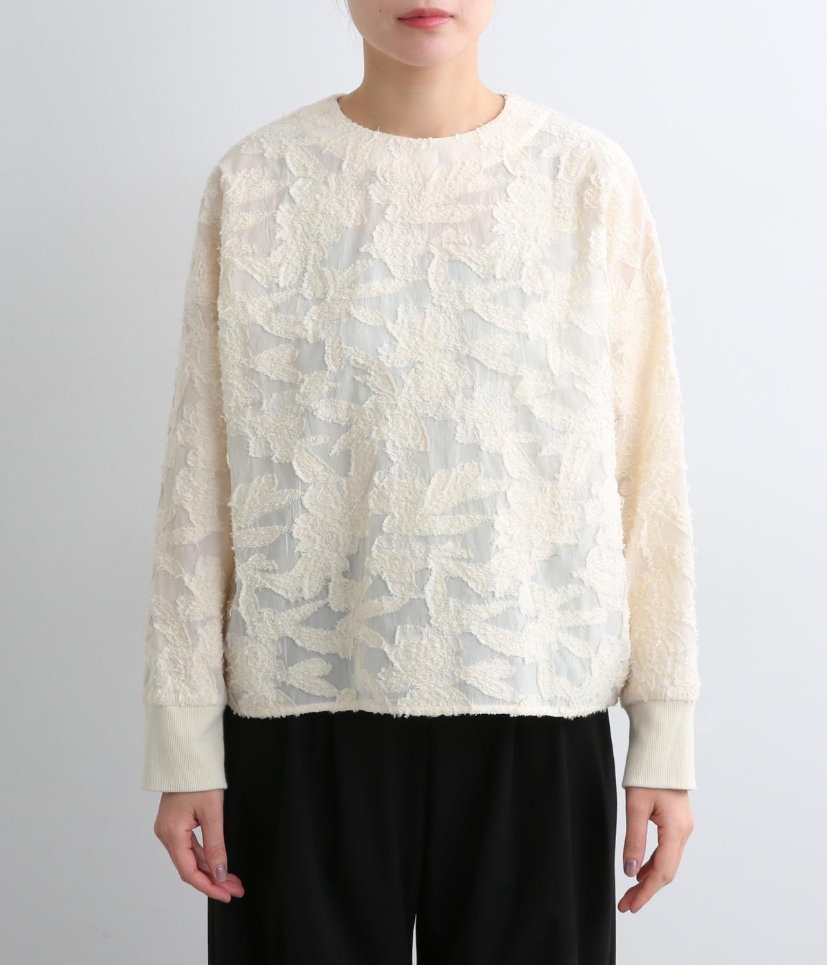 上品な透け感とほどよい光沢が華やかなカットジャカード生地を使用しています。しっかりとしたハリが素材のコントラストを引き立てて、奥行きのある雰囲気をつくっています。