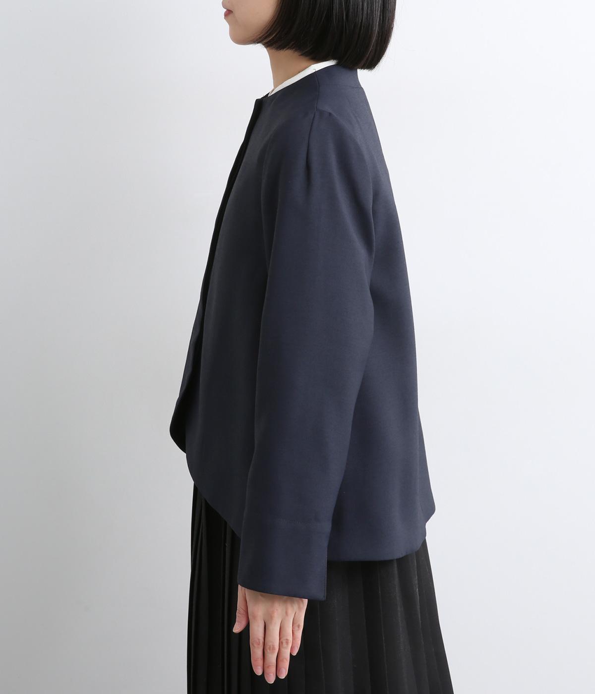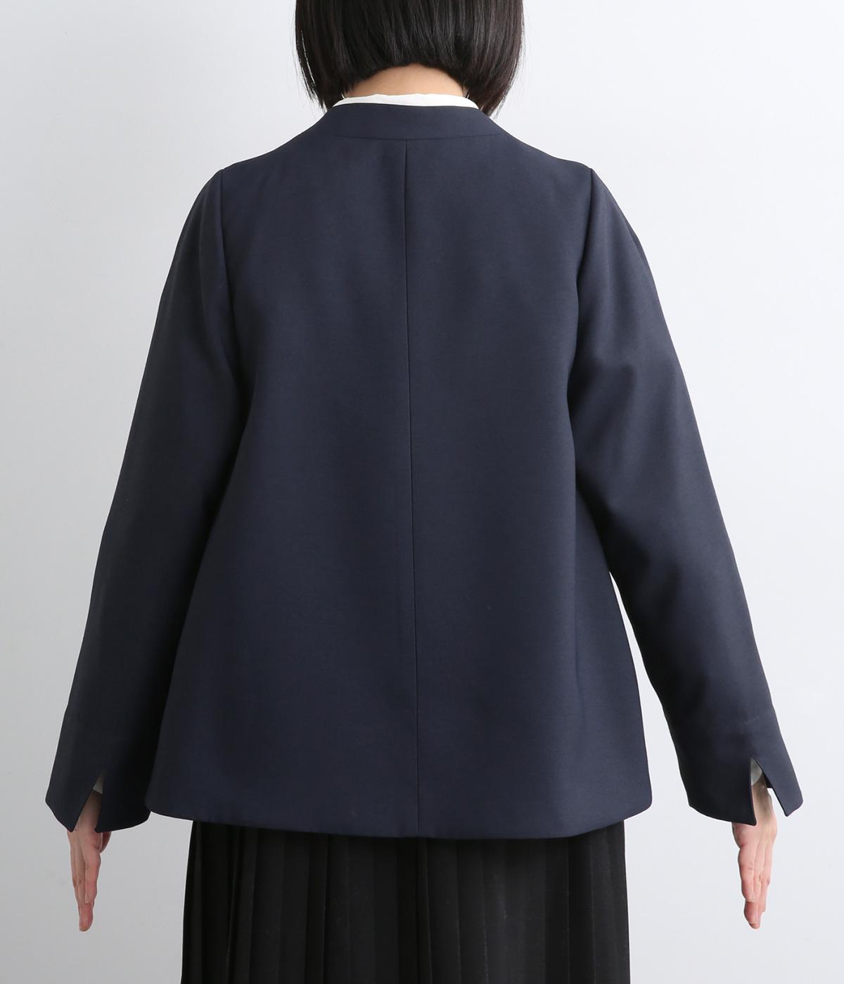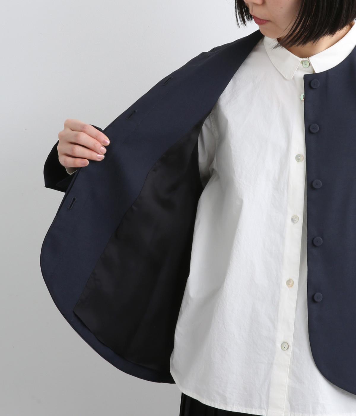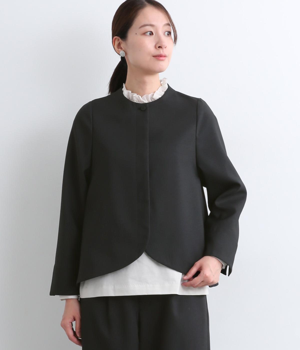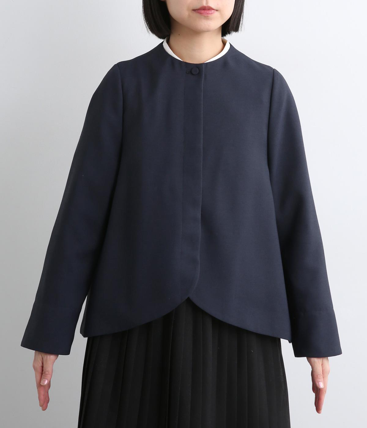 前中心から裾に向けてカーブさせたヘムラインが特徴的なジャケット。品のいいノーカラーできちんとした装いが得意ながらも適度に抜け感があり、袖口を折り返せばこなれ感も演出。同素材のボトムを合わせたセットアップスタイルもおすすめです。