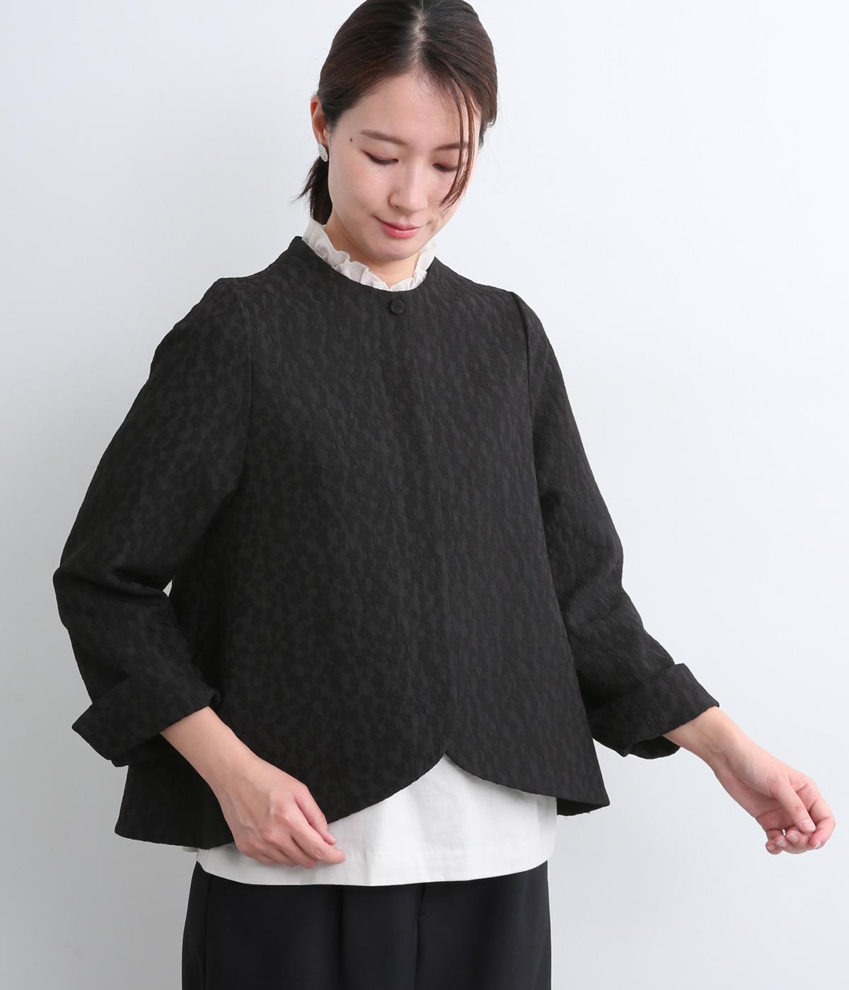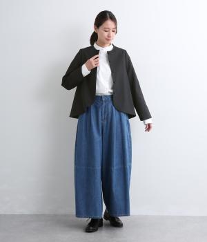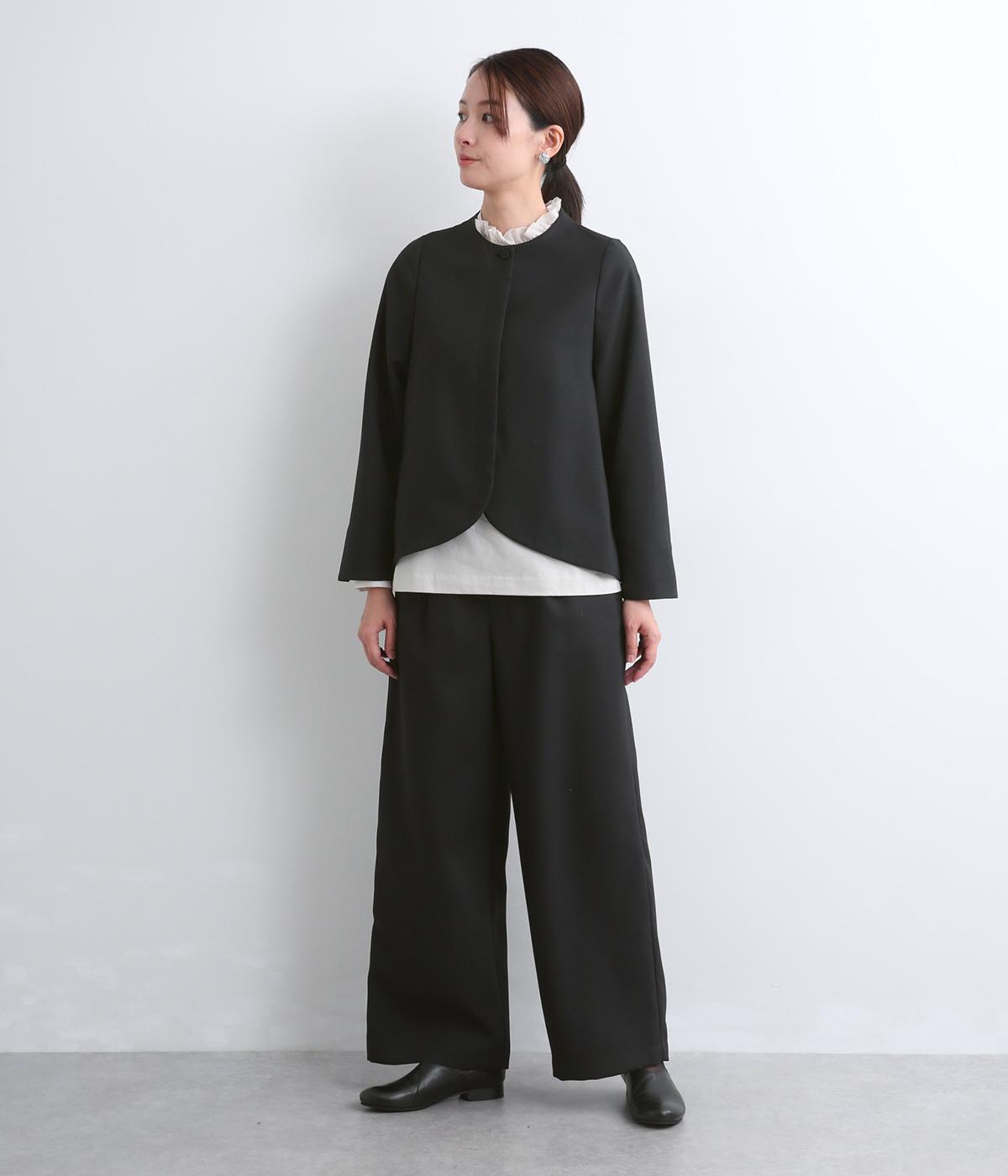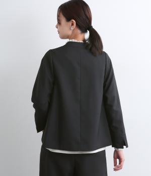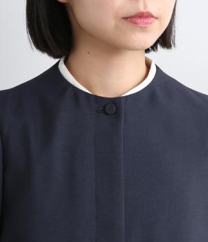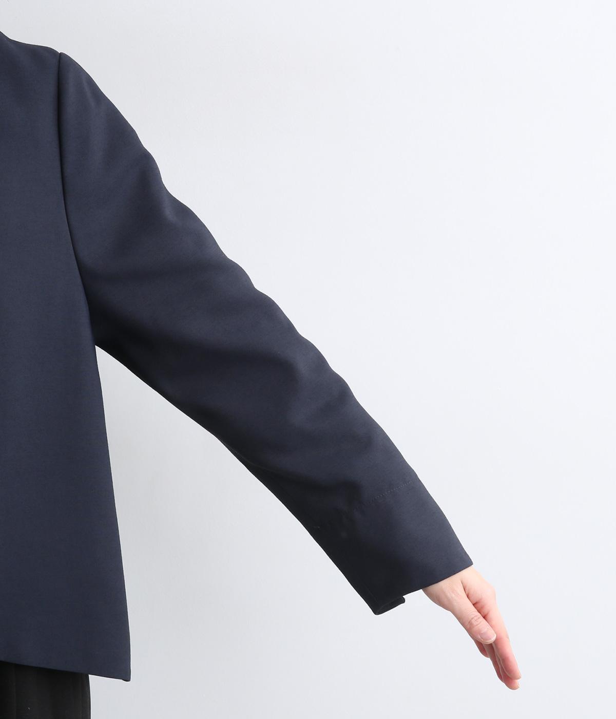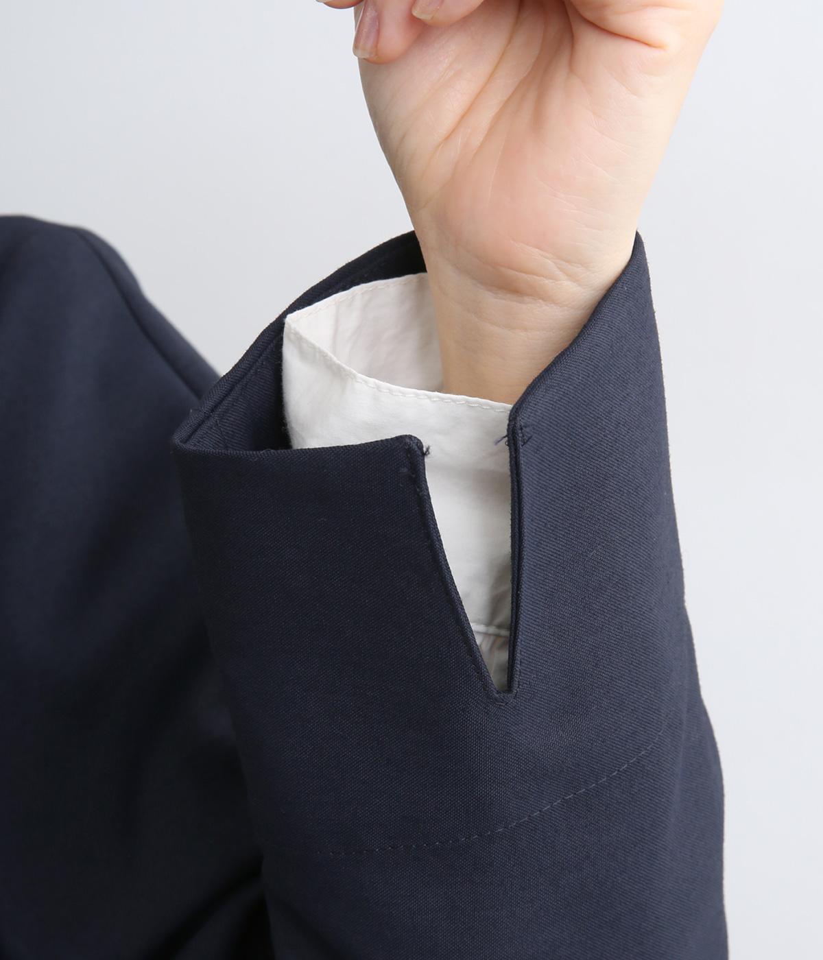 前中心から裾に向けてカーブさせたヘムラインが特徴的なジャケット。品のいいノーカラーできちんとした装いが得意ながらも適度に抜け感があり、袖口を折り返せばこなれ感も演出。同素材のボトムを合わせたセットアップスタイルもおすすめです。