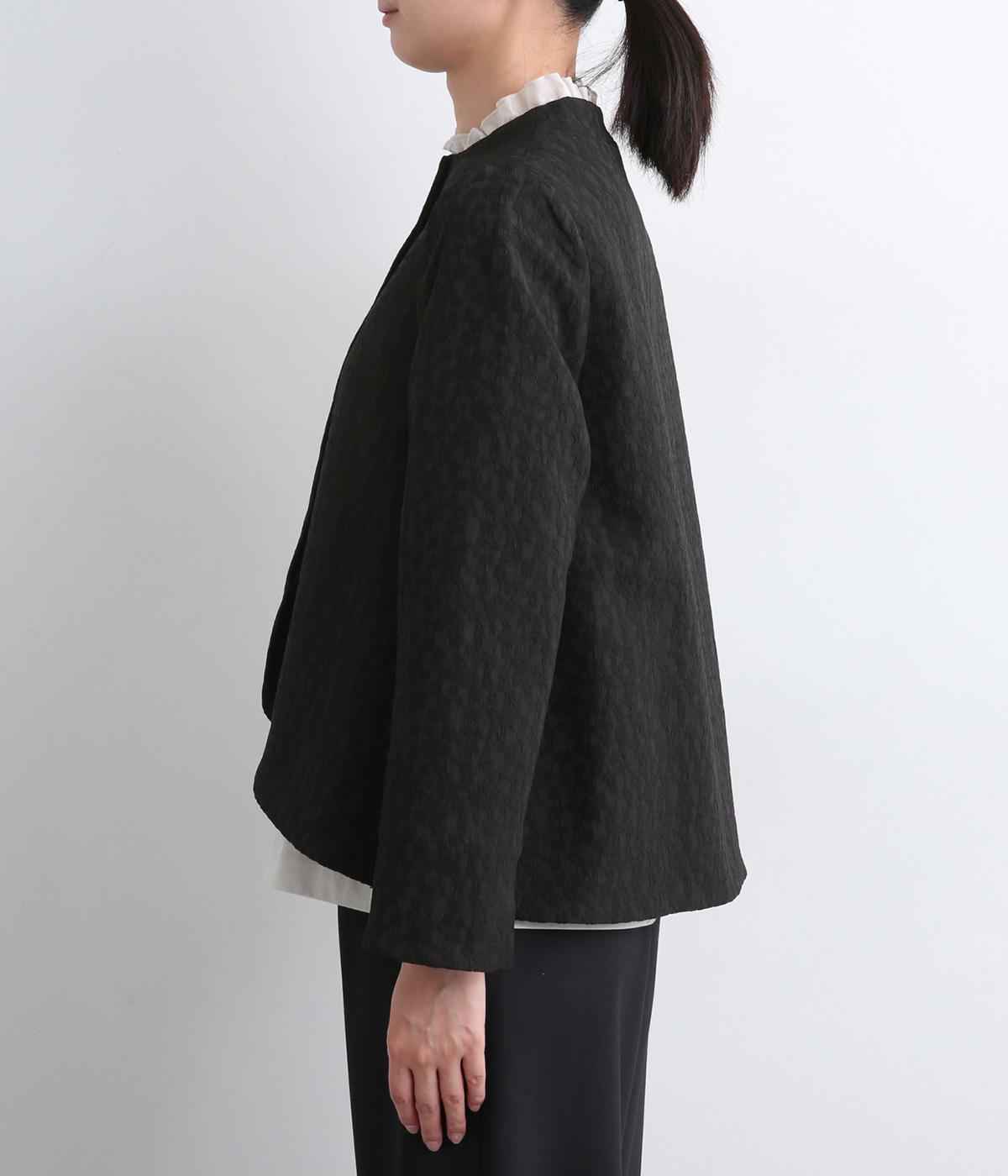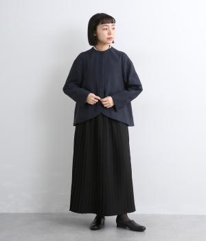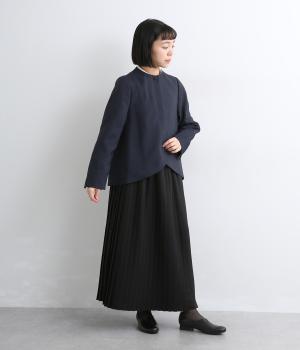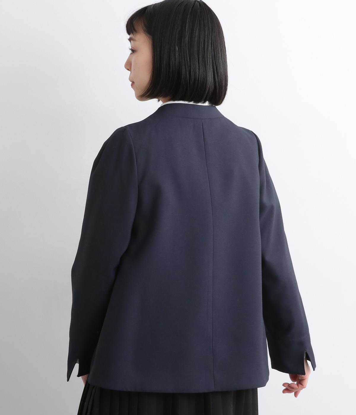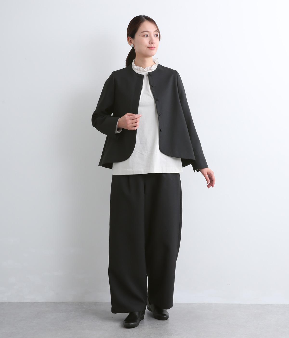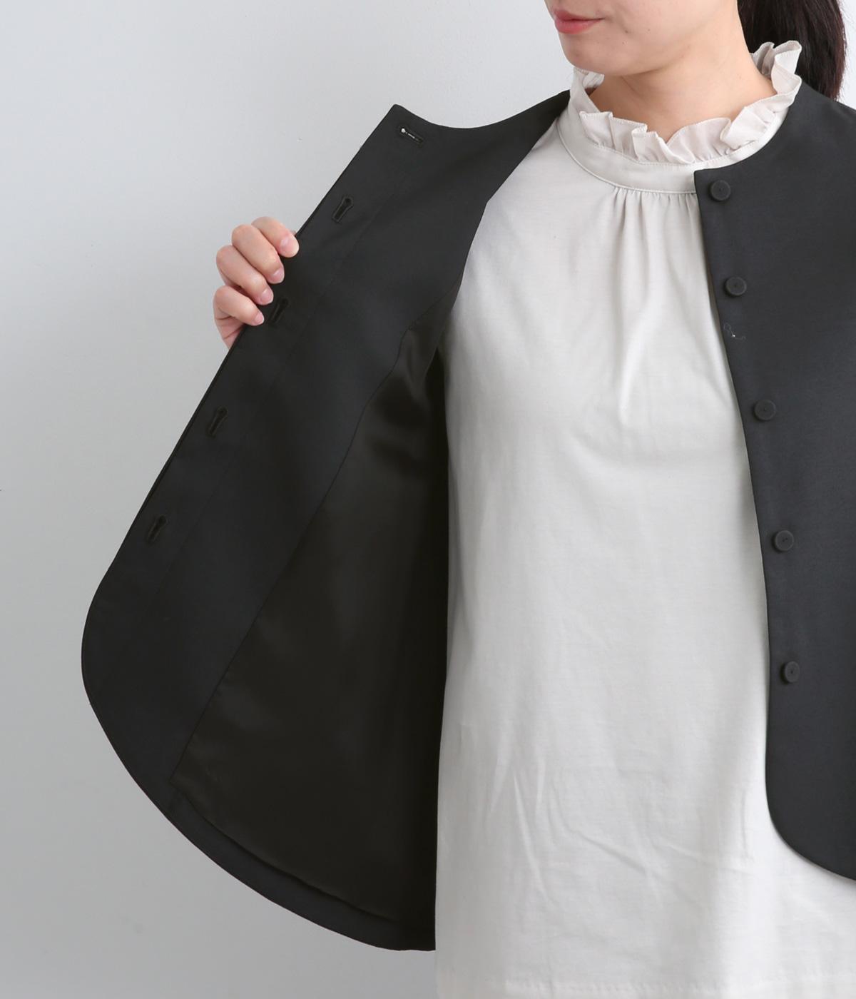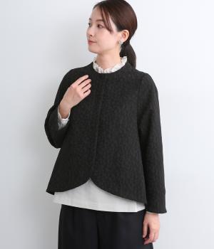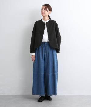 前中心から裾に向けてカーブさせたヘムラインが特徴的なジャケット。品のいいノーカラーできちんとした装いが得意ながらも適度に抜け感があり、袖口を折り返せばこなれ感も演出。同素材のボトムを合わせたセットアップスタイルもおすすめです。