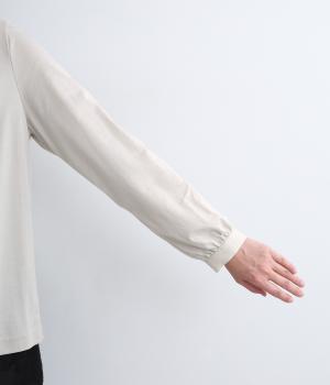 接触冷感機能をもたせたクールローレル加工のコットン天竺を使用。シルクのような美しい光沢と毛羽立ちにくい高い耐久性を持ちあわせているのでデイリー使いに最適です。