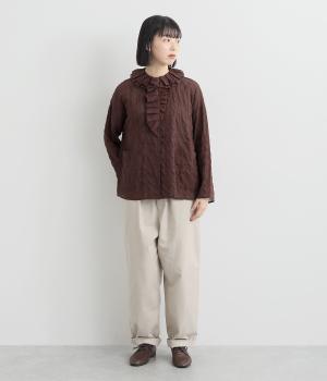 くしゃっとしたシャーリング加工がほどこされた表情豊かなコットン混生地を使用しています。とても軽くてやわらかく、イージーな着用感をアシスト。合わせるインナー次第でロングシーズンたのしめます。