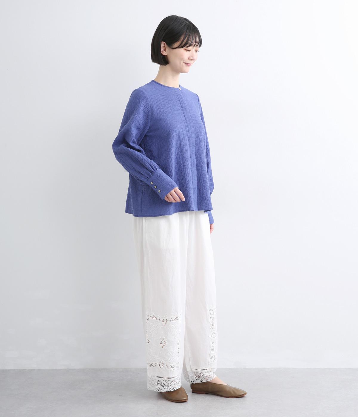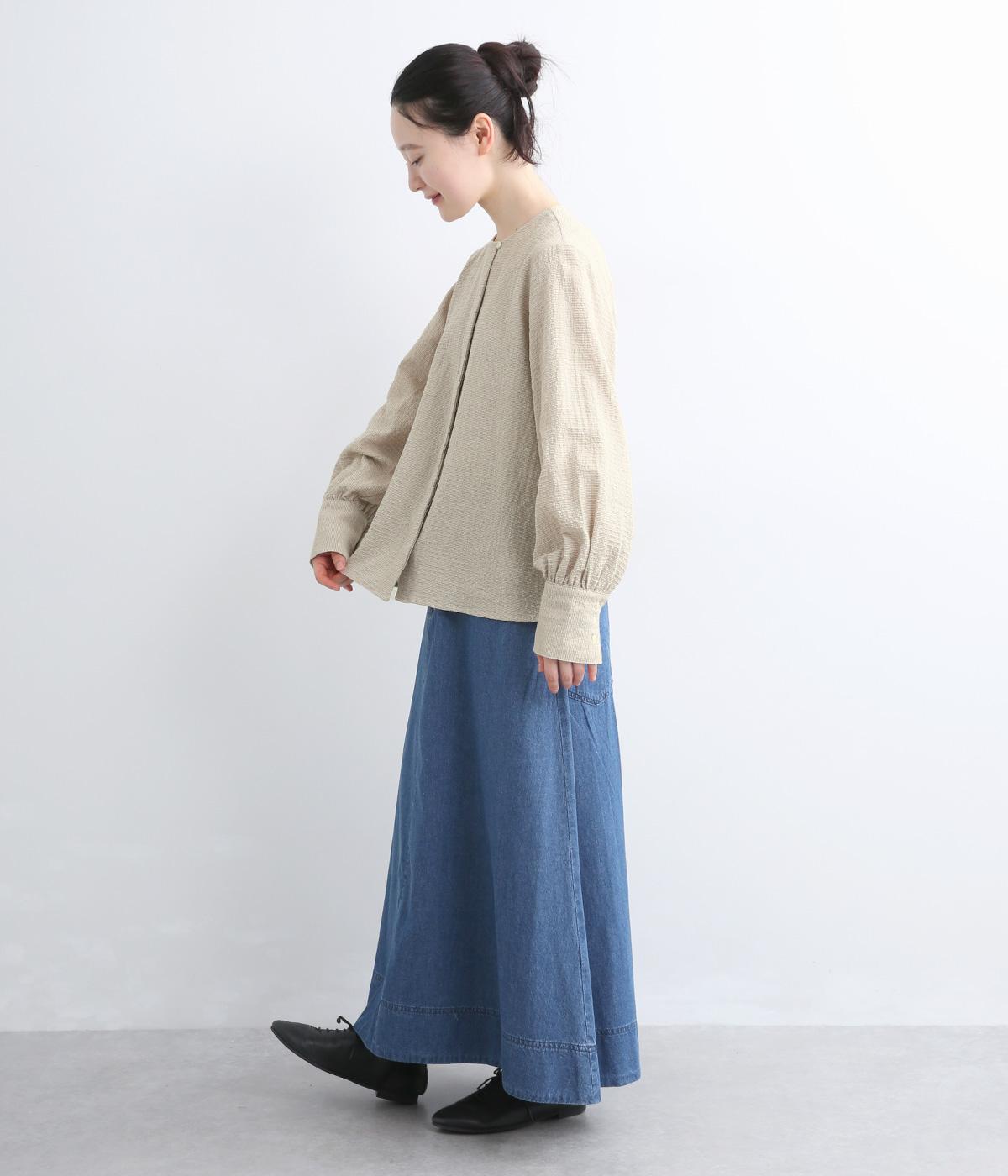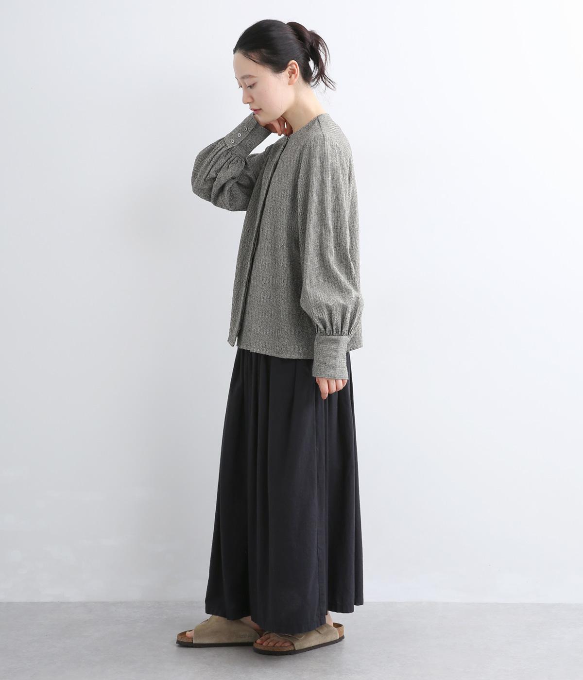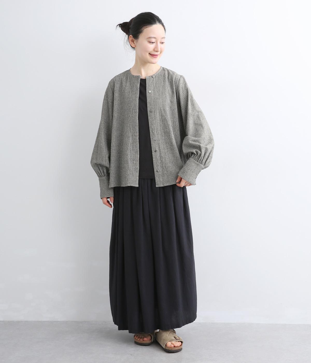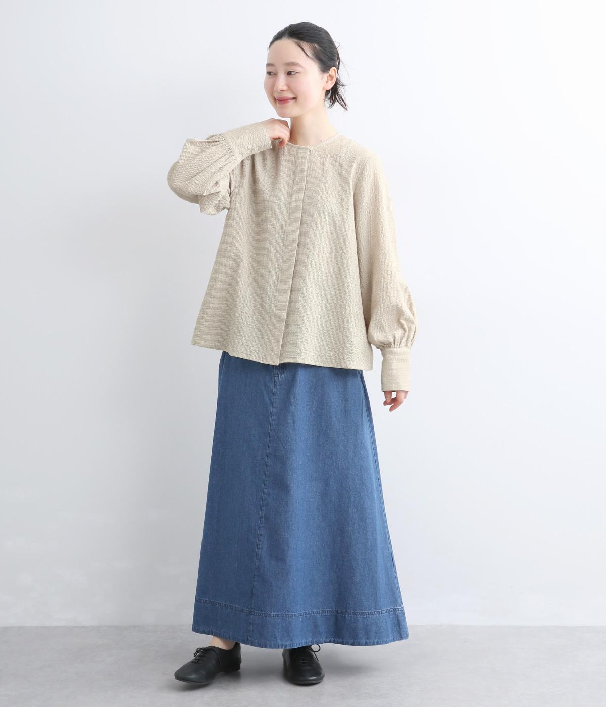 ふっくらとメリハリをつけたボリューム袖がポイントのブラウス。デザインを惹きたてるシンプルな比翼の前あき仕様で、カーディガン感覚でも着まわせます。ラウンドカラーで抜け感を持たせ、肩まわりもすっきりと。袖カフスはボタンをあけて折り返しても◎。