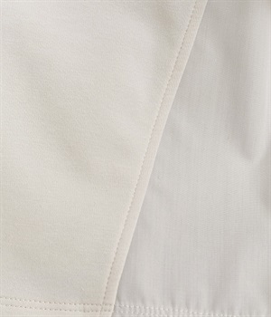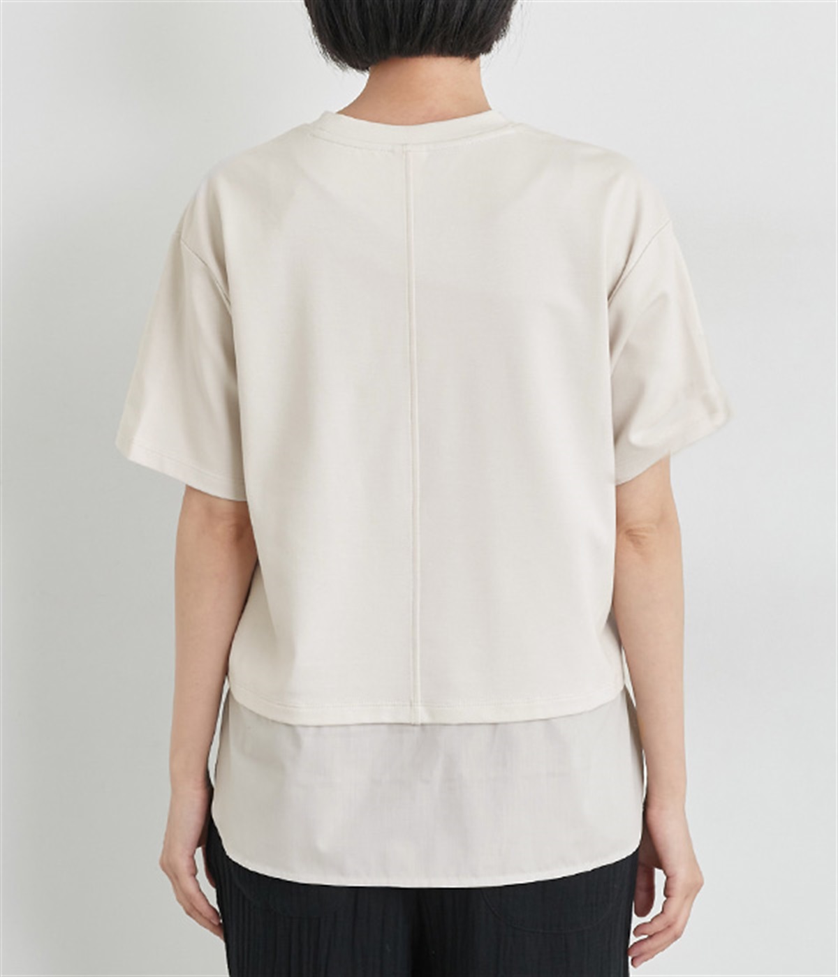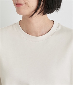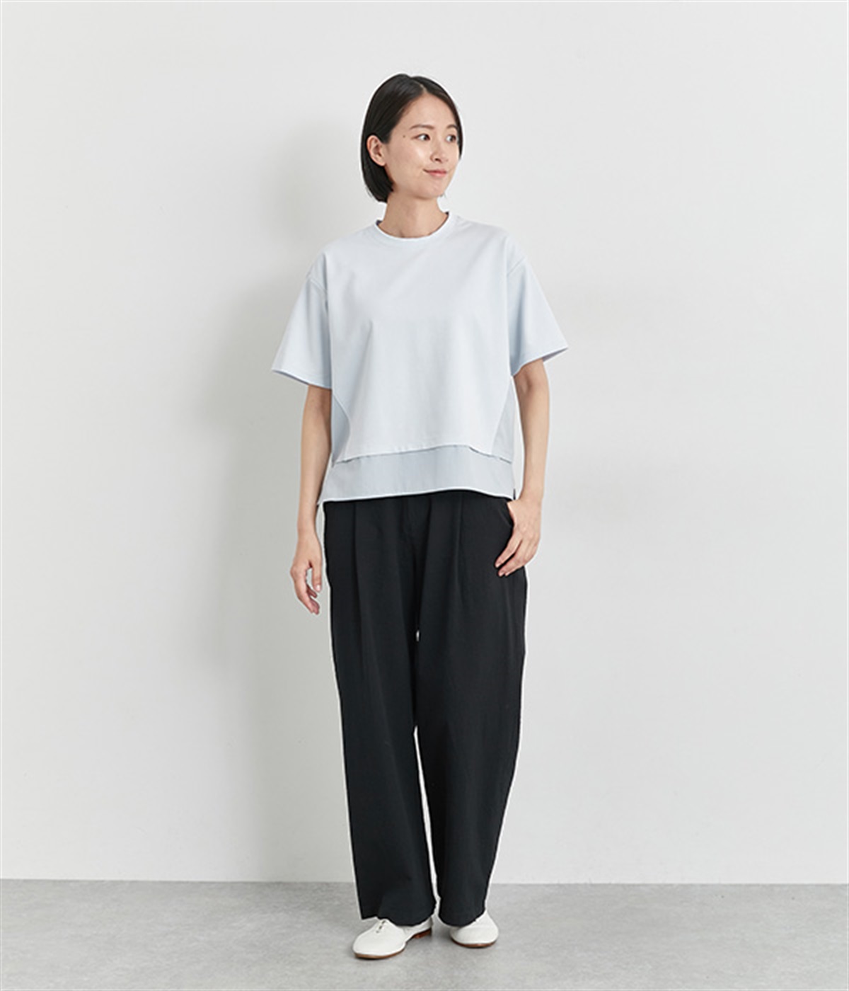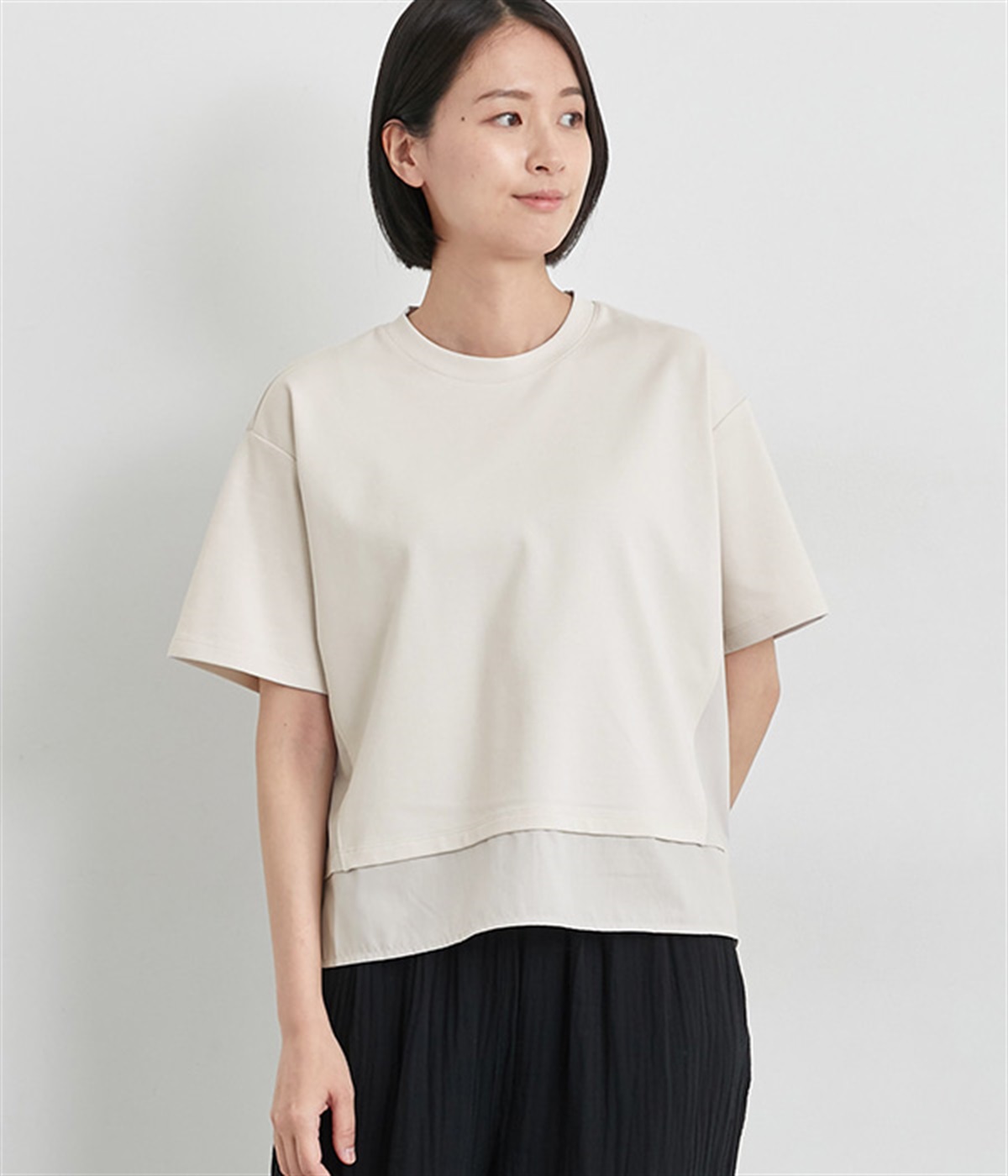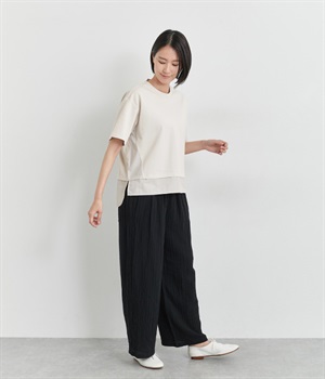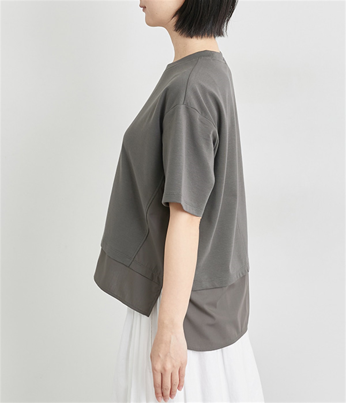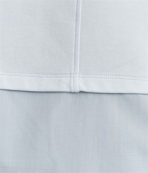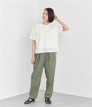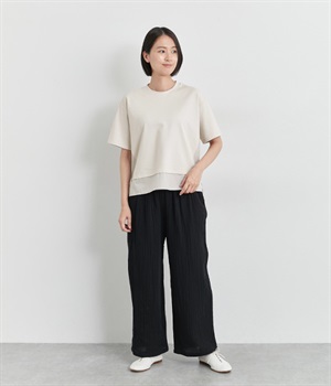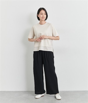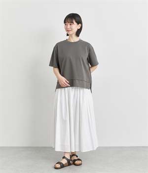 ベースは伸縮性のあるやわらかな綿混紡生地を、切り替え下はさらりとしてほのかにハリ感のあるポリエステル混の生地を組み合わせました。どちらもクリアな表面感で好感度の高い仕上がりです。