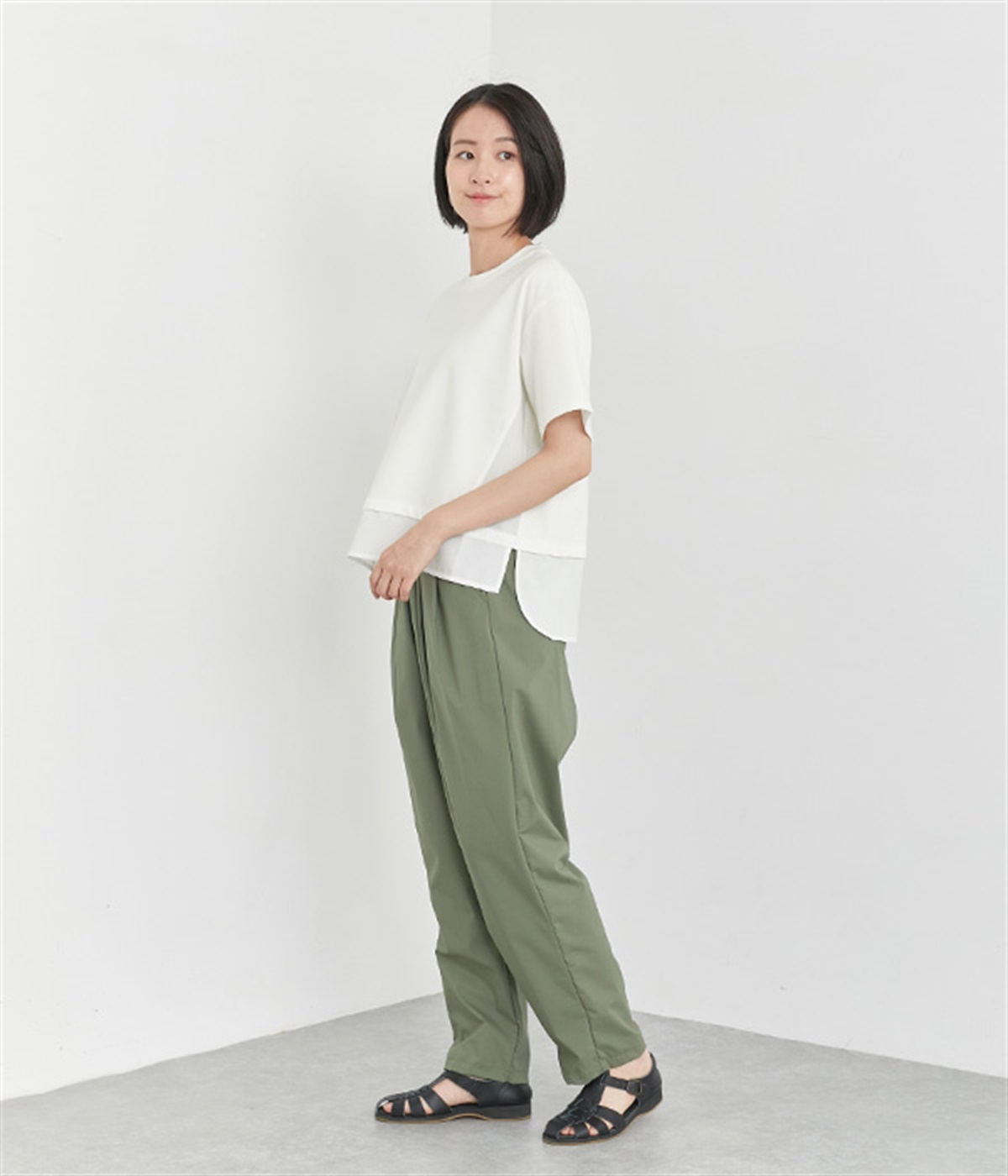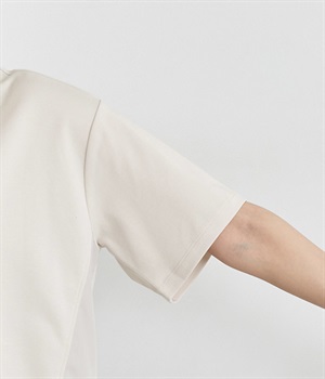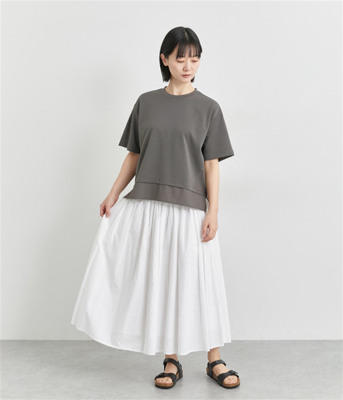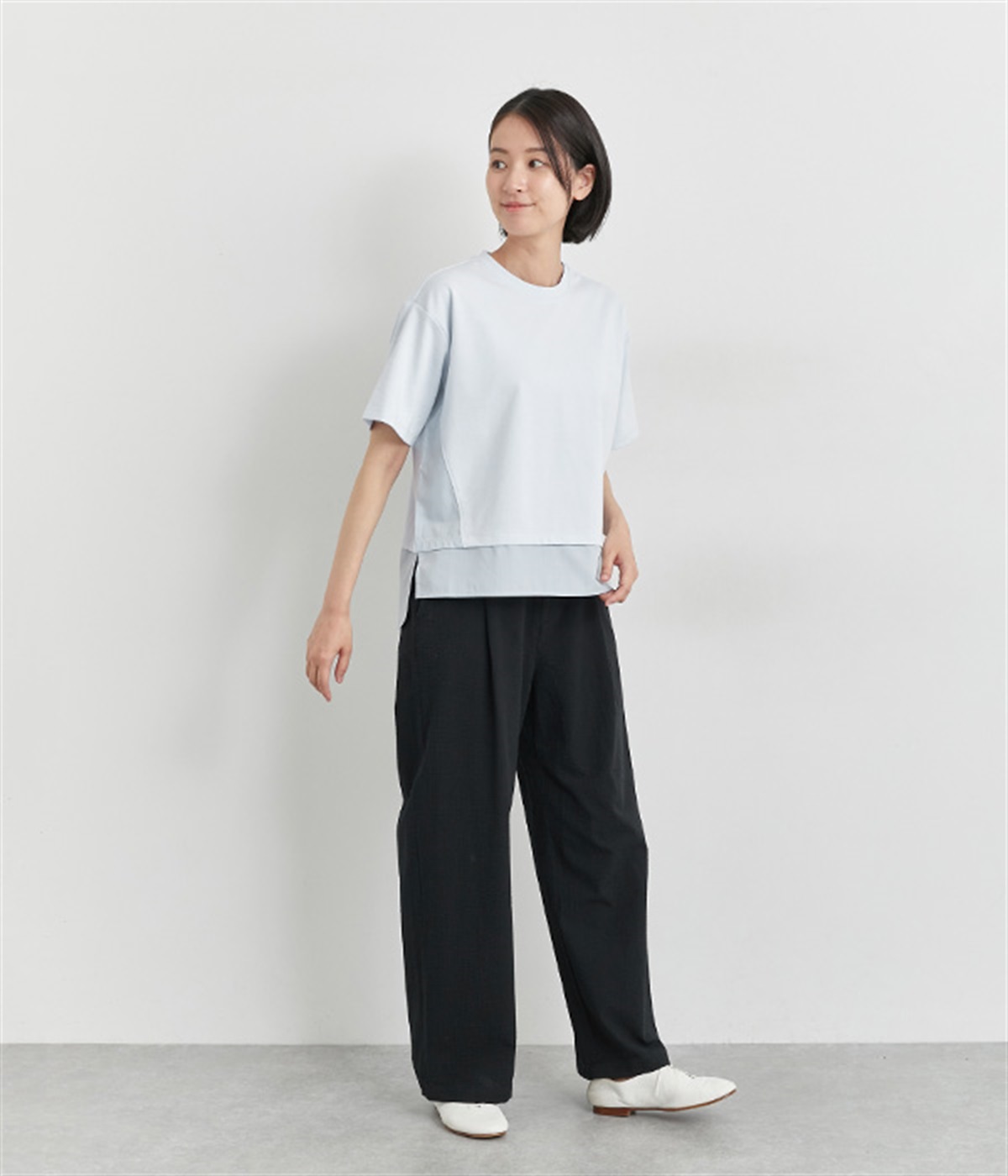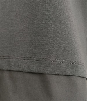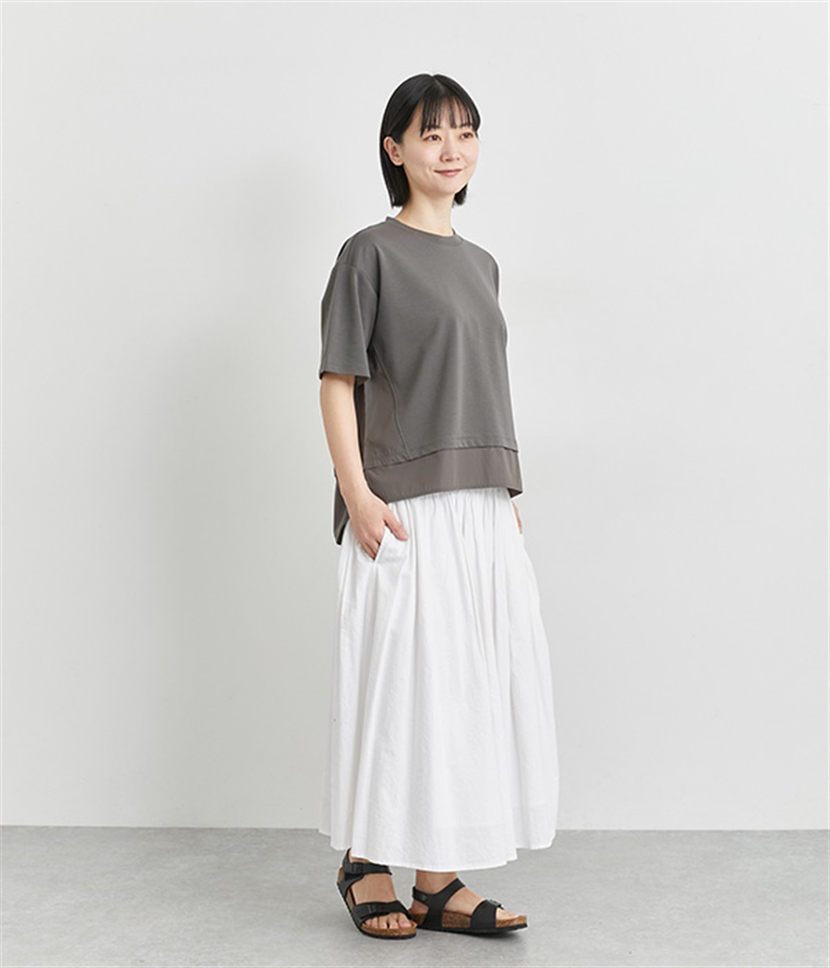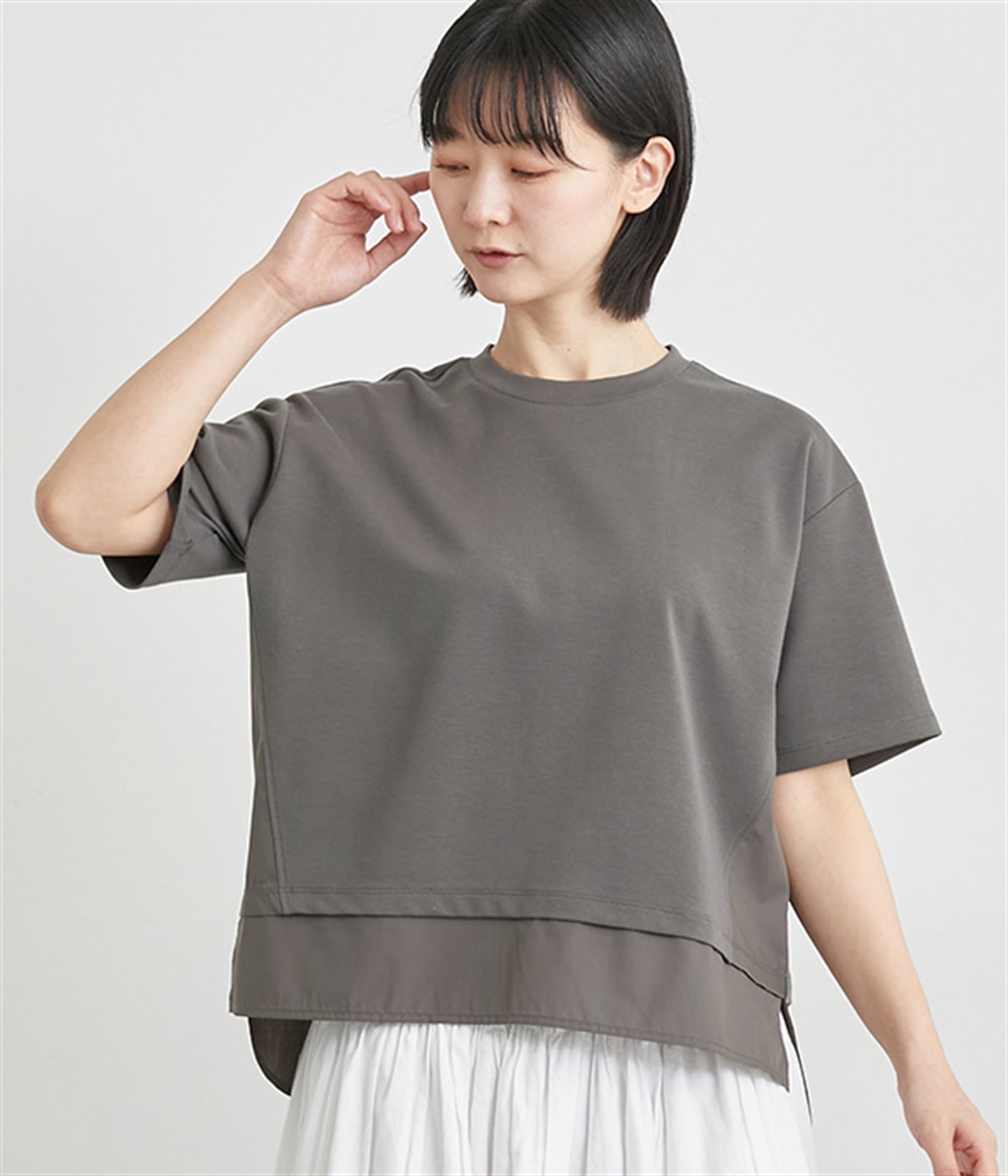 ベースは伸縮性のあるやわらかな綿混紡生地を、切り替え下はさらりとしてほのかにハリ感のあるポリエステル混の生地を組み合わせました。どちらもクリアな表面感で好感度の高い仕上がりです。
