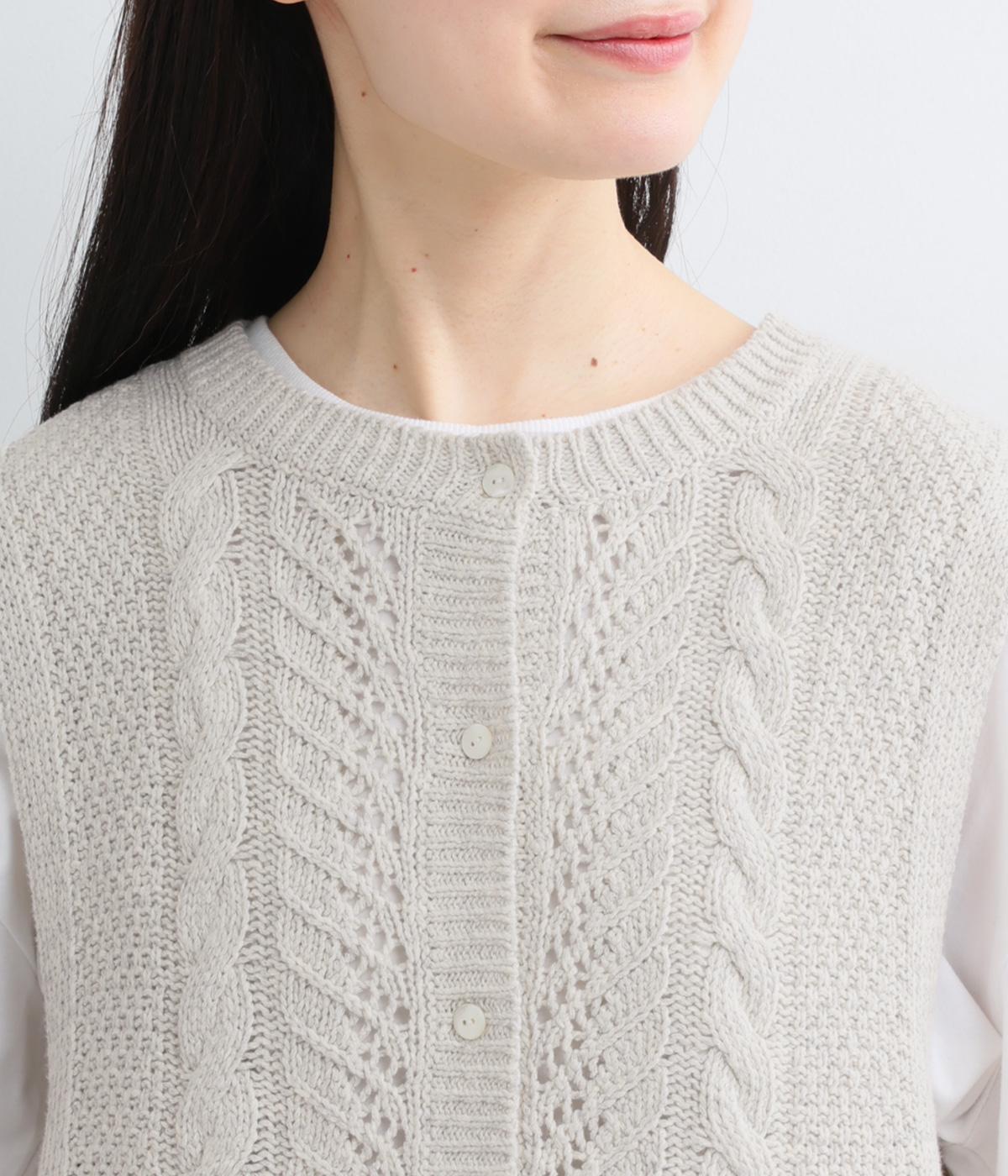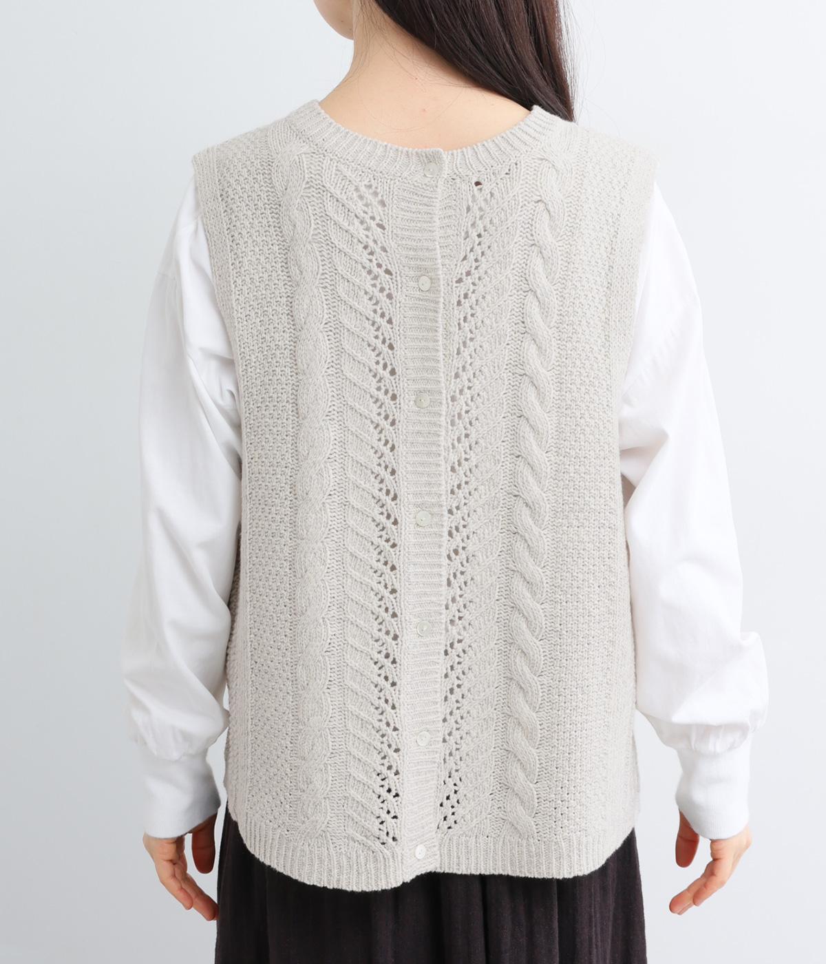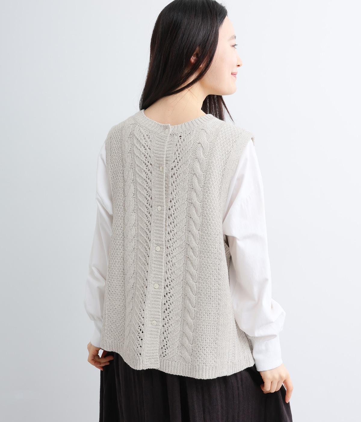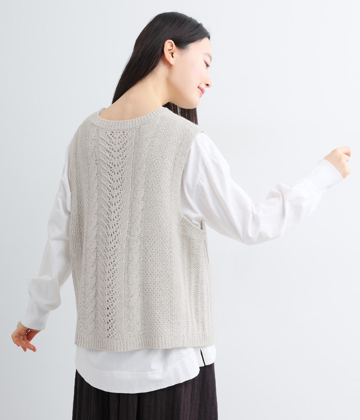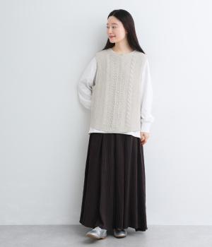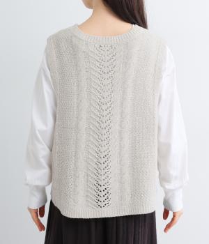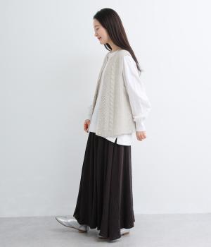 前後どちらでもたのしめる2way仕様のベスト。編み柄が異なるので印象も変わり、ボタンをあけてジレのように羽織るなど着まわし力も◎。腰にかかるほどの丈感がスタイリングにタテラインをつくり、全体をすっきりまとめます。