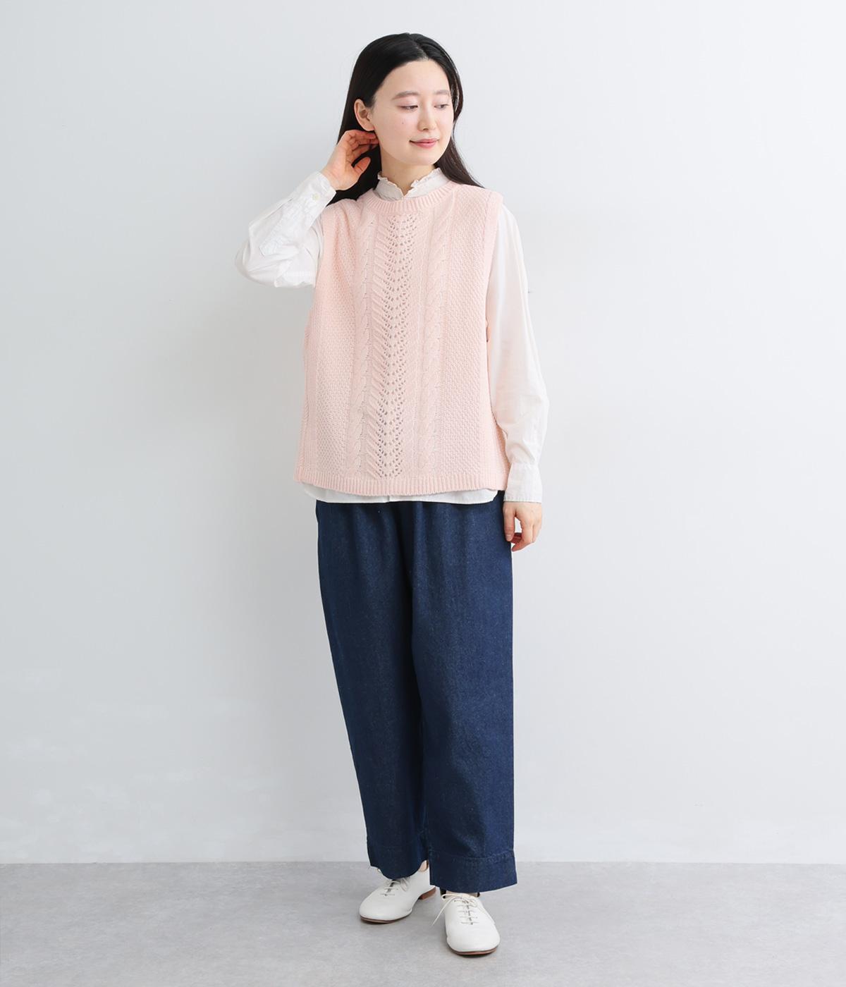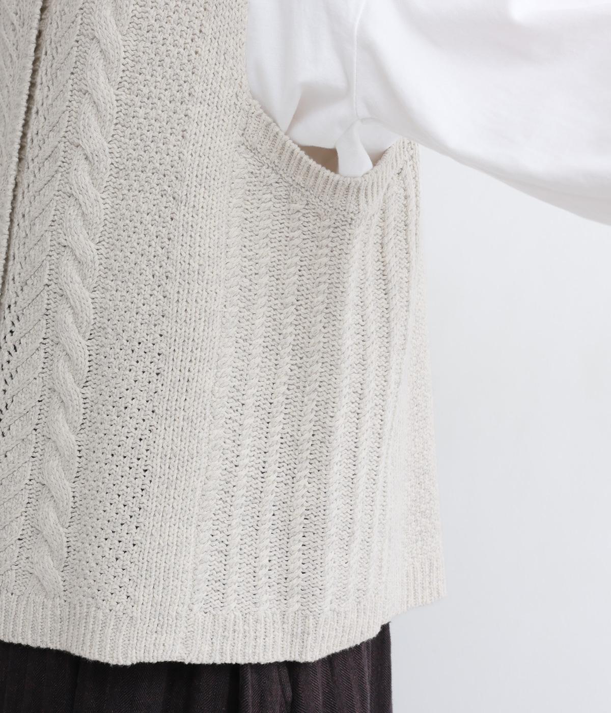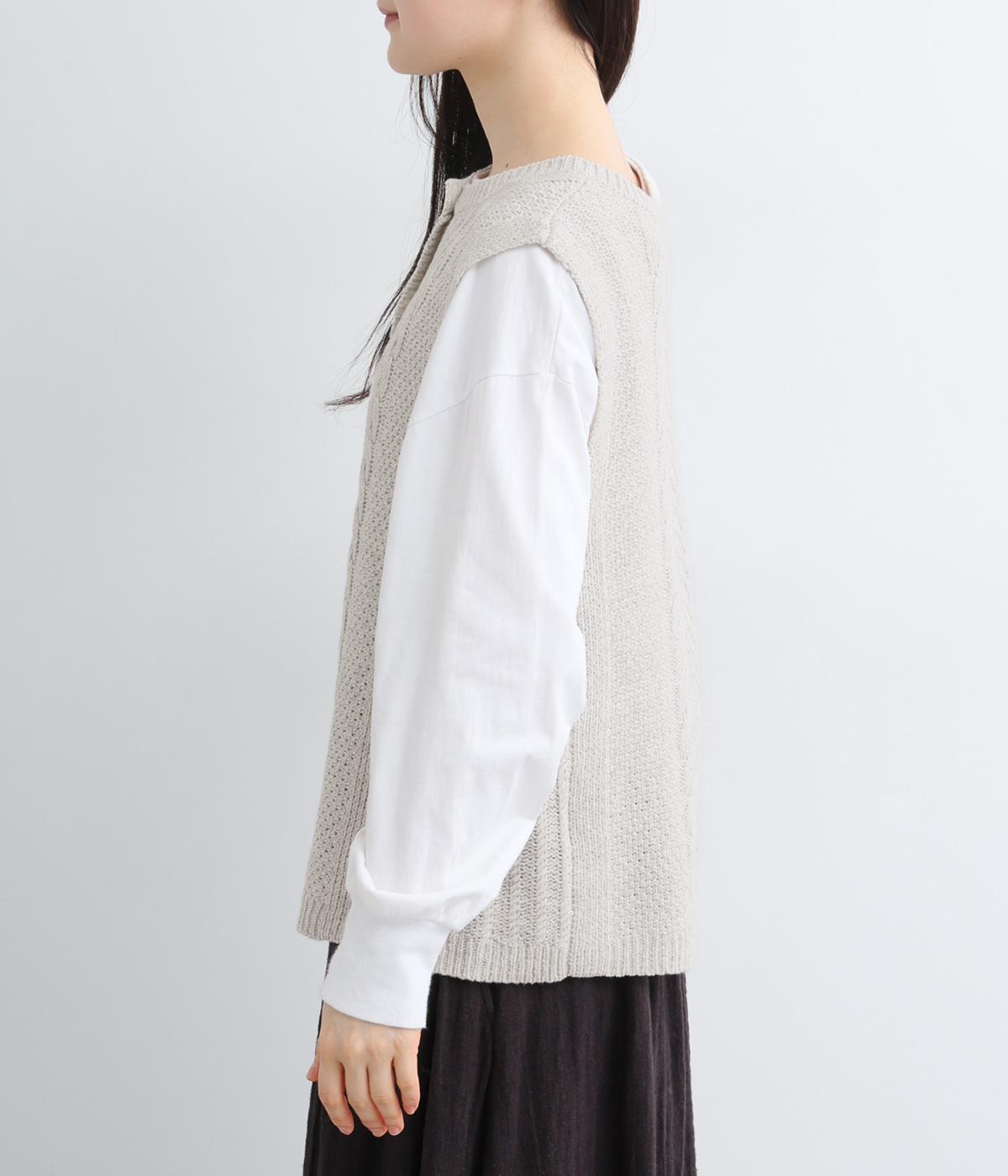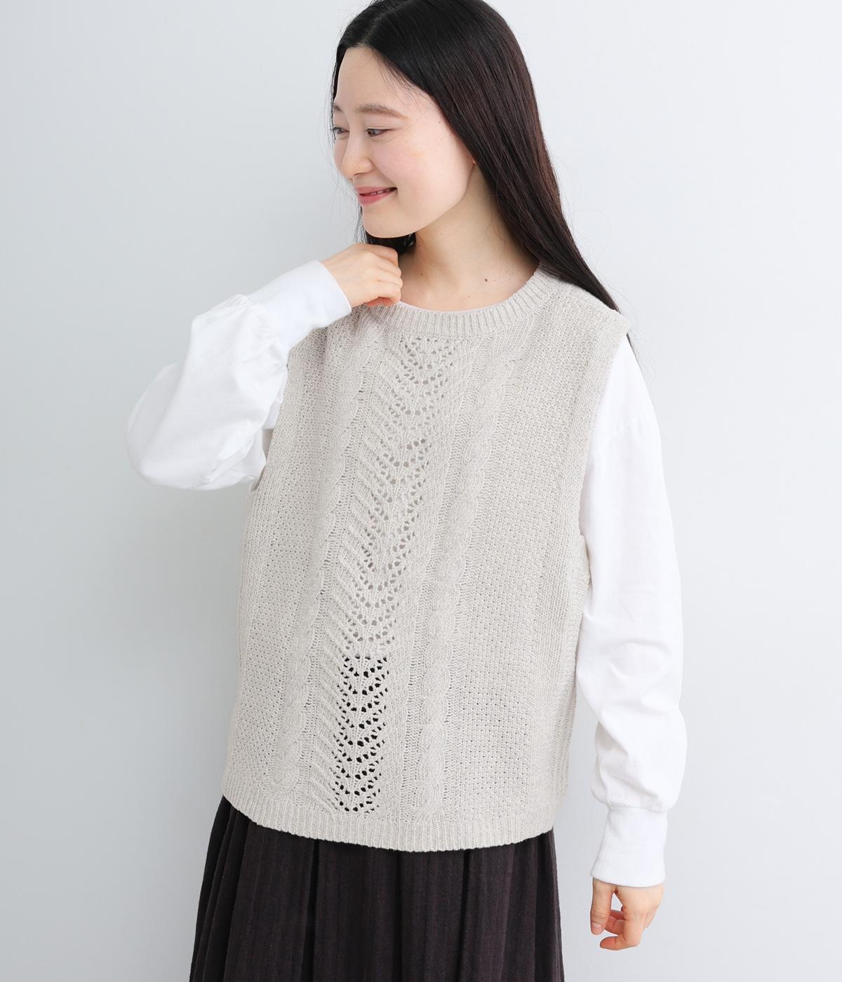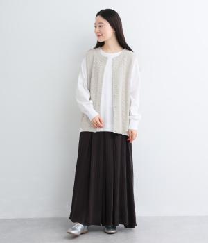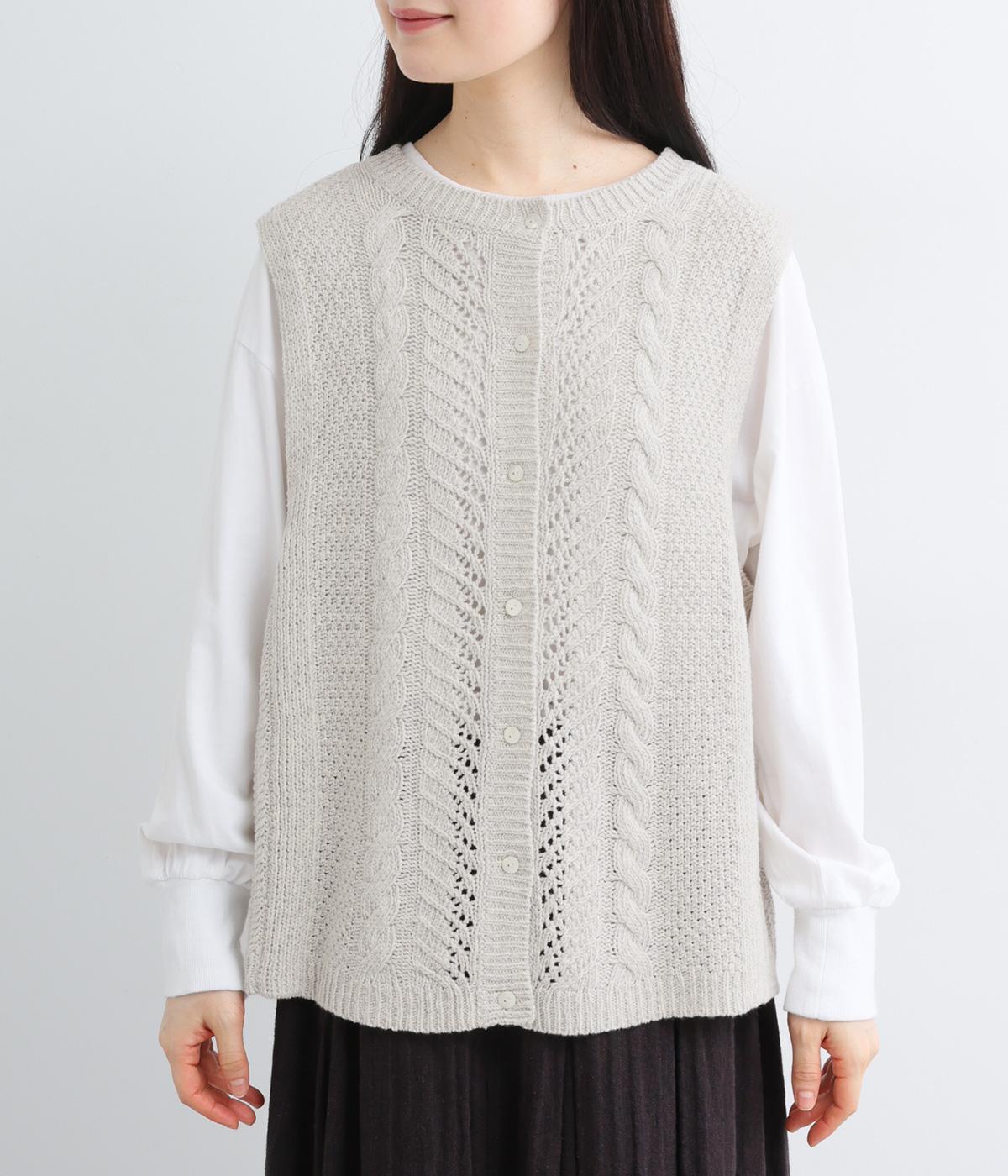 前後どちらでもたのしめる2way仕様のベスト。編み柄が異なるので印象も変わり、ボタンをあけてジレのように羽織るなど着まわし力も◎。腰にかかるほどの丈感がスタイリングにタテラインをつくり、全体をすっきりまとめます。