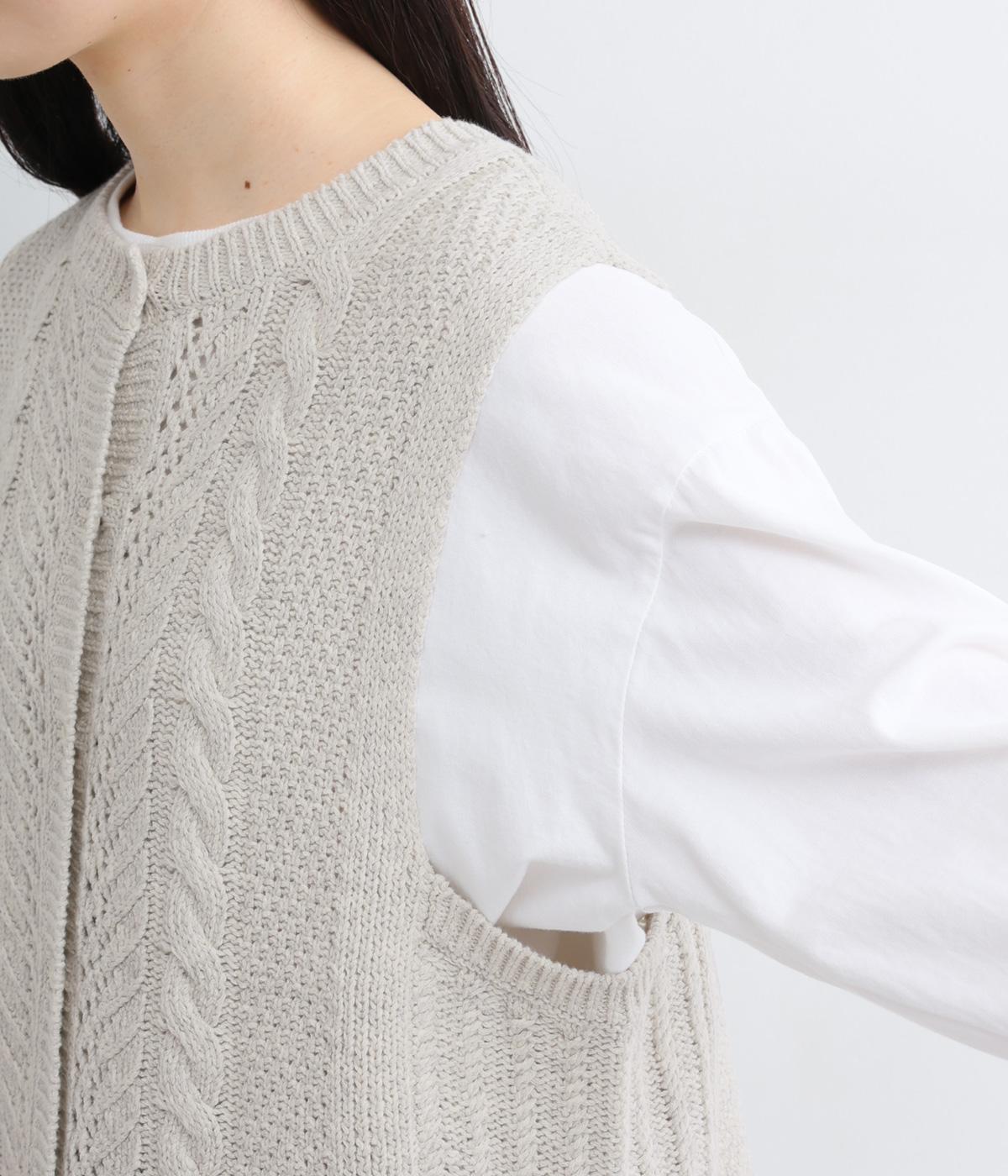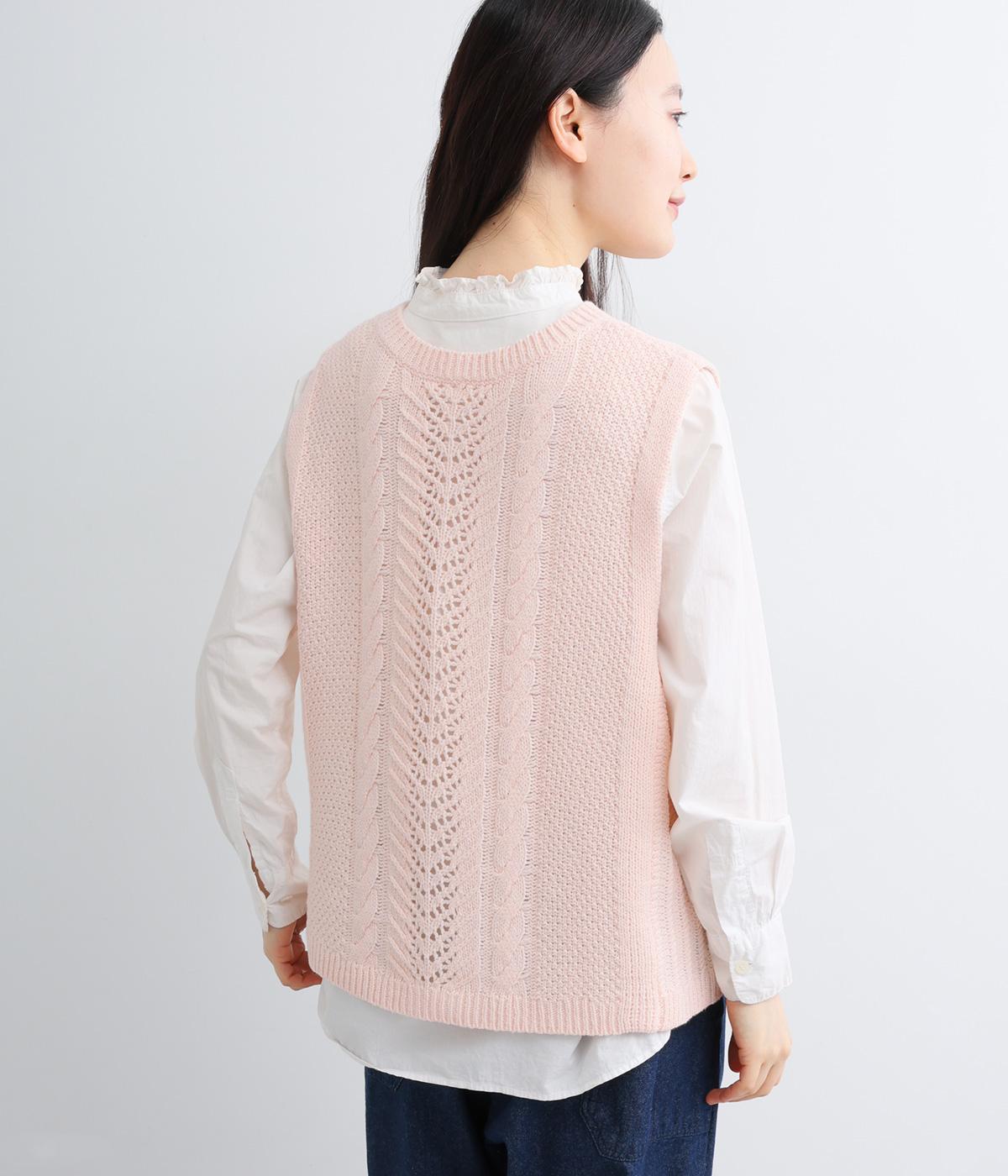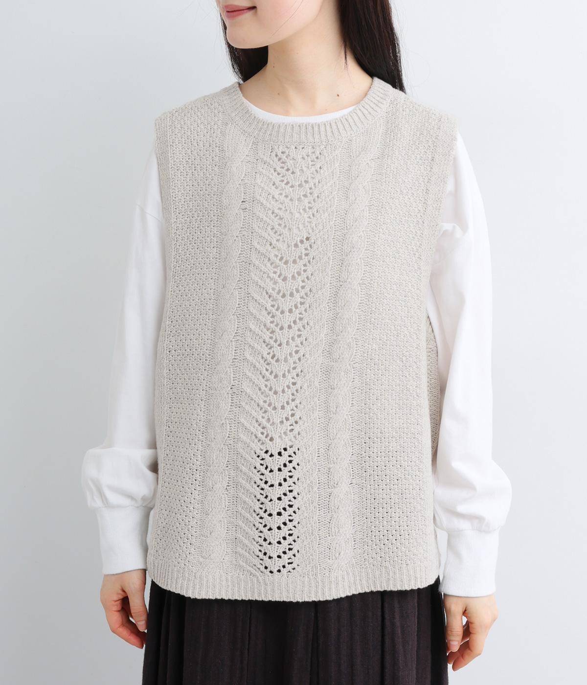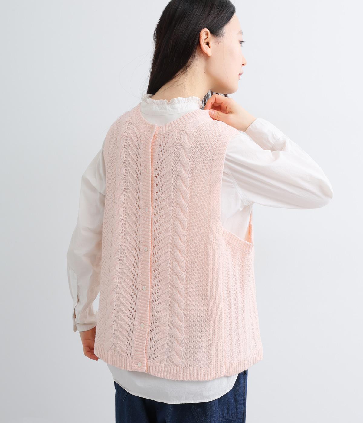 前後どちらでもたのしめる2way仕様のベスト。編み柄が異なるので印象も変わり、ボタンをあけてジレのように羽織るなど着まわし力も◎。腰にかかるほどの丈感がスタイリングにタテラインをつくり、全体をすっきりまとめます。