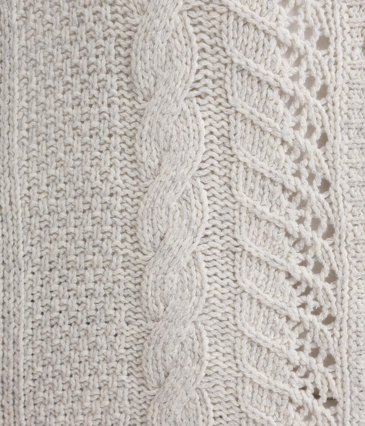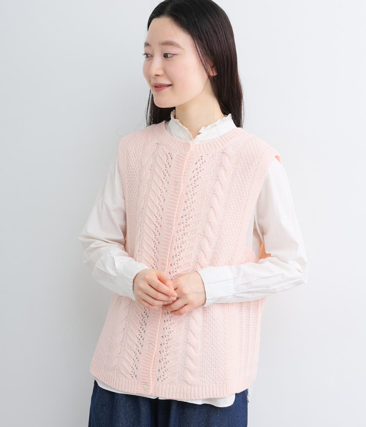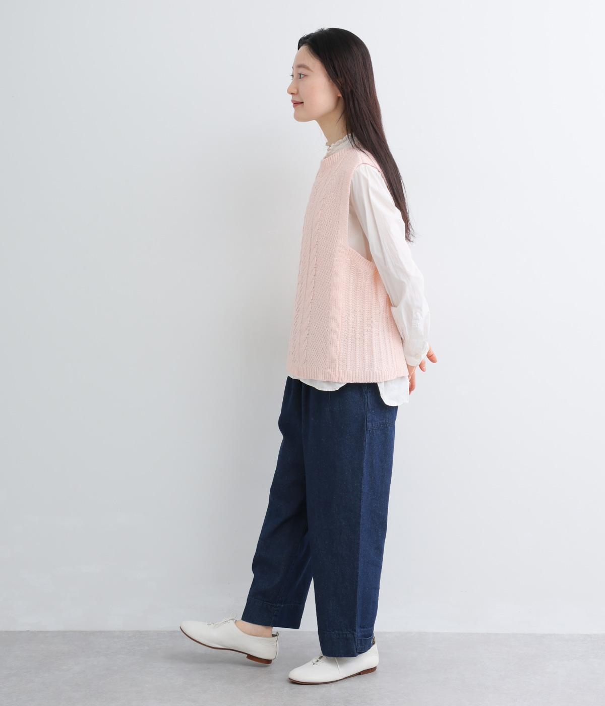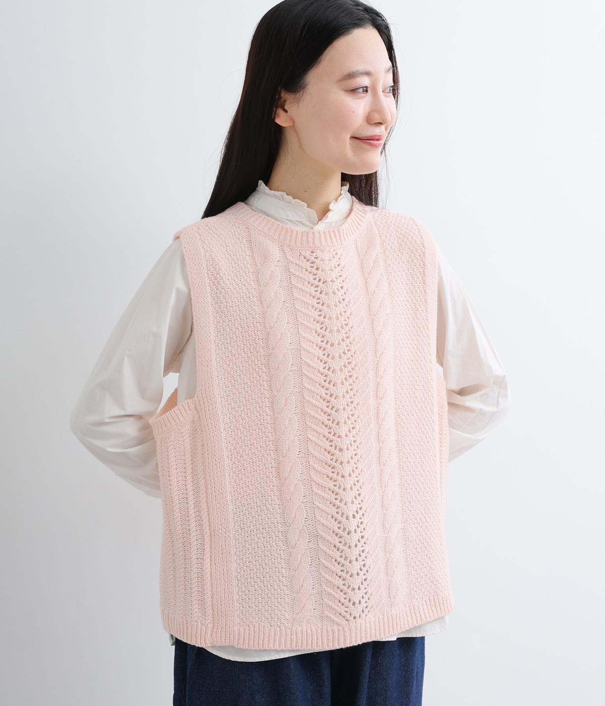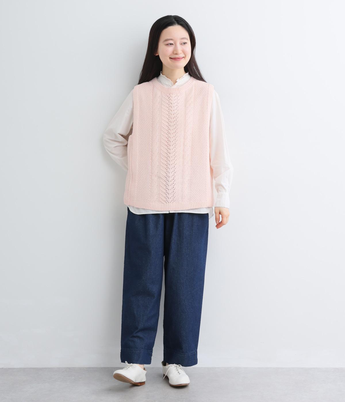 前後どちらでもたのしめる2way仕様のベスト。編み柄が異なるので印象も変わり、ボタンをあけてジレのように羽織るなど着まわし力も◎。腰にかかるほどの丈感がスタイリングにタテラインをつくり、全体をすっきりまとめます。