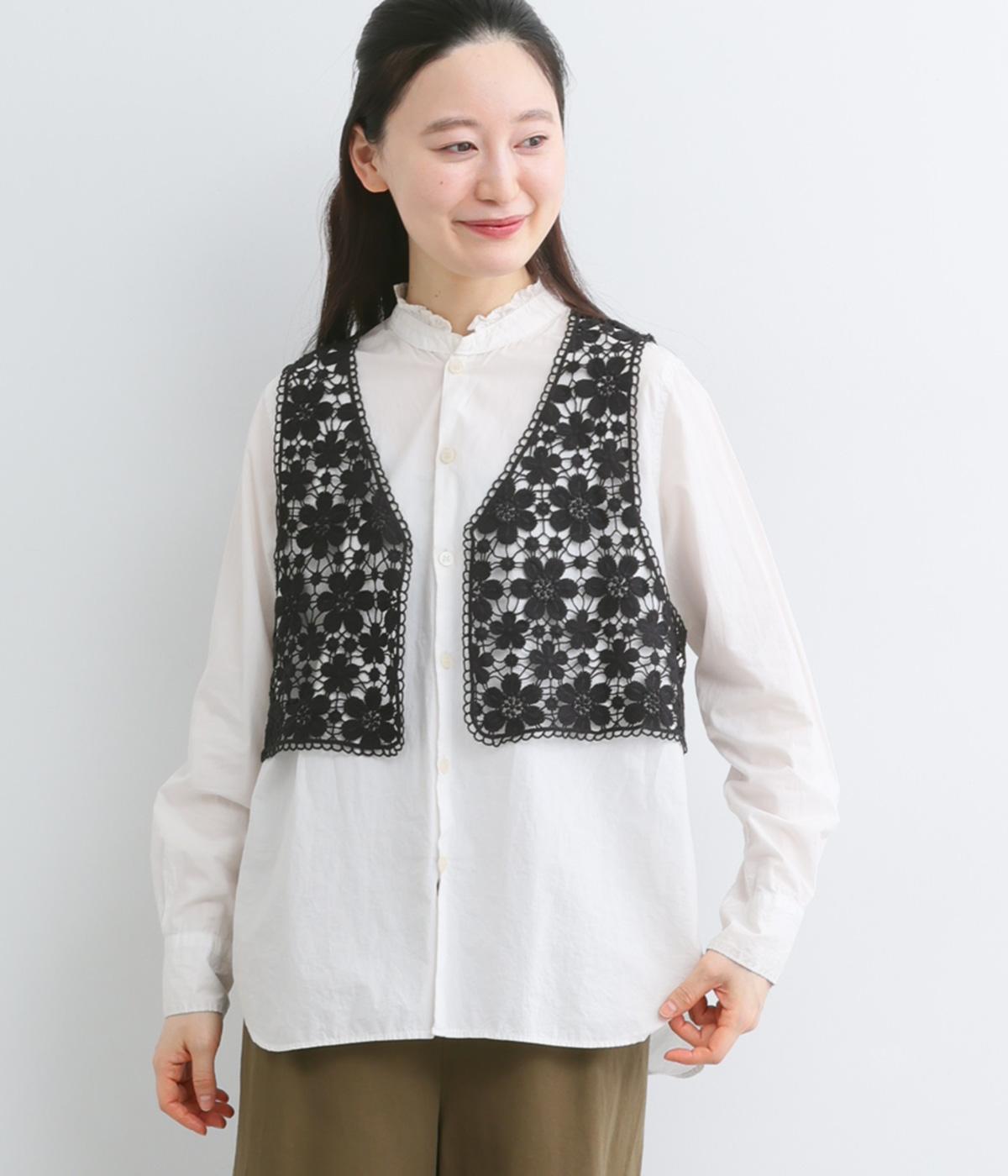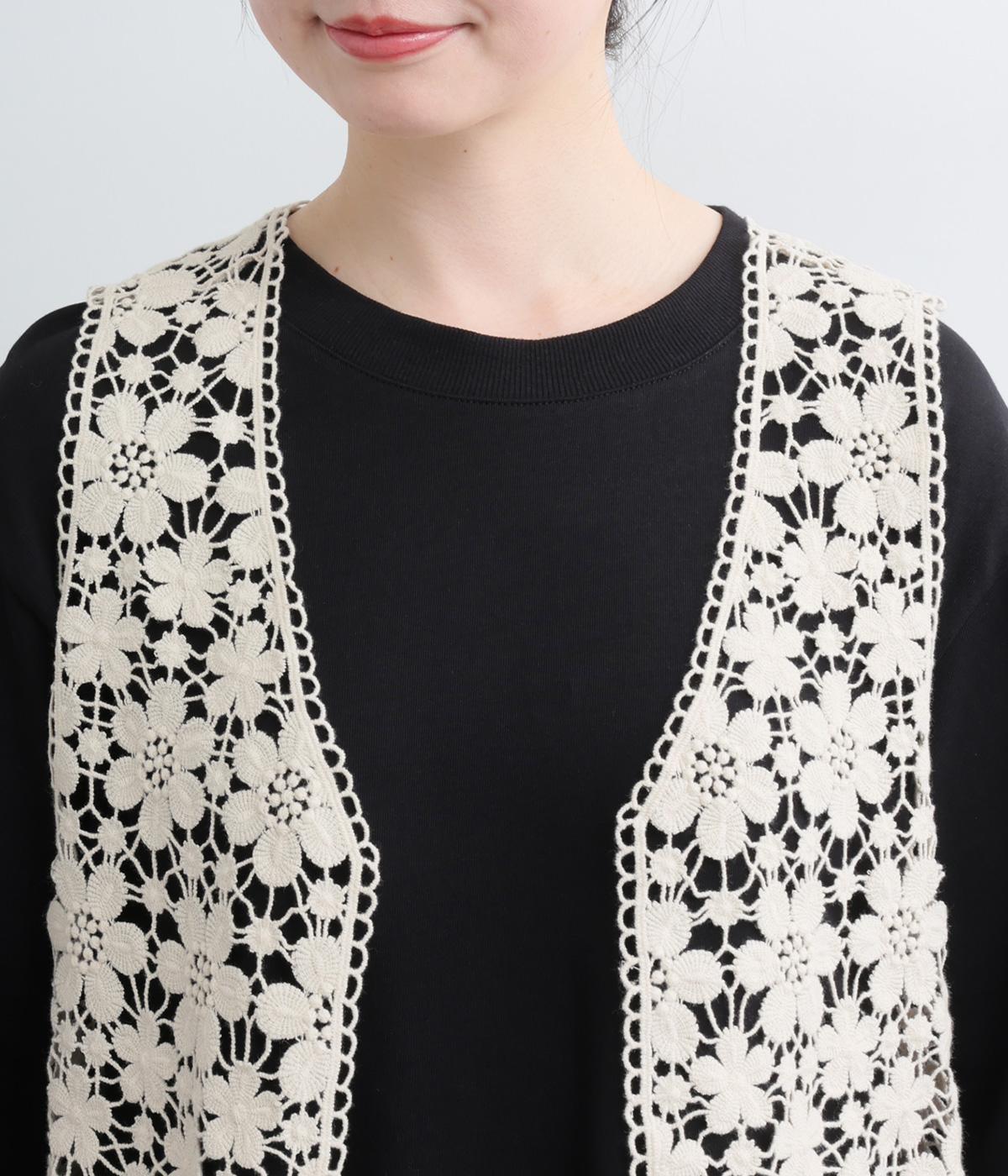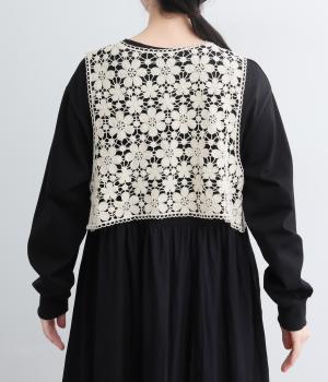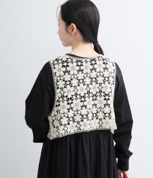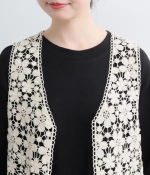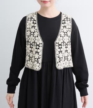 いつものコーディネートにプラスするだけで大人ガーリーな装いに早変わりするレースベスト。留め具のない羽織タイプで、脇も広くあいているのでボリュームトップスとも好相性。ショート丈で全身のバランスも取りやすく作られています。