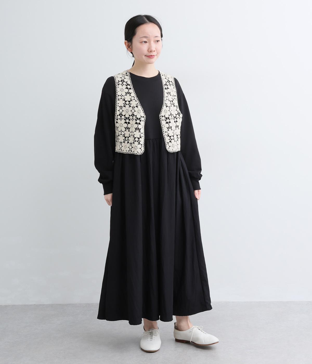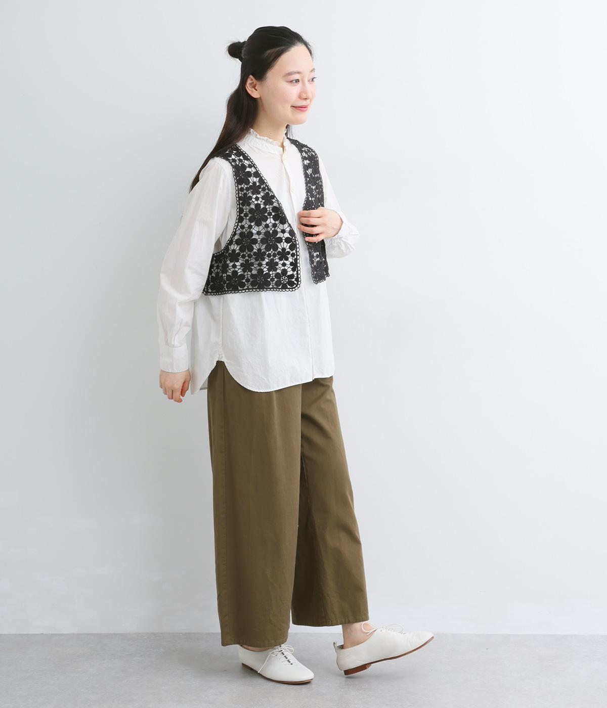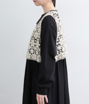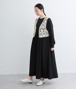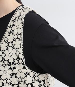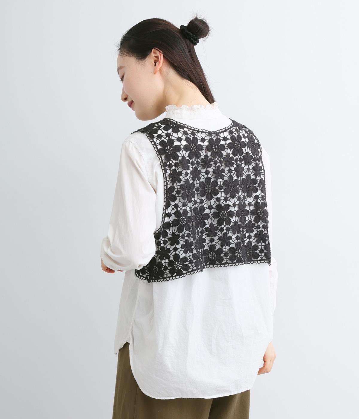 いつものコーディネートにプラスするだけで大人ガーリーな装いに早変わりするレースベスト。留め具のない羽織タイプで、脇も広くあいているのでボリュームトップスとも好相性。ショート丈で全身のバランスも取りやすく作られています。