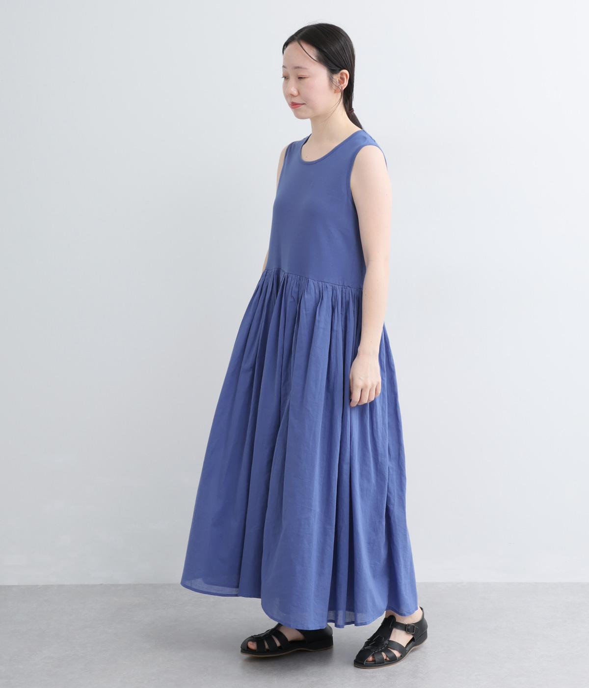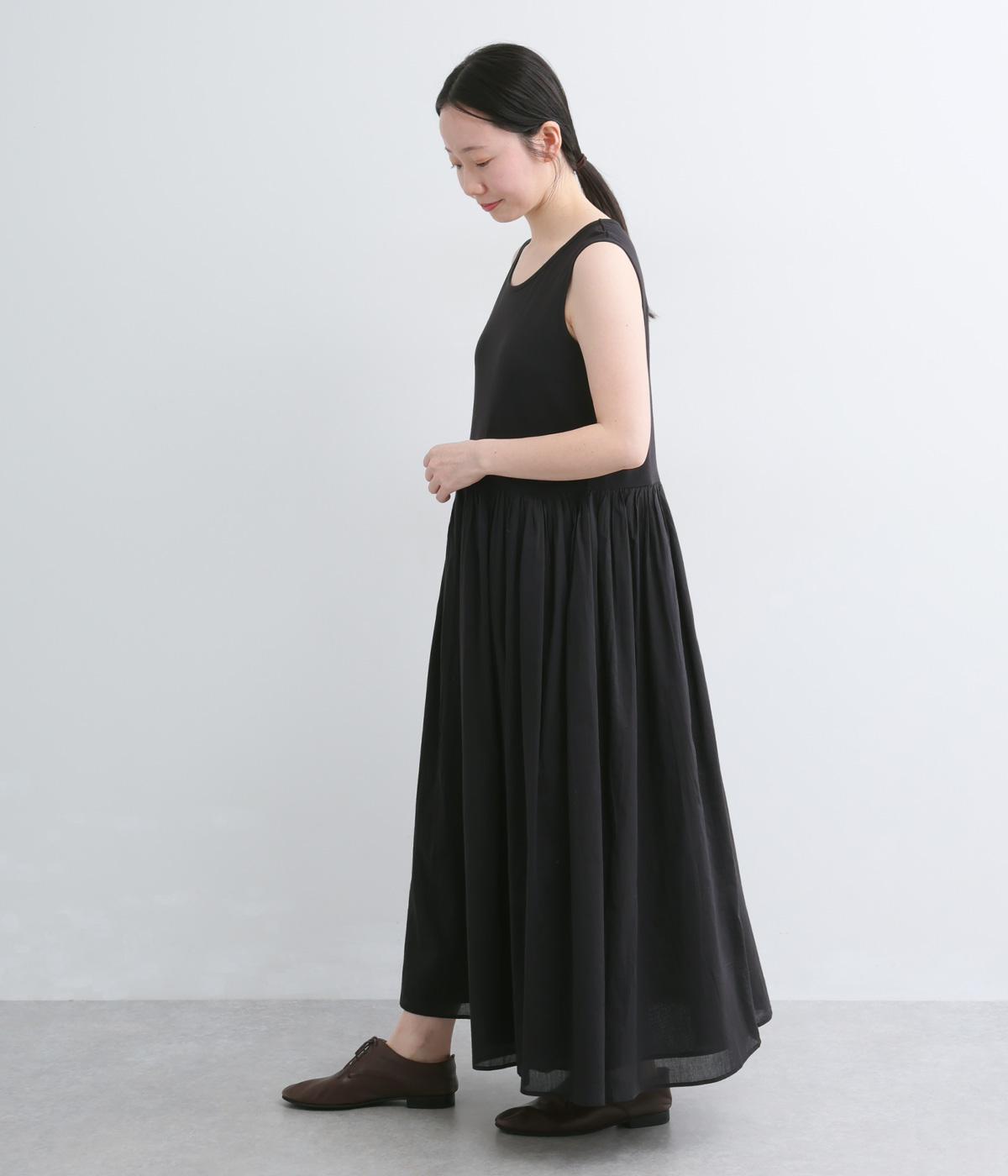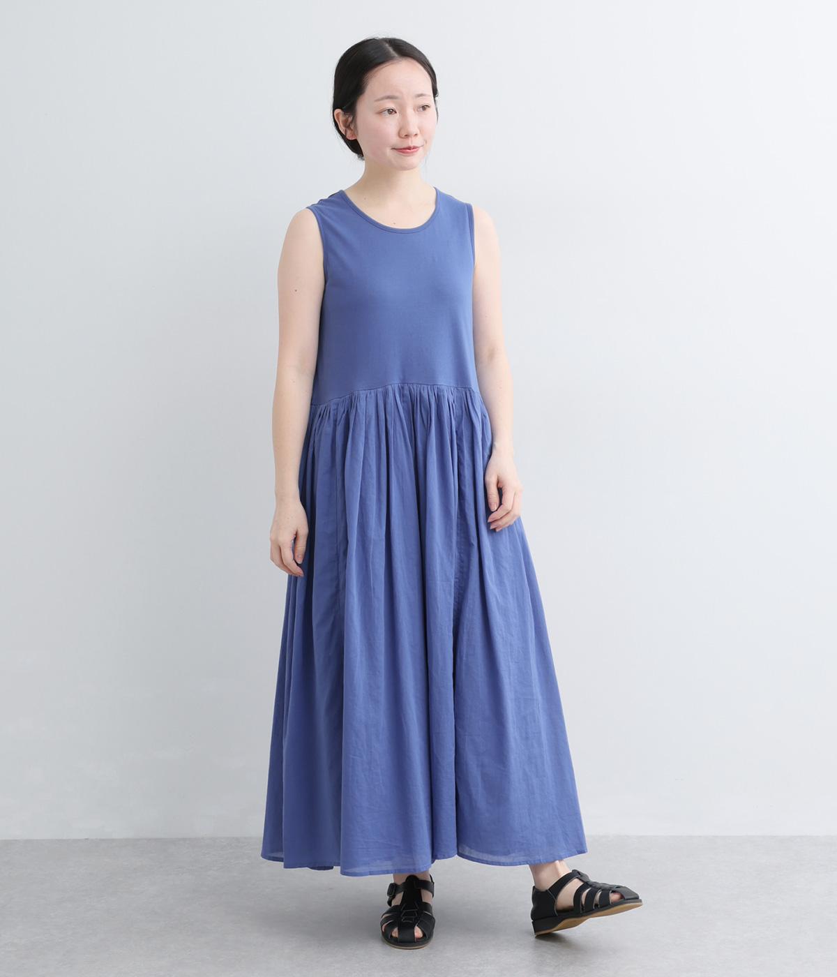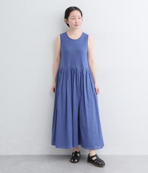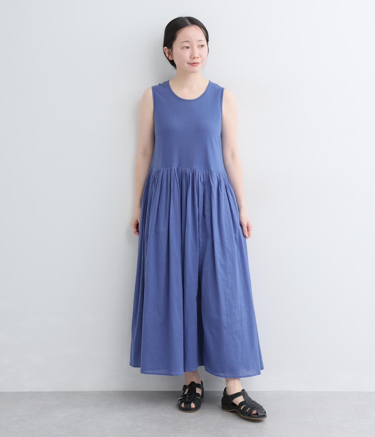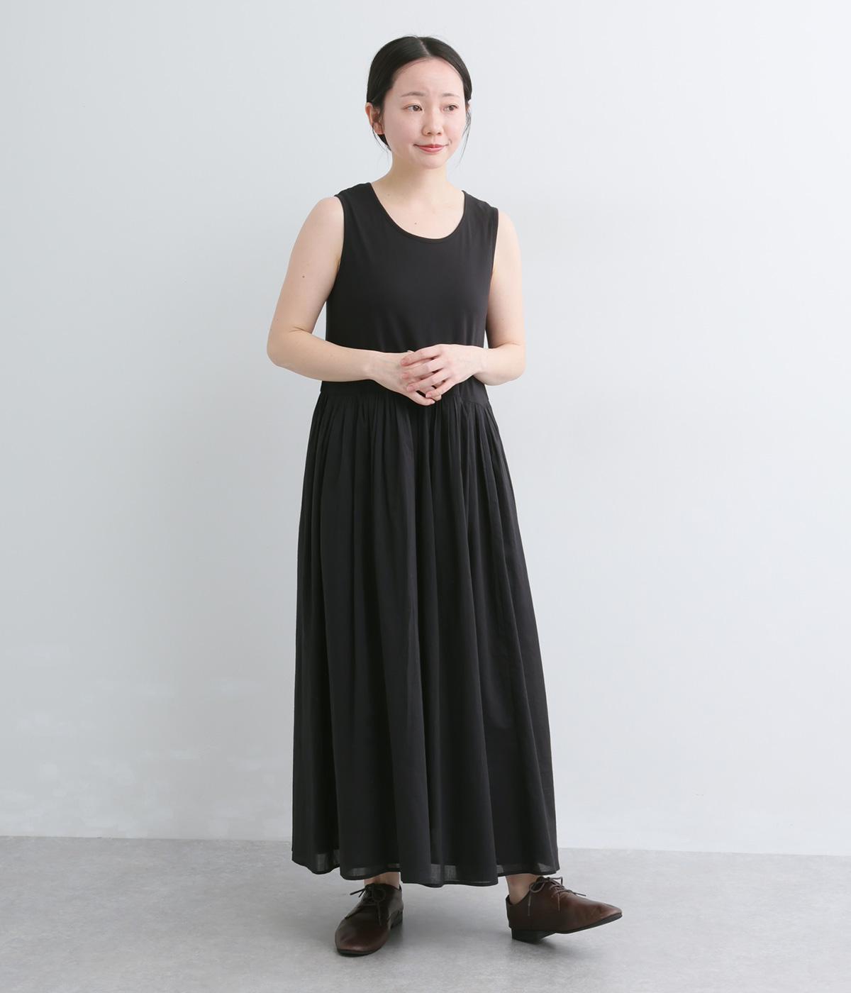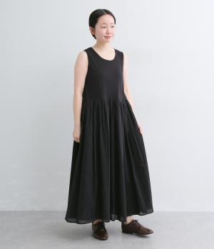 シンプルながらも異素材による変化で表情をつけたワンピース。動きの多い上身頃は天竺素材で着心地快適。軽やかな裾が歩くたびにゆらめいて着映え力も◎。すっきり一枚でさわやかに着たり、羽織りやインナーを合わせたりと着まわせます。
