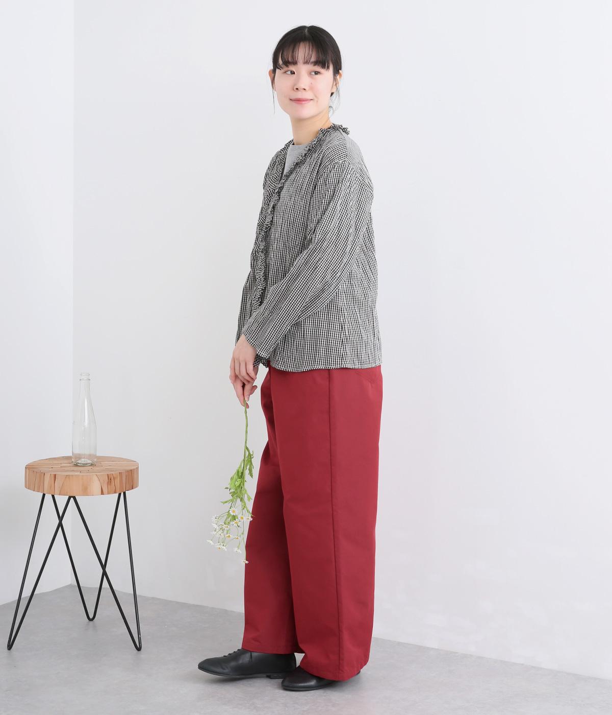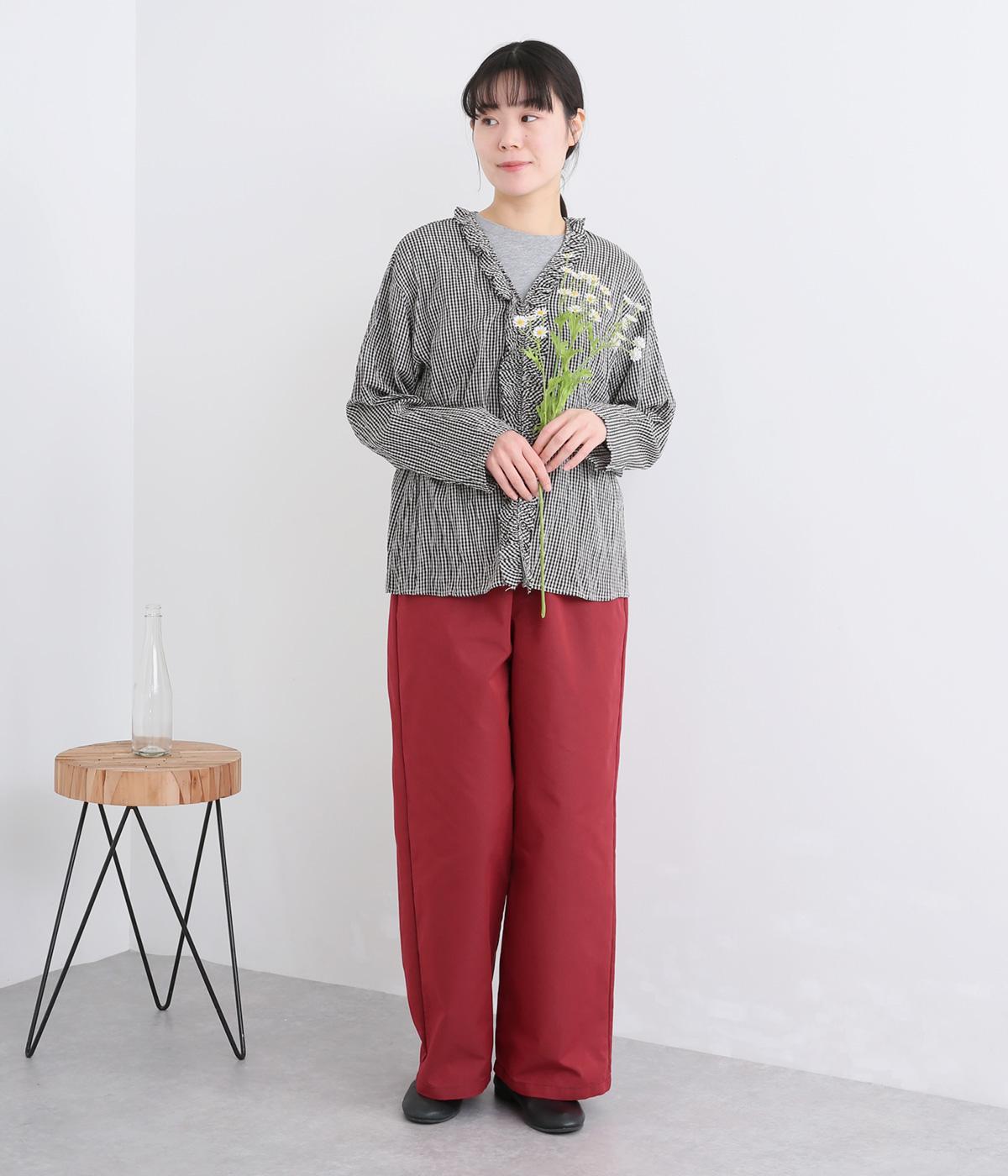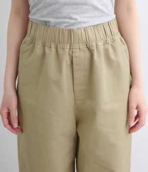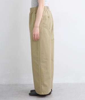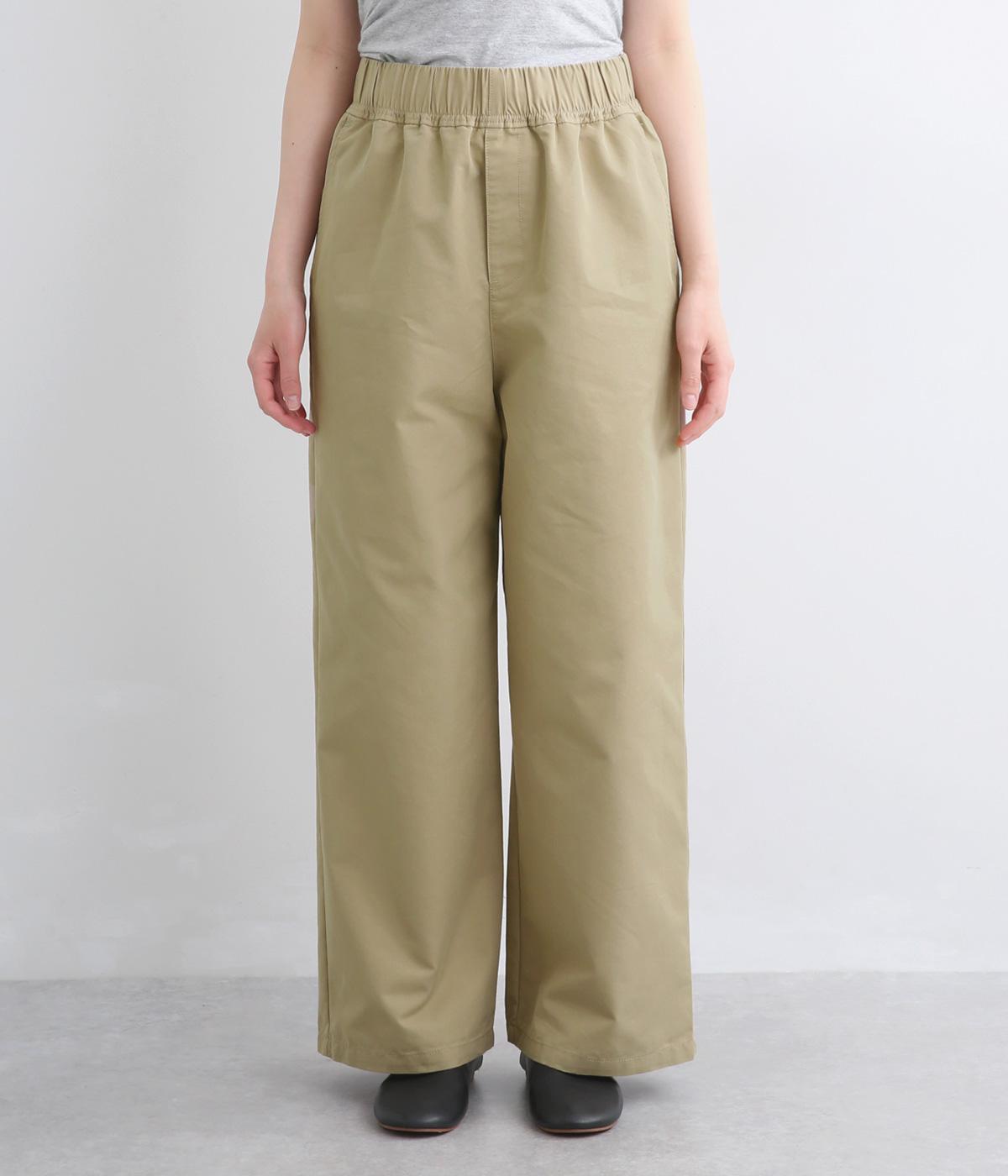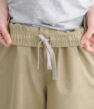 体のラインを拾いにくいややワイド幅でストレートシルエット。ハリのある生地がシルエットをきれいにキープします。ウエストは総ゴム仕様でリラックス感のある穿き心地に。サイズ調節できる紐を配しています。