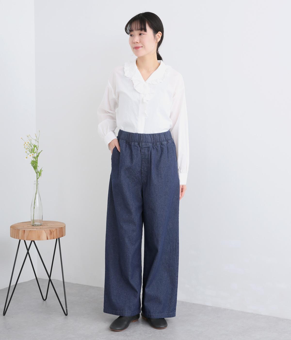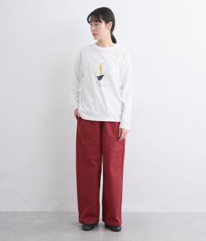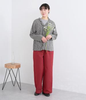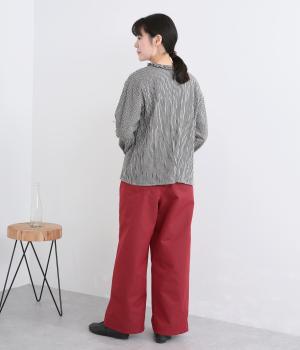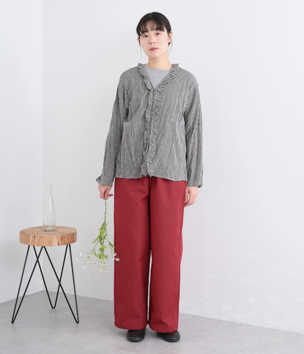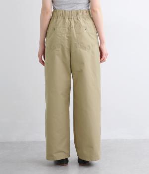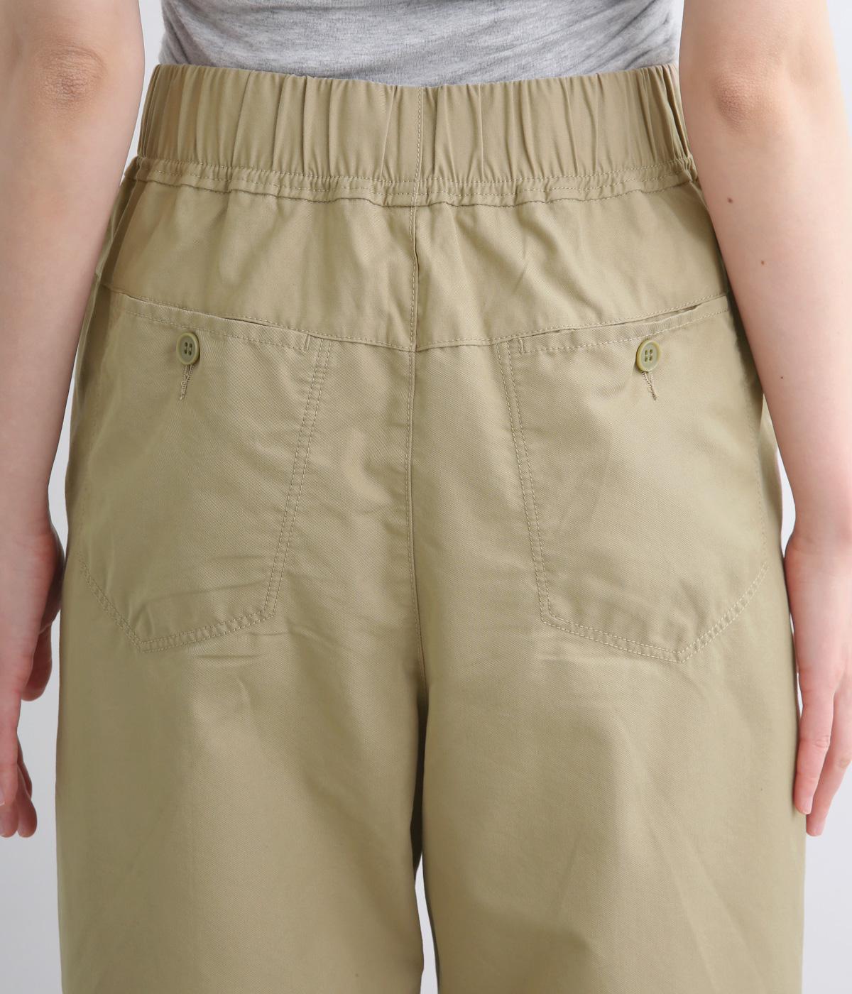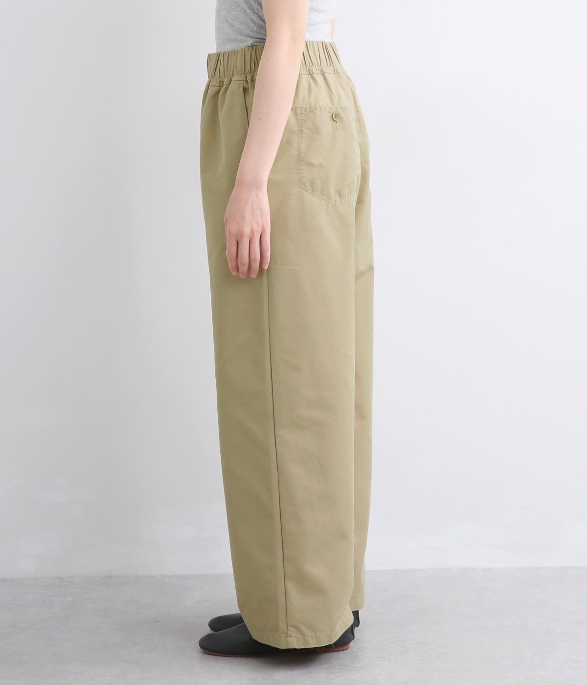 体のラインを拾いにくいややワイド幅でストレートシルエット。ハリのある生地がシルエットをきれいにキープします。ウエストは総ゴム仕様でリラックス感のある穿き心地に。サイズ調節できる紐を配しています。