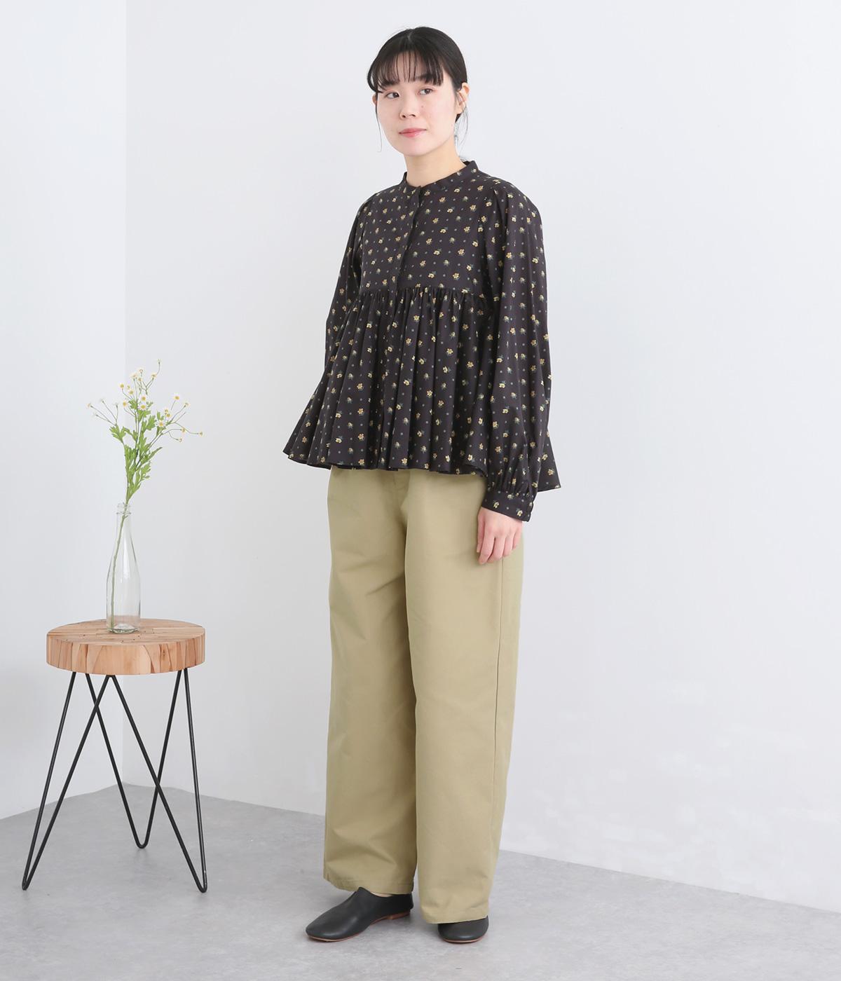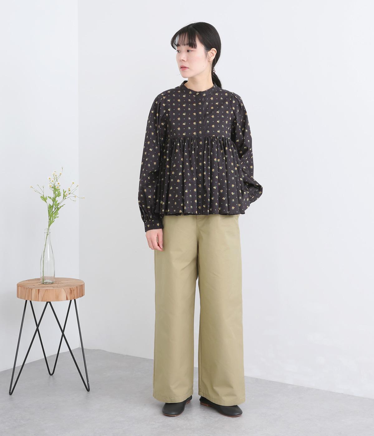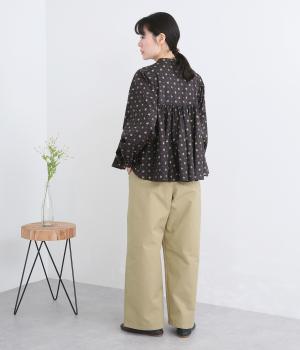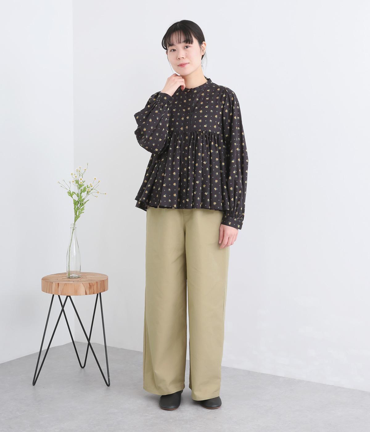 体のラインを拾いにくいややワイド幅でストレートシルエット。ハリのある生地がシルエットをきれいにキープします。ウエストは総ゴム仕様でリラックス感のある穿き心地に。サイズ調節できる紐を配しています。