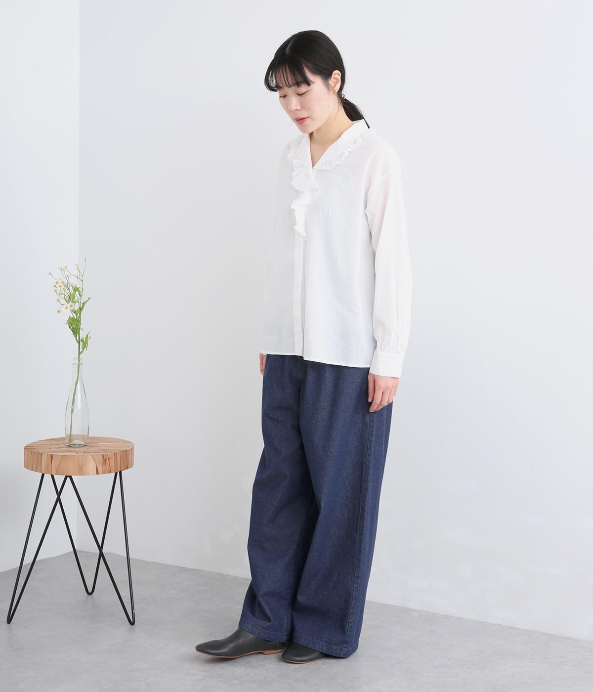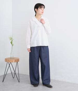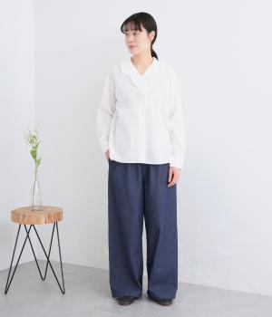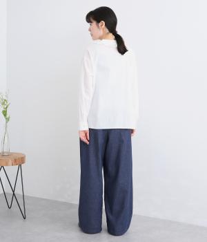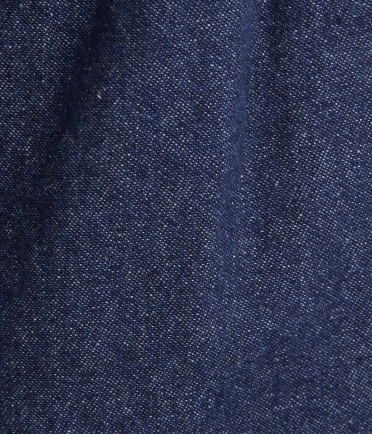 インディゴ染めのデニムと、ベージュとレッドはポリエステル混でほのかにツヤがある生地です。やわらかさとハリを両立した混紡素材で、ナチュラルな雰囲気が魅力です。