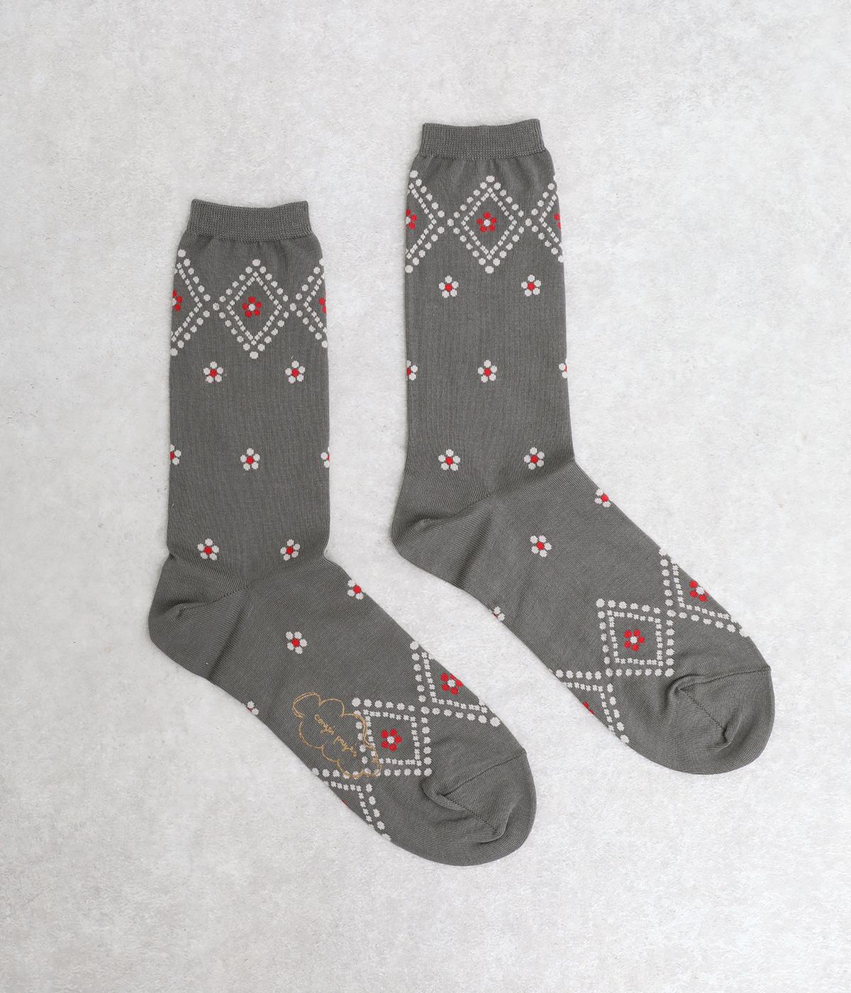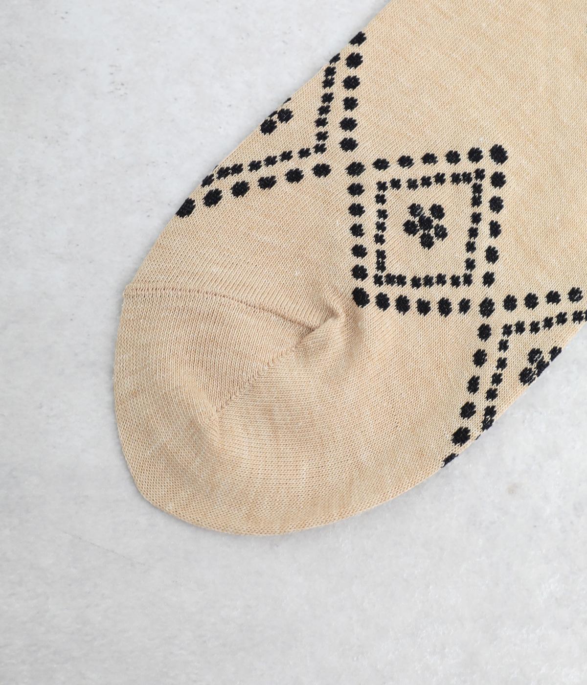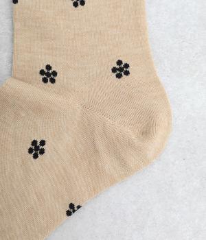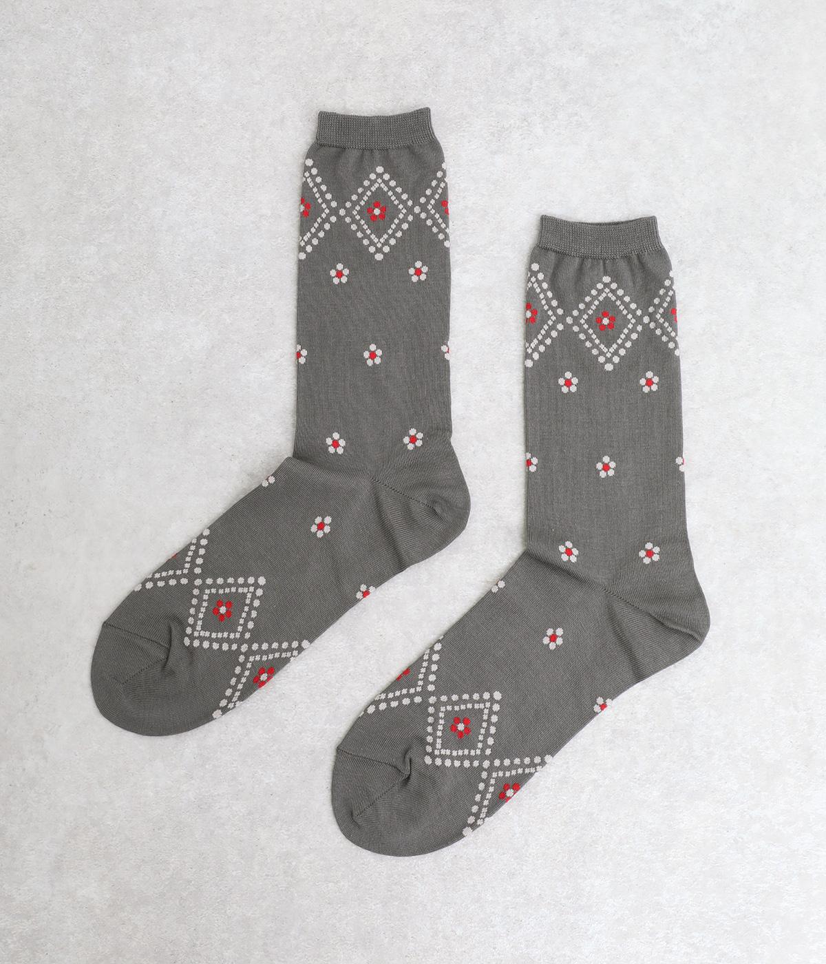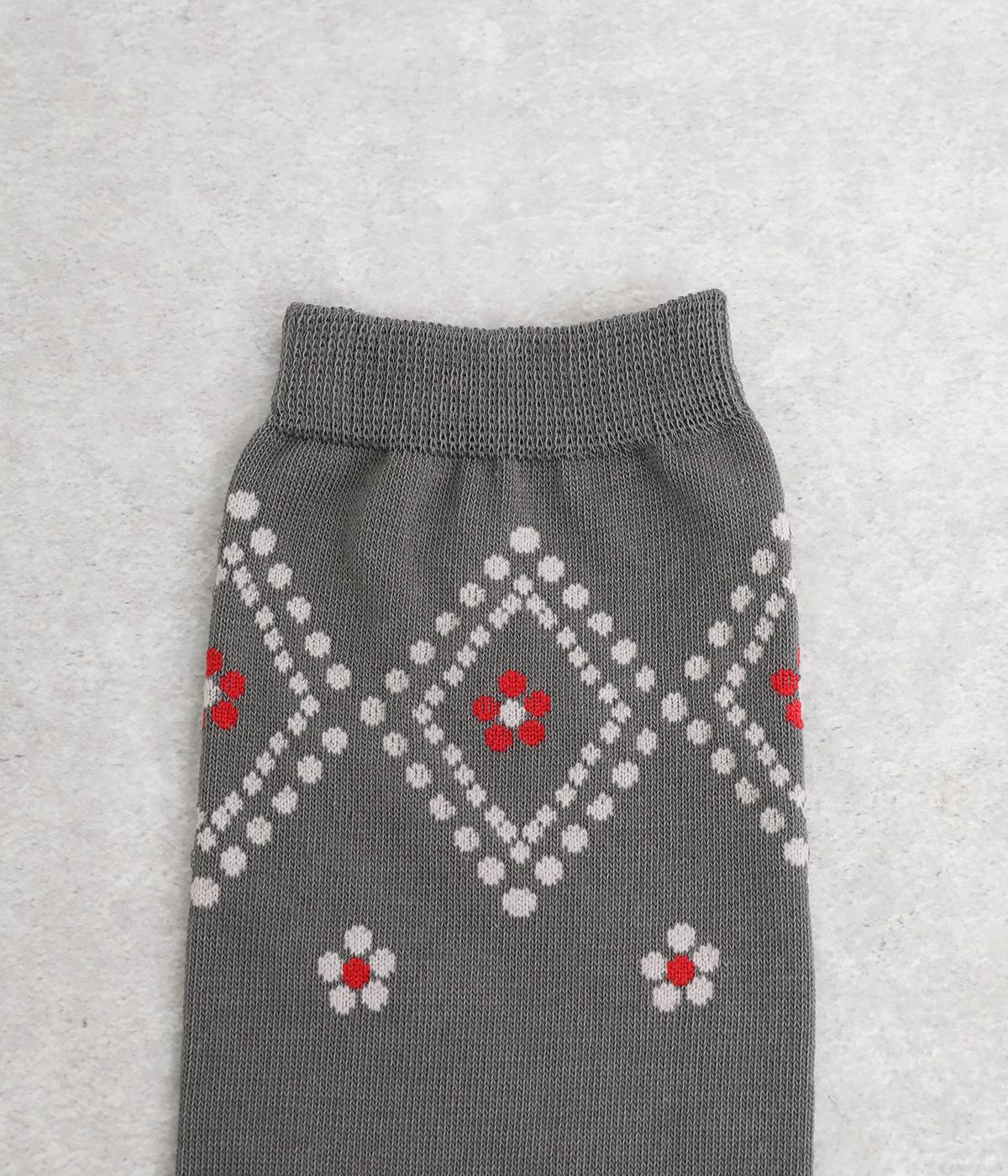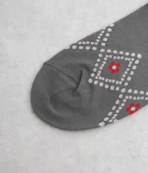 ドットで格子柄をあしらったソックス。お花のモチーフもちりばめて、エレガントな印象を与える一足に仕上げています。カジュアルなスニーカーからトラッドなレザーシューズまで、幅広い靴と相性◎。