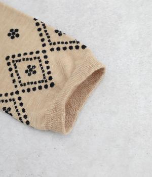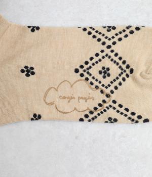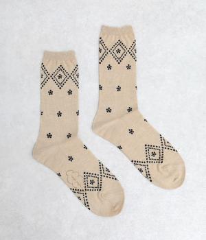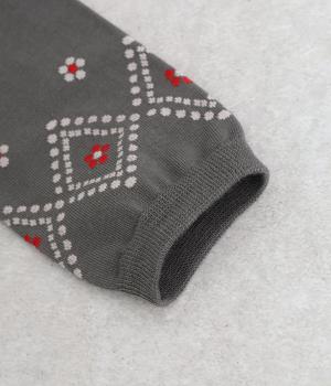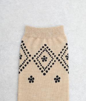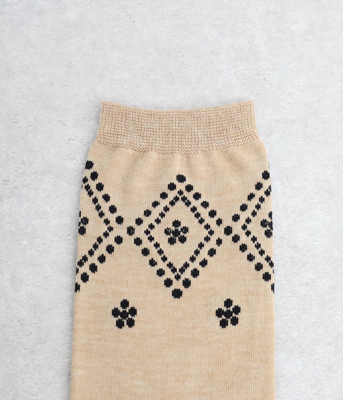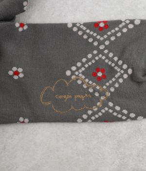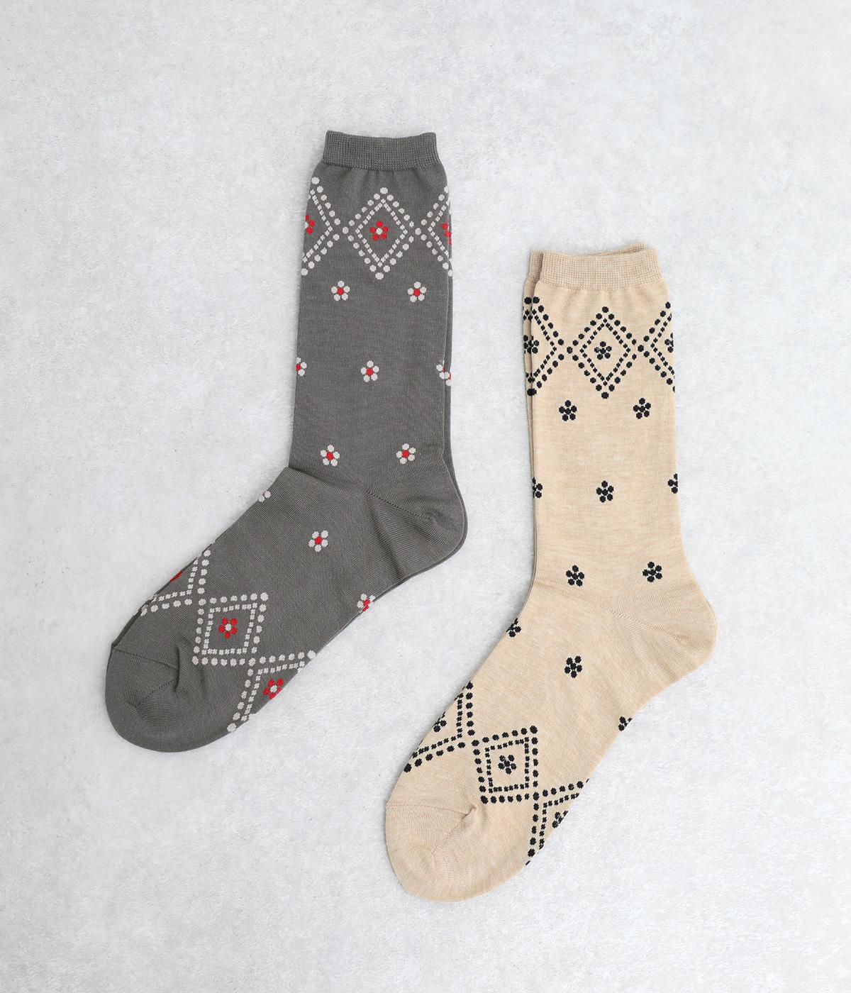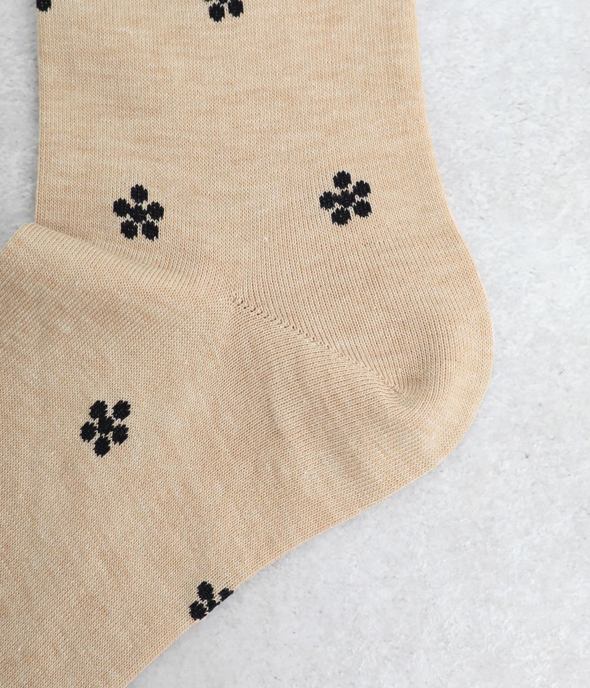 ドットで格子柄をあしらったソックス。お花のモチーフもちりばめて、エレガントな印象を与える一足に仕上げています。カジュアルなスニーカーからトラッドなレザーシューズまで、幅広い靴と相性◎。